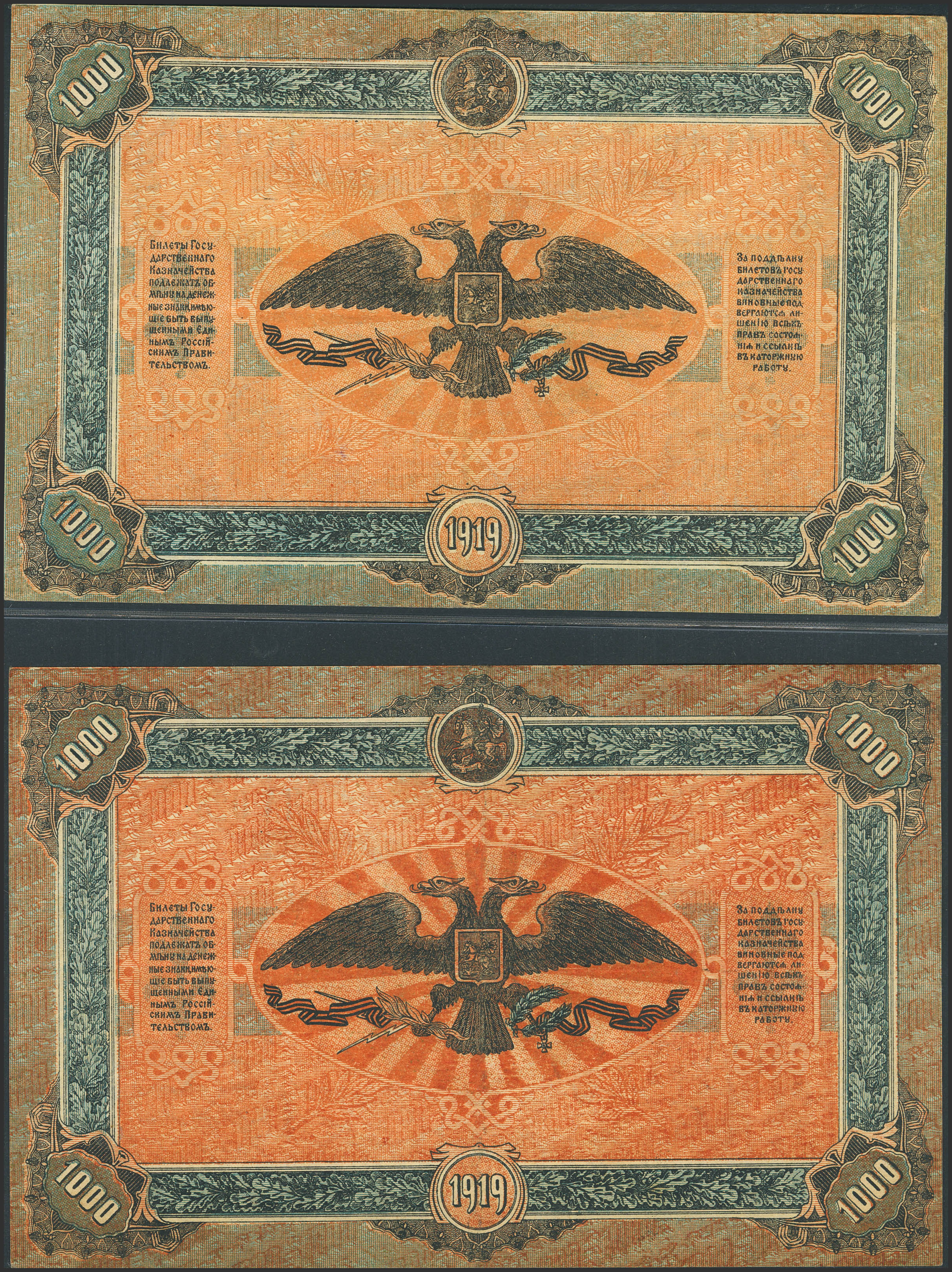 RUSSIA-SOUTH. Lot of 2 notes of 1000 Rubley. 1919. State Treasury of High Command of the Armed Forces in South Russia. With watermark. (Pick: S424b). More than Very Fine.