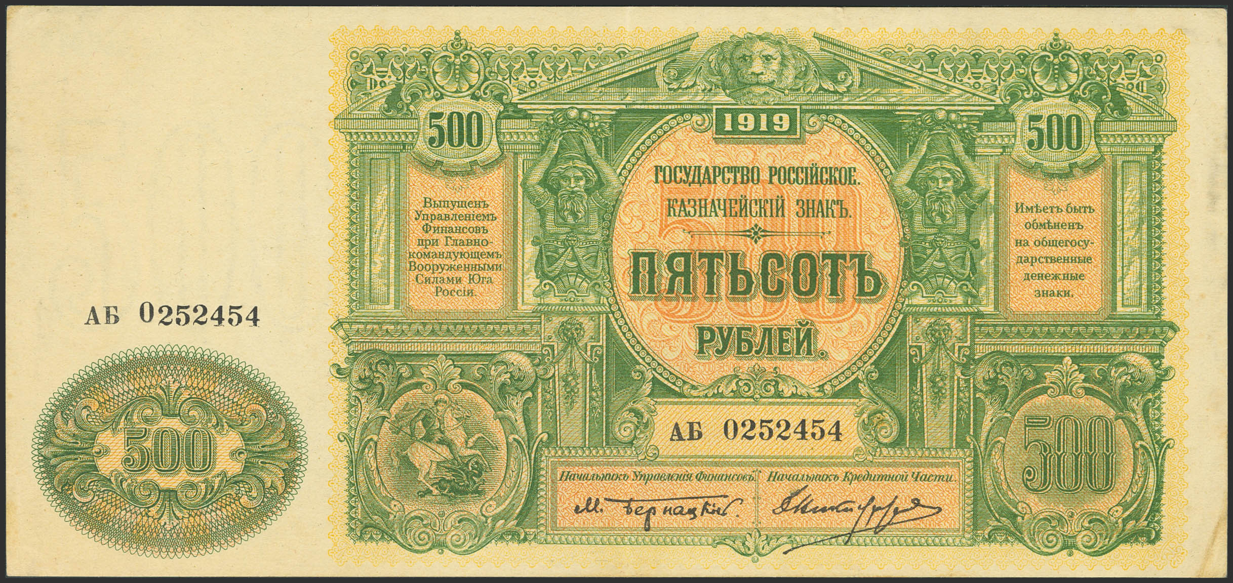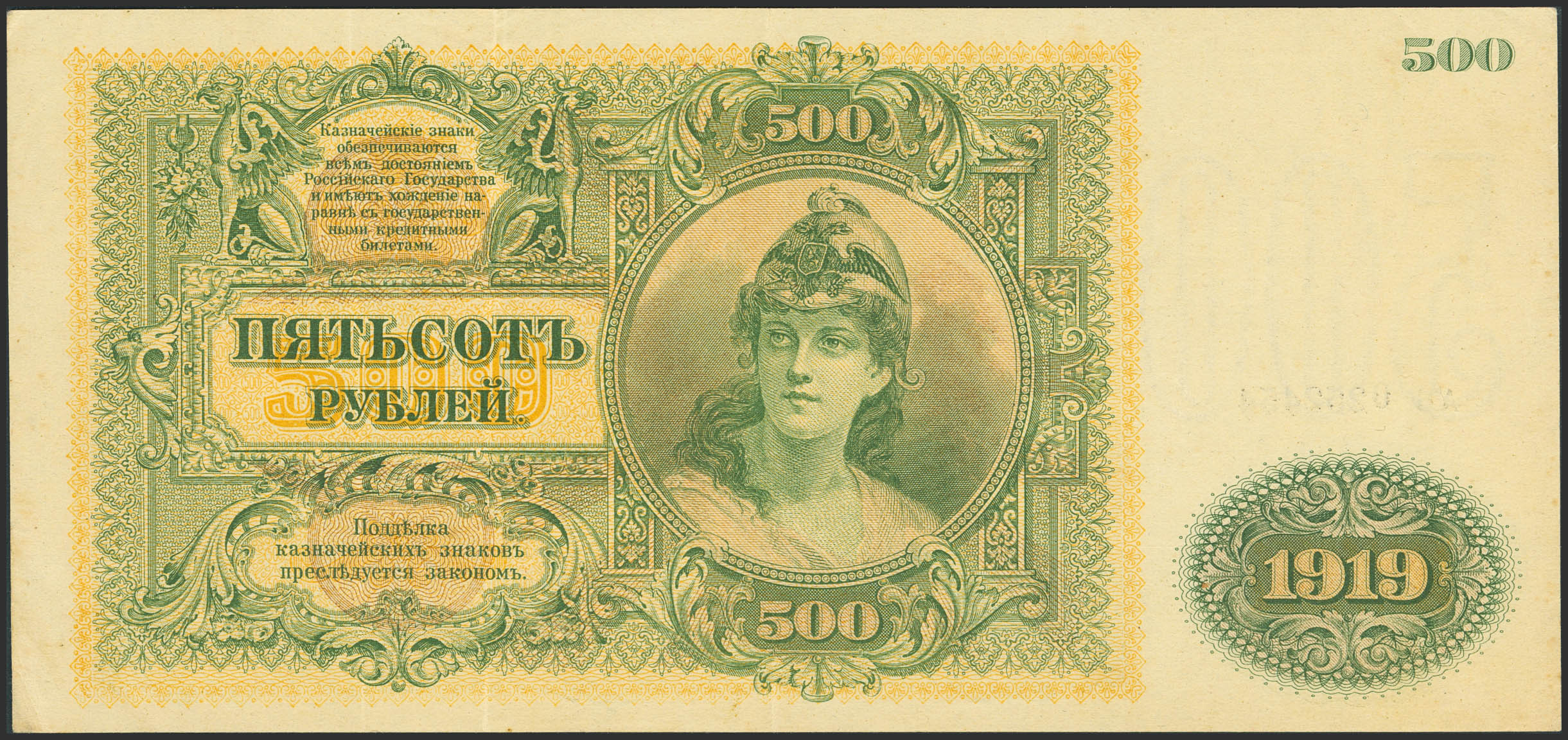 RUSSIA-SOUTH. 500 Rubley. 1919. Gosudarstvo Rossiskoye. (Pick: S440a). More than Extremely Fine.