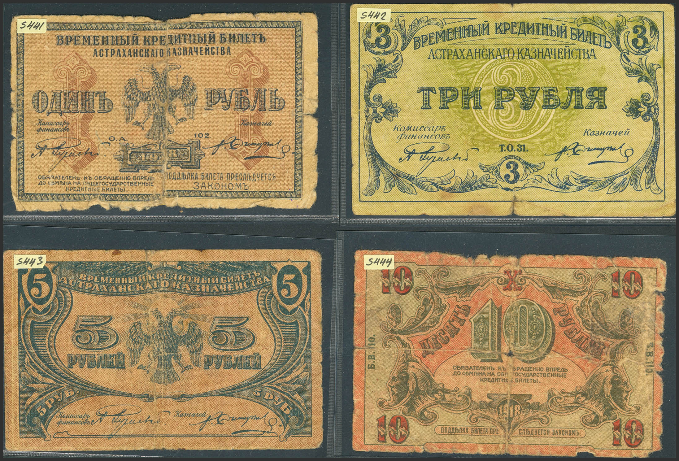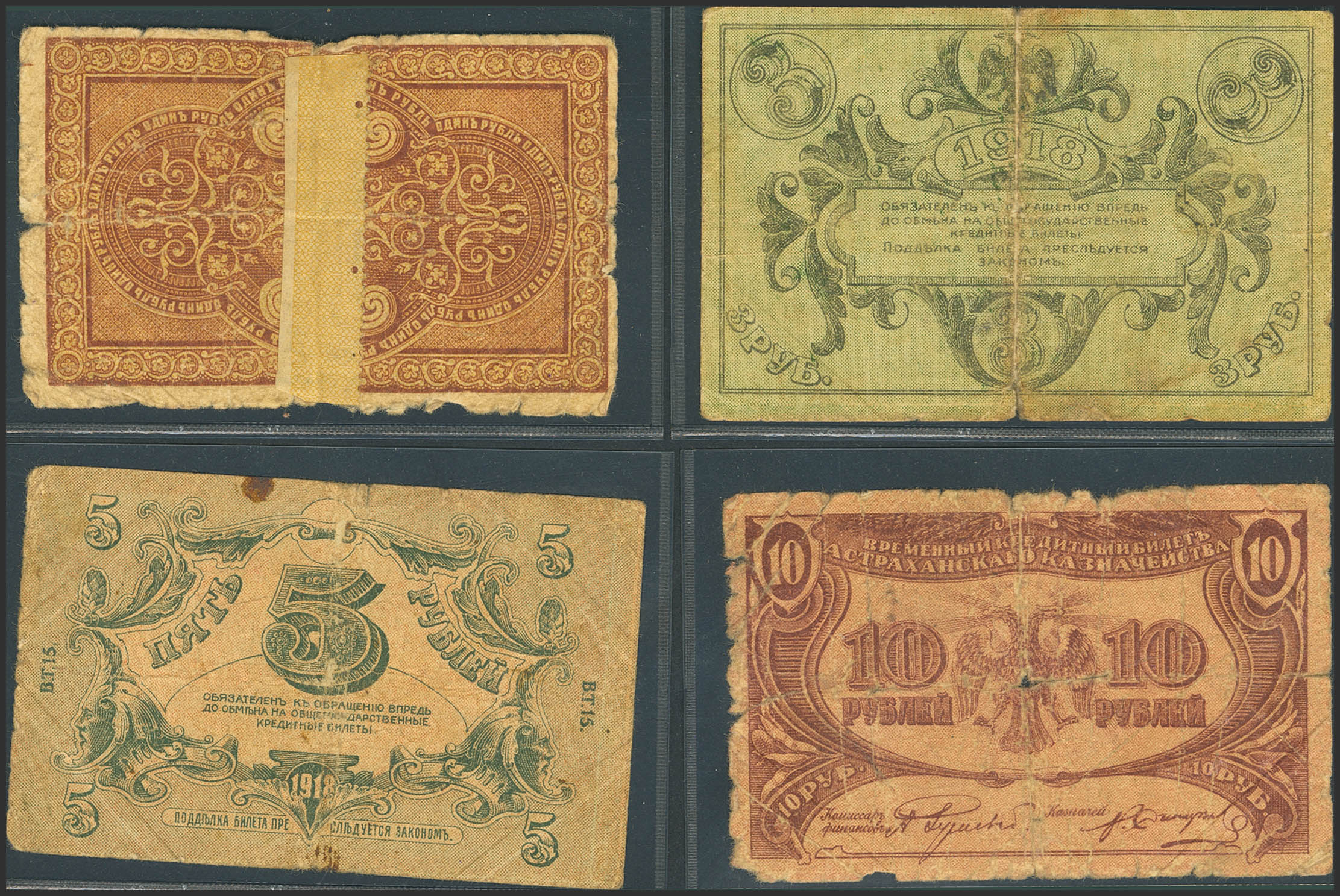 RUSSIA-SOUTH. Lot of 4 notes from 1 at 10 Rubles. 1918. Astrakhan Treasury. (Pick: S441, S442, S443, S444). One of them has tape on back, tears, pinholes. Very Good / Very Fine.