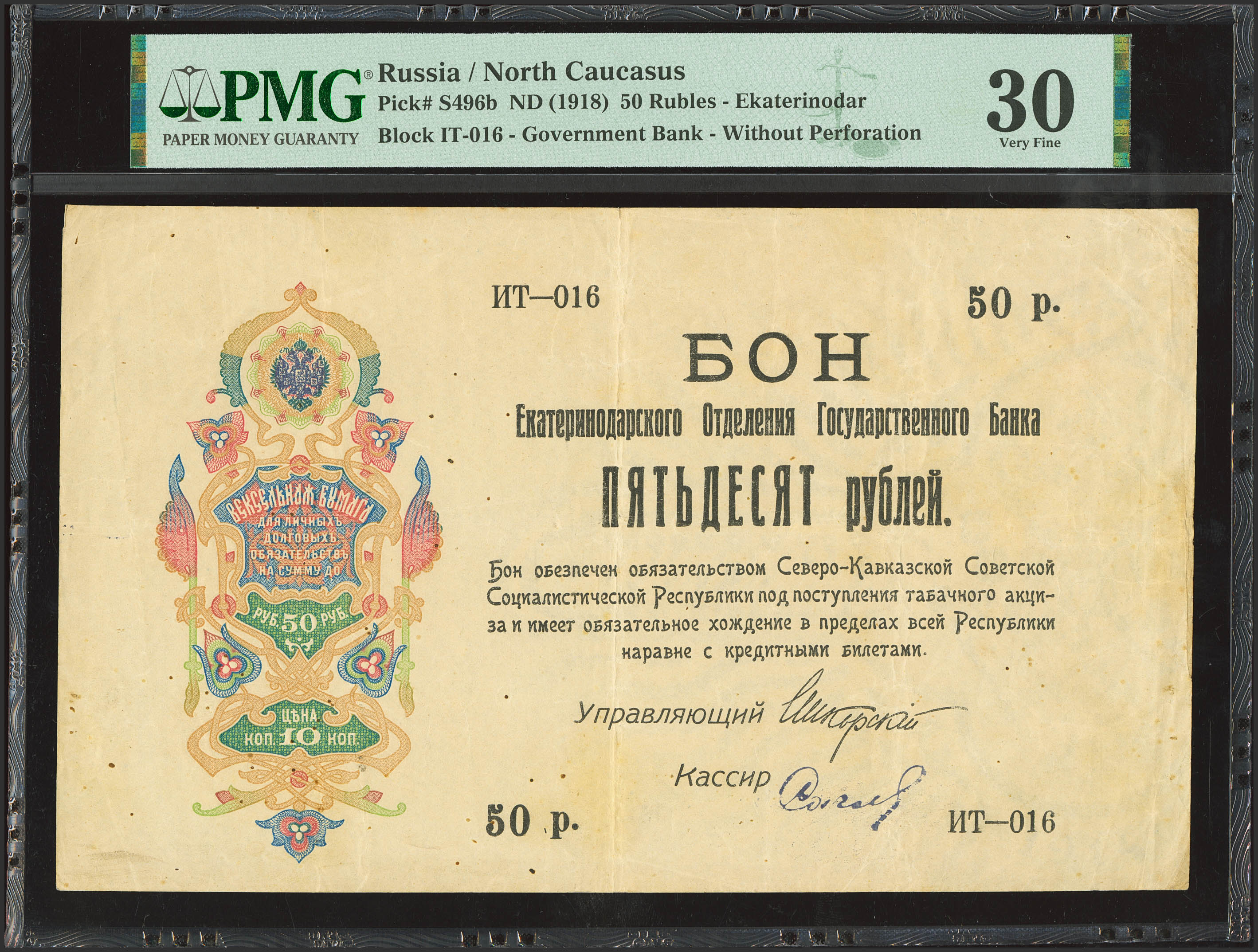 RUSSIA-NORTH CAUCASUS. 50 Rubley. (1918ca). State Bank, Ekaterinodar. (Pick: S496b). PMG30 (foreign substance).