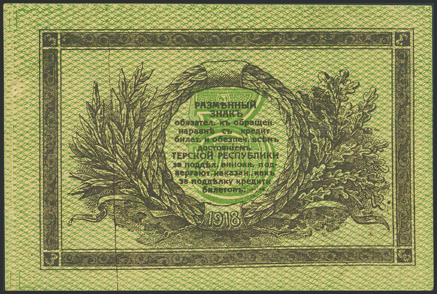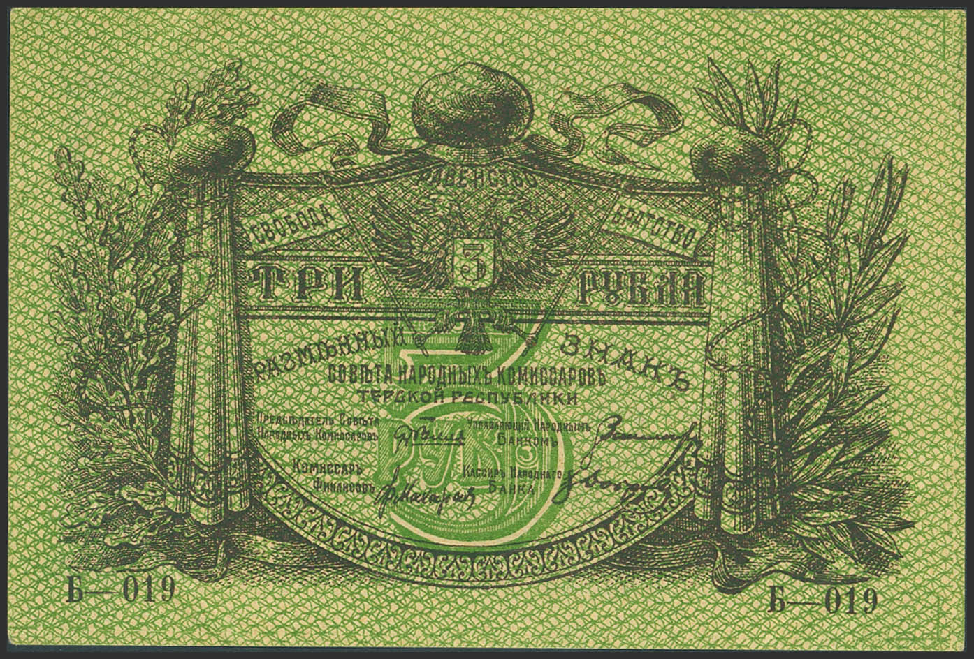 RUSSIA-NORTH CAUCASUS. 3 Rubles. 1918. Soviet Peoples Commissariat of the Terek Republic. (Pick: S530). More than Extremely Fine.