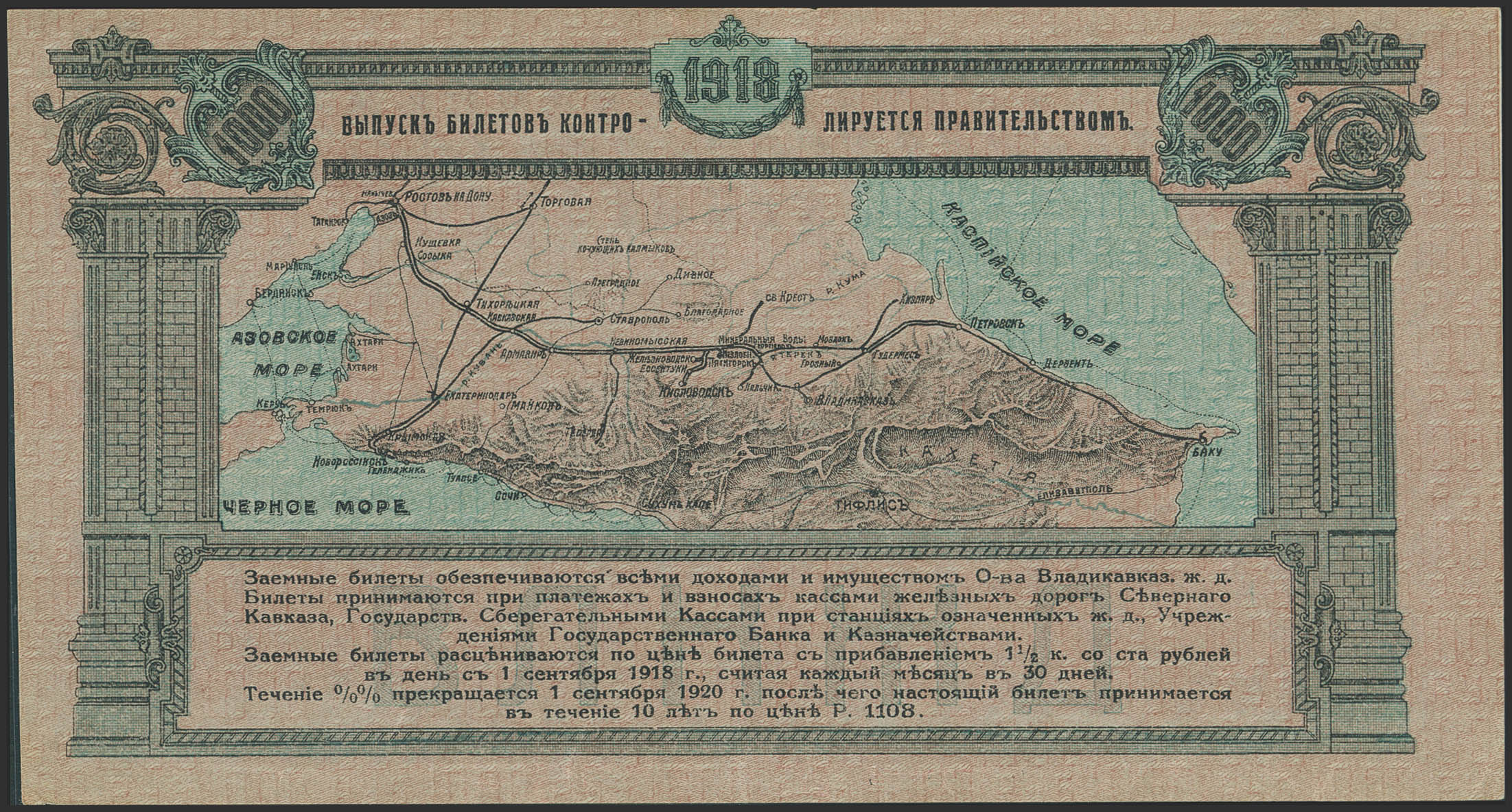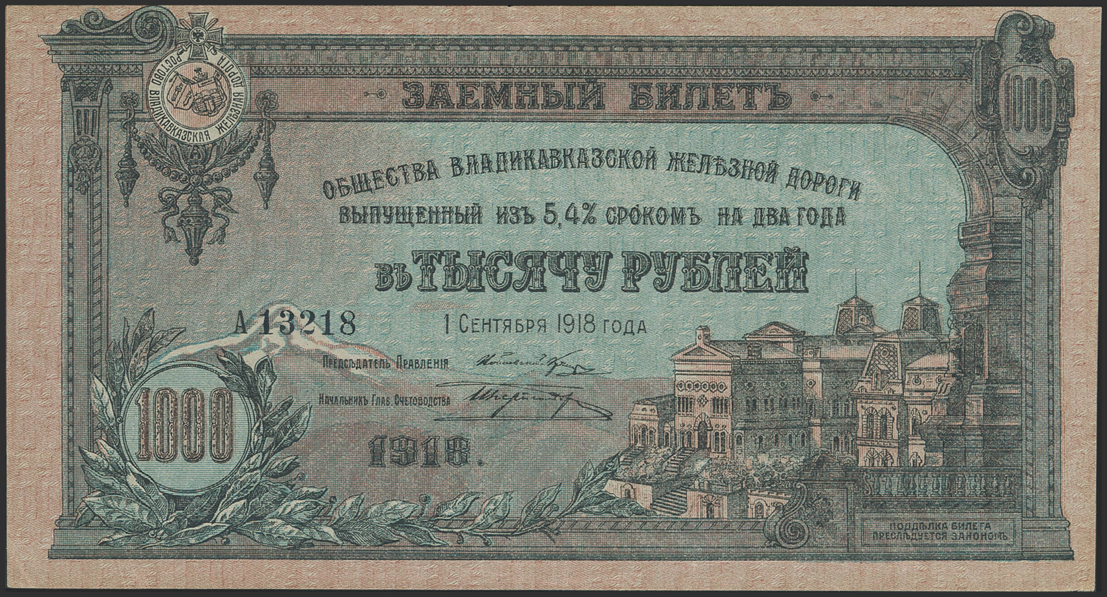RUSSIA-NORTH CAUCASUS. 1000 Rubley. 1 September 1918. Vladikavkaz Railroad Company. Rostov-na-Donu. (Pick: S596). About Uncirculated.