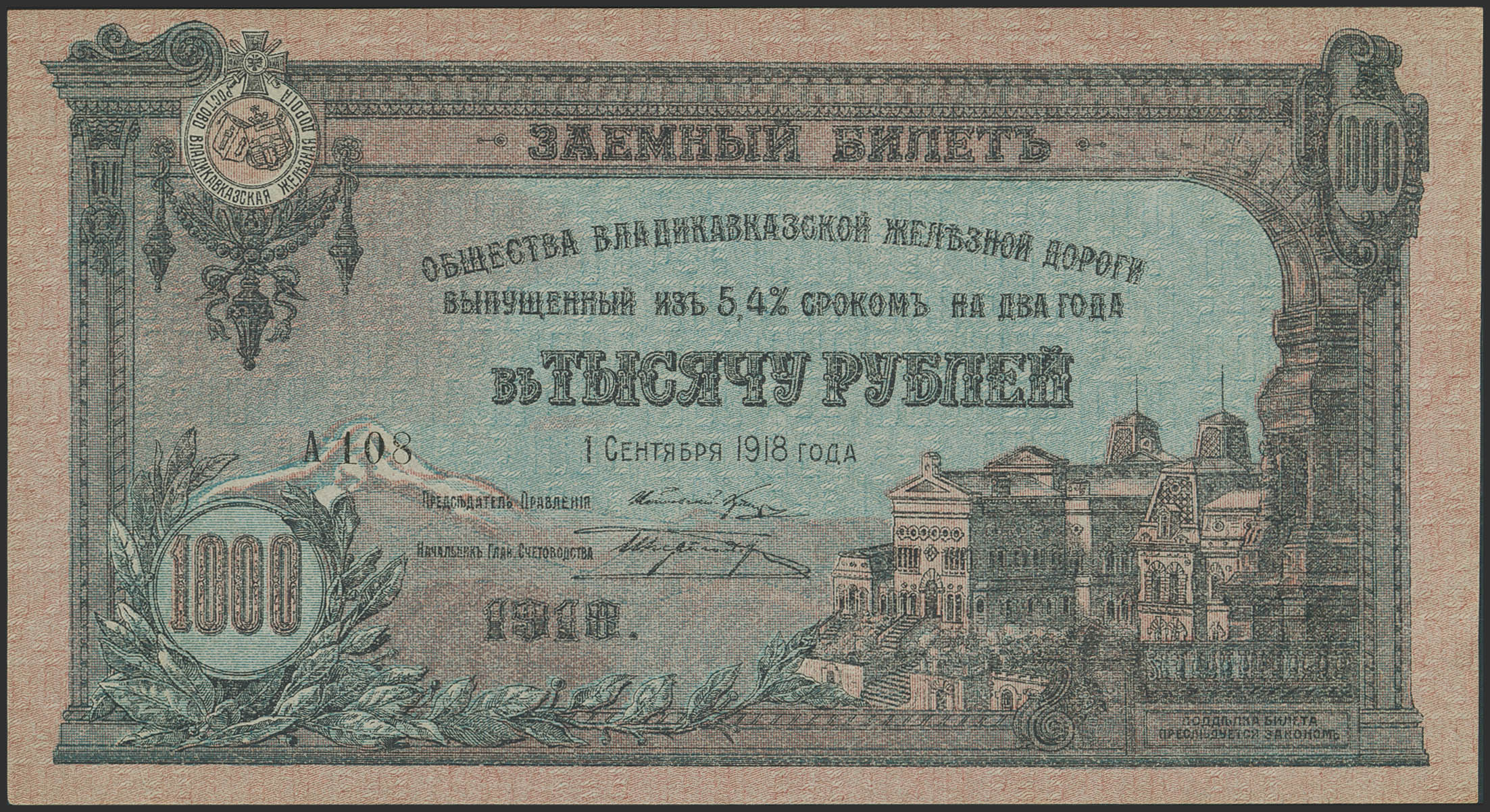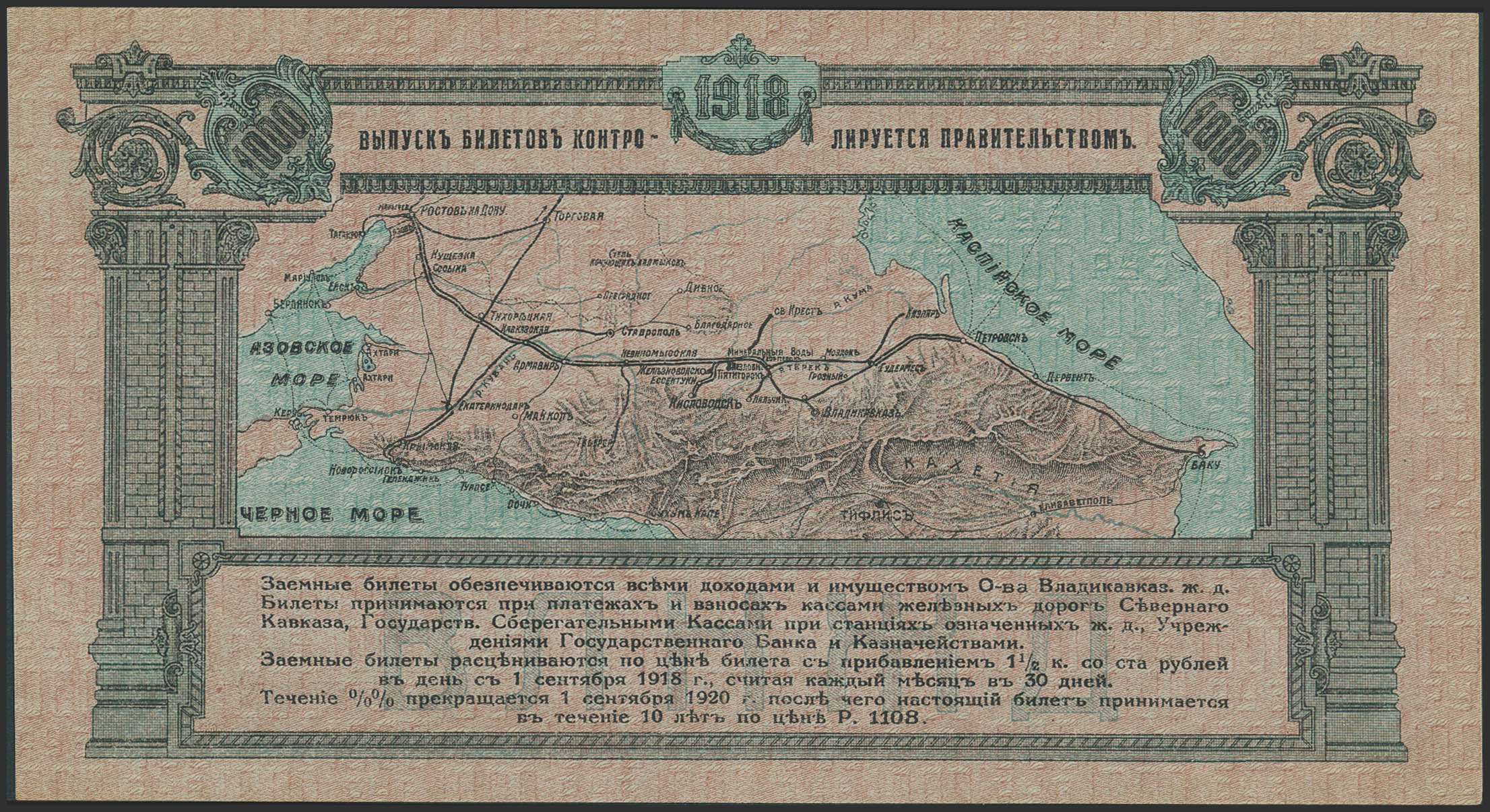 RUSSIA-NORTH CAUCASUS. 1000 Rubley. 1 September 1918. Vladikavkaz Railroad Company. Rostov-na-Donu. (Pick: S596). About Uncirculated.