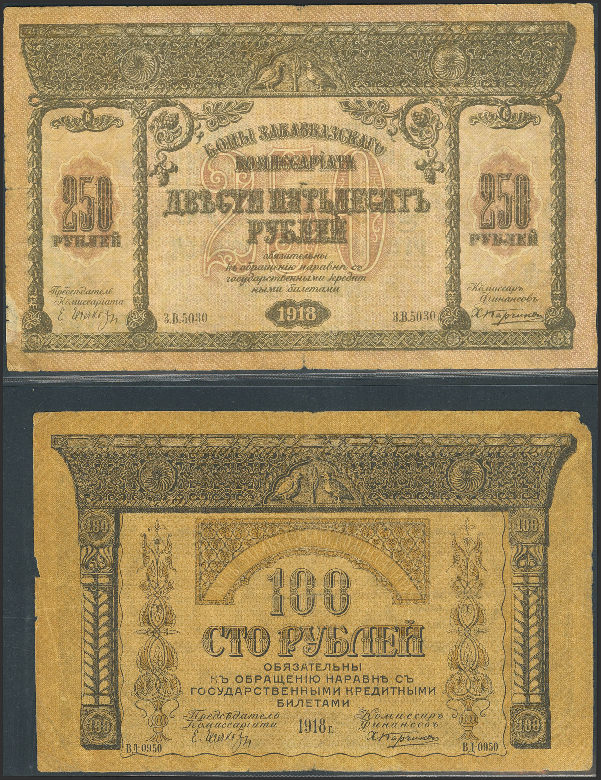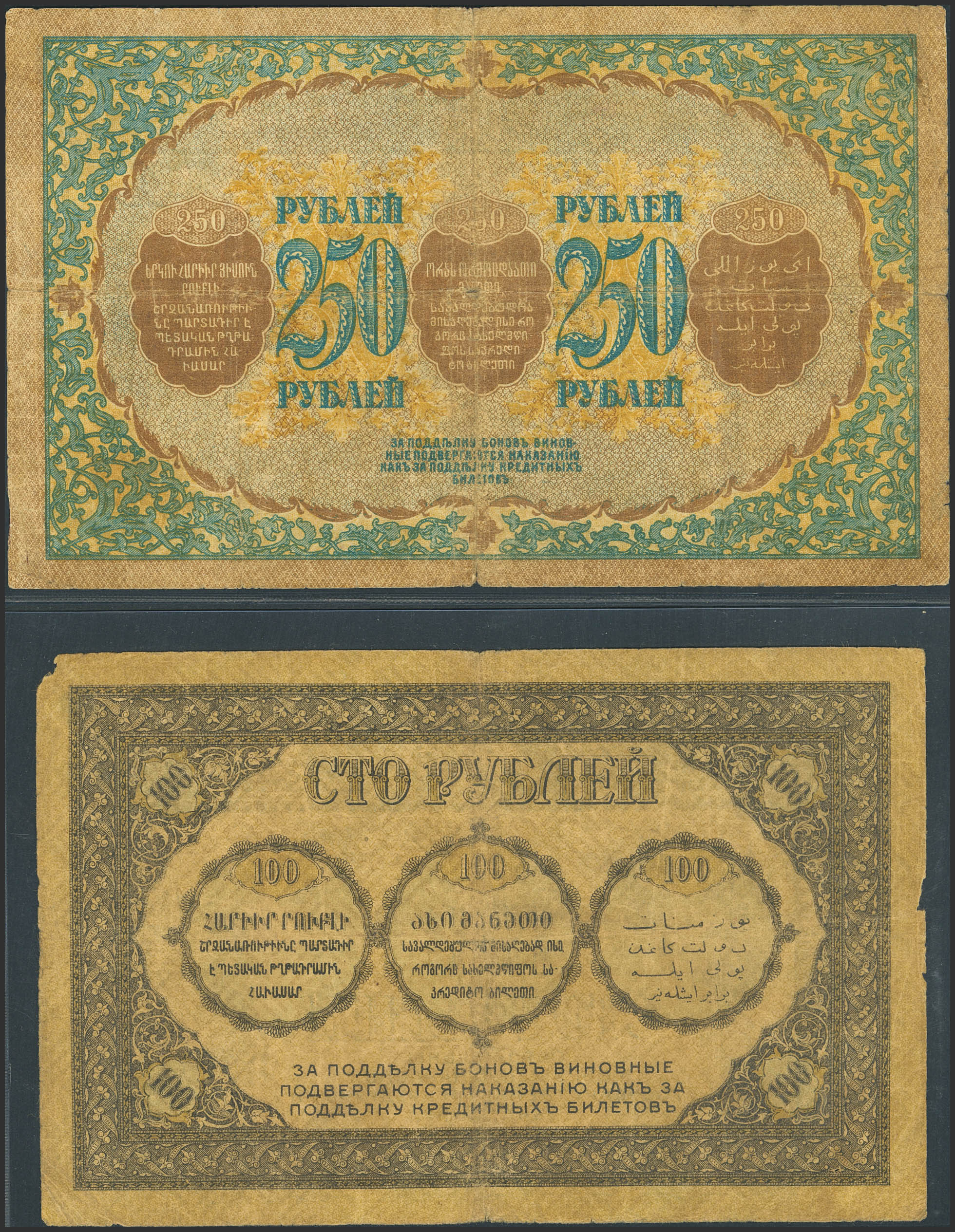 RUSSIA-TRANSCAUCASIA. Lot of 2 notes of 100 and 250 Rubley. 1918. Zakavkaskiy Kommissariat. (Pick: S606, S607). Very Fine, tears, pinholes, corner missing.