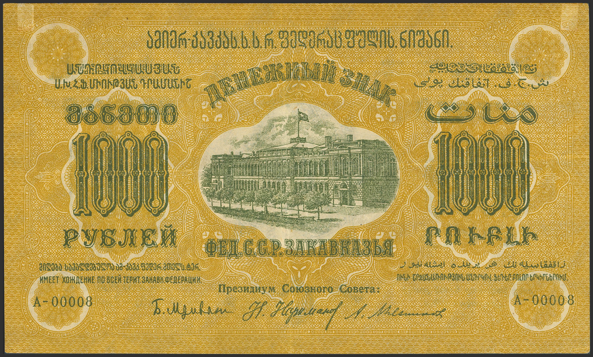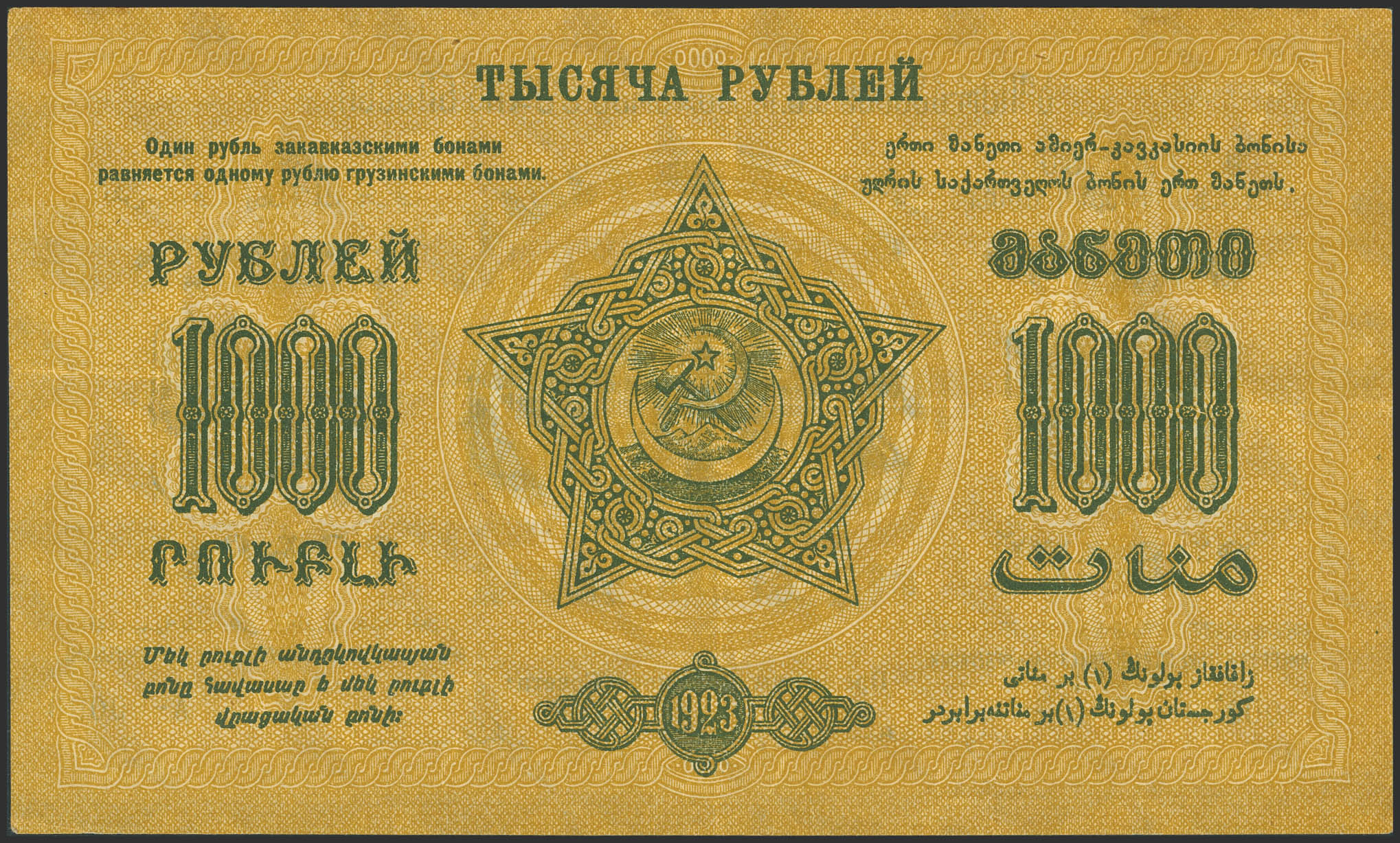 RUSSIA-TRANSCAUCASIA. 1000 Rubley. 1923. Federation of Socialist Soviet Republics of Transcaucasia. (Pick: S611). More than Very Fine, two of them repaired tears.