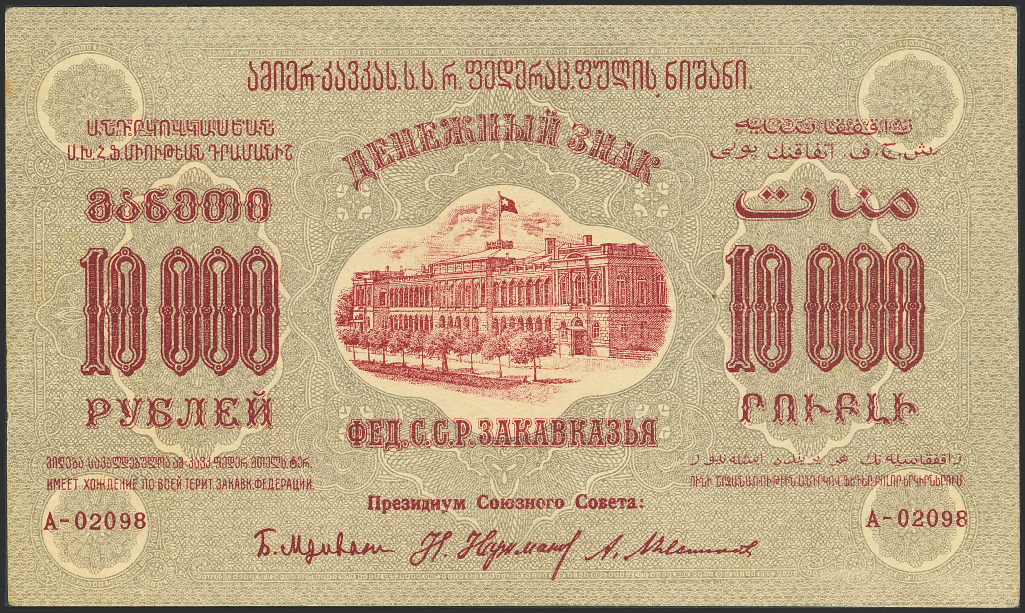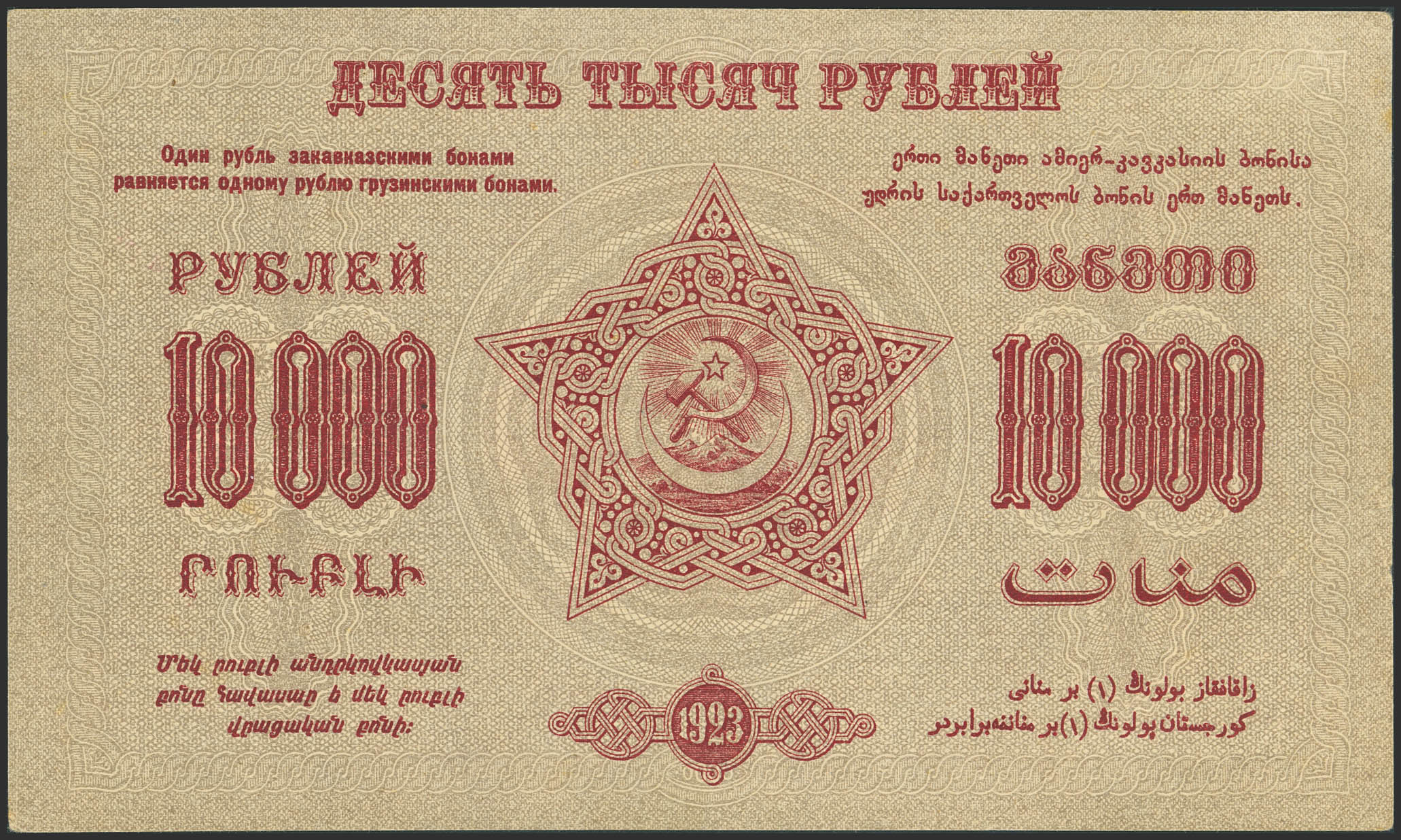 RUSSIA-TRANSCAUCASIA. 10000 Rubley. 1923. Federation of Socialist Soviet Republics of Transcaucasia. (Pick: S613). About Uncirculated.