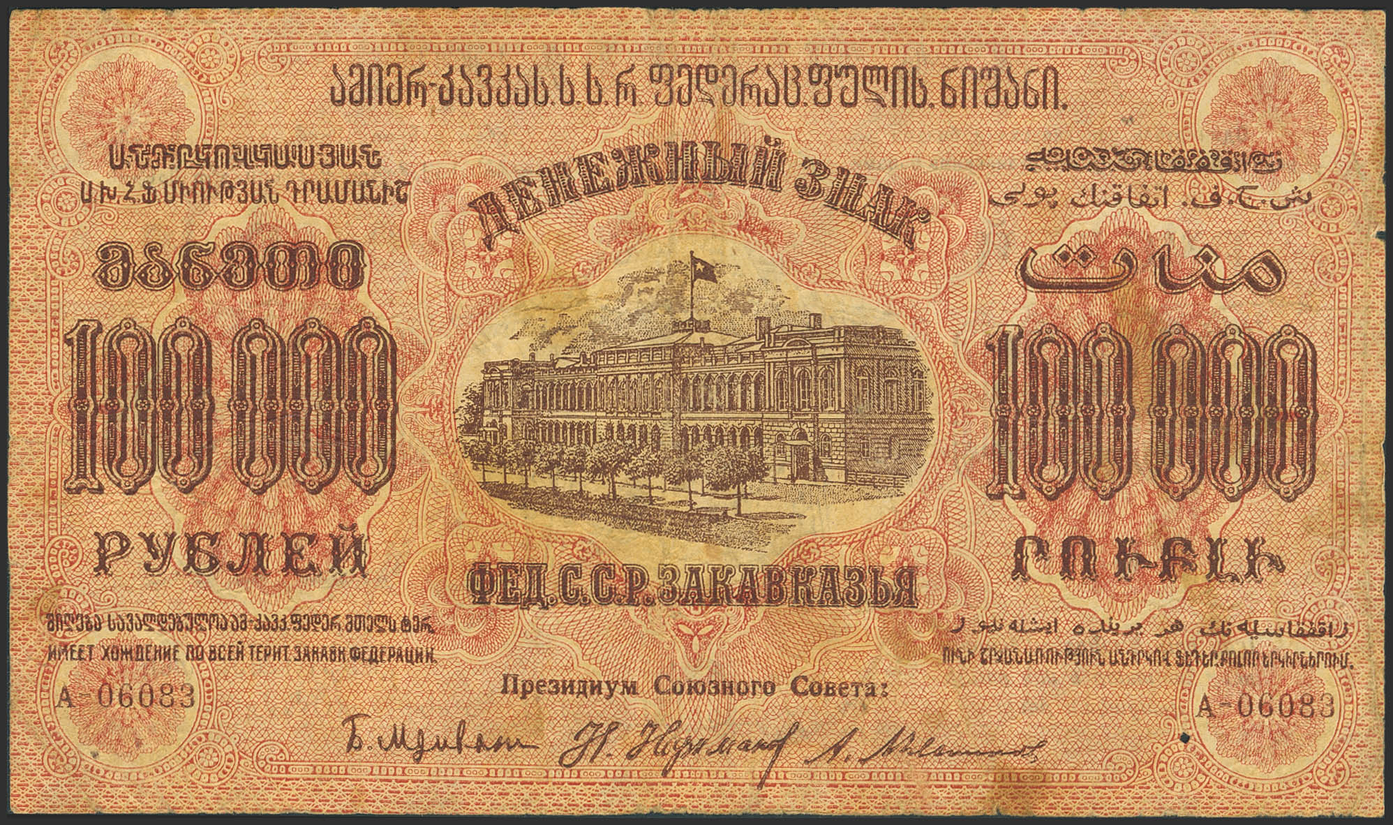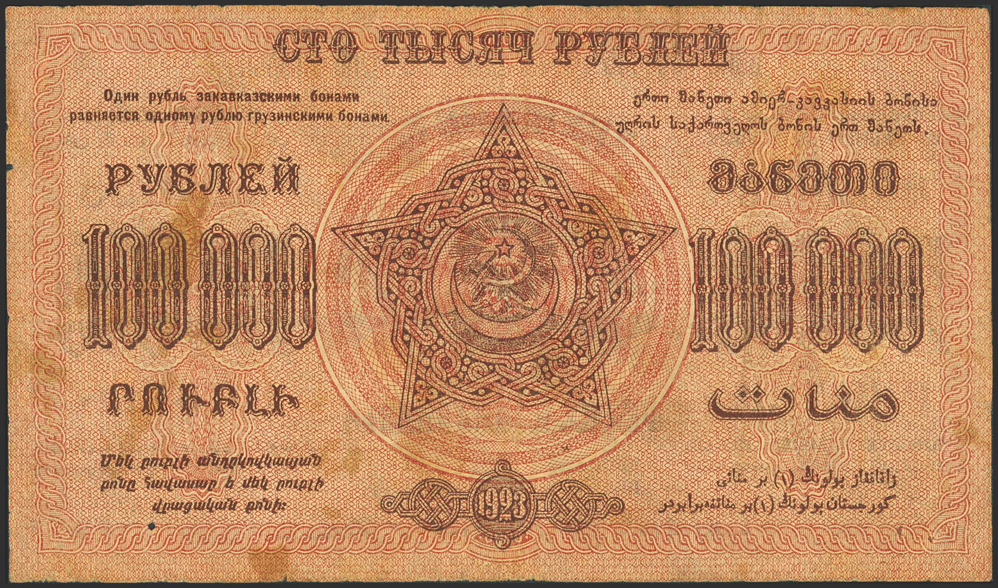 RUSSIA-TRANSCAUCASIA. 100000 Rubley. 1923. Federation of Socialist Soviet Republics of Transcaucasia. (Pick: S626). Fine / Very Fine, pinholes.