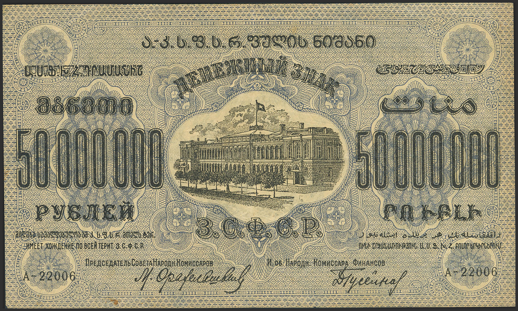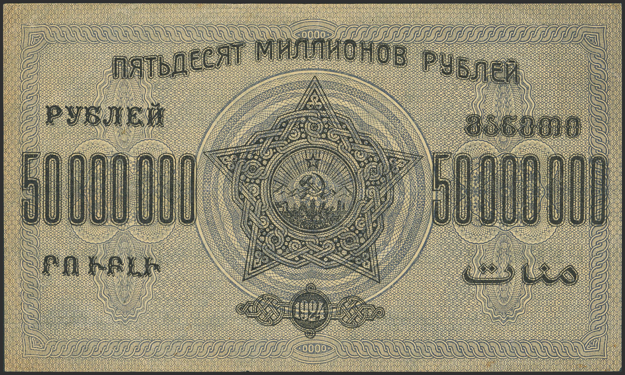 RUSSIA-TRANSCAUCASIA. 50000000 Rubley. 1924. Transcaucasian Socialist Federal Soviet Republic. (Pick: S633). Extremely Fine.