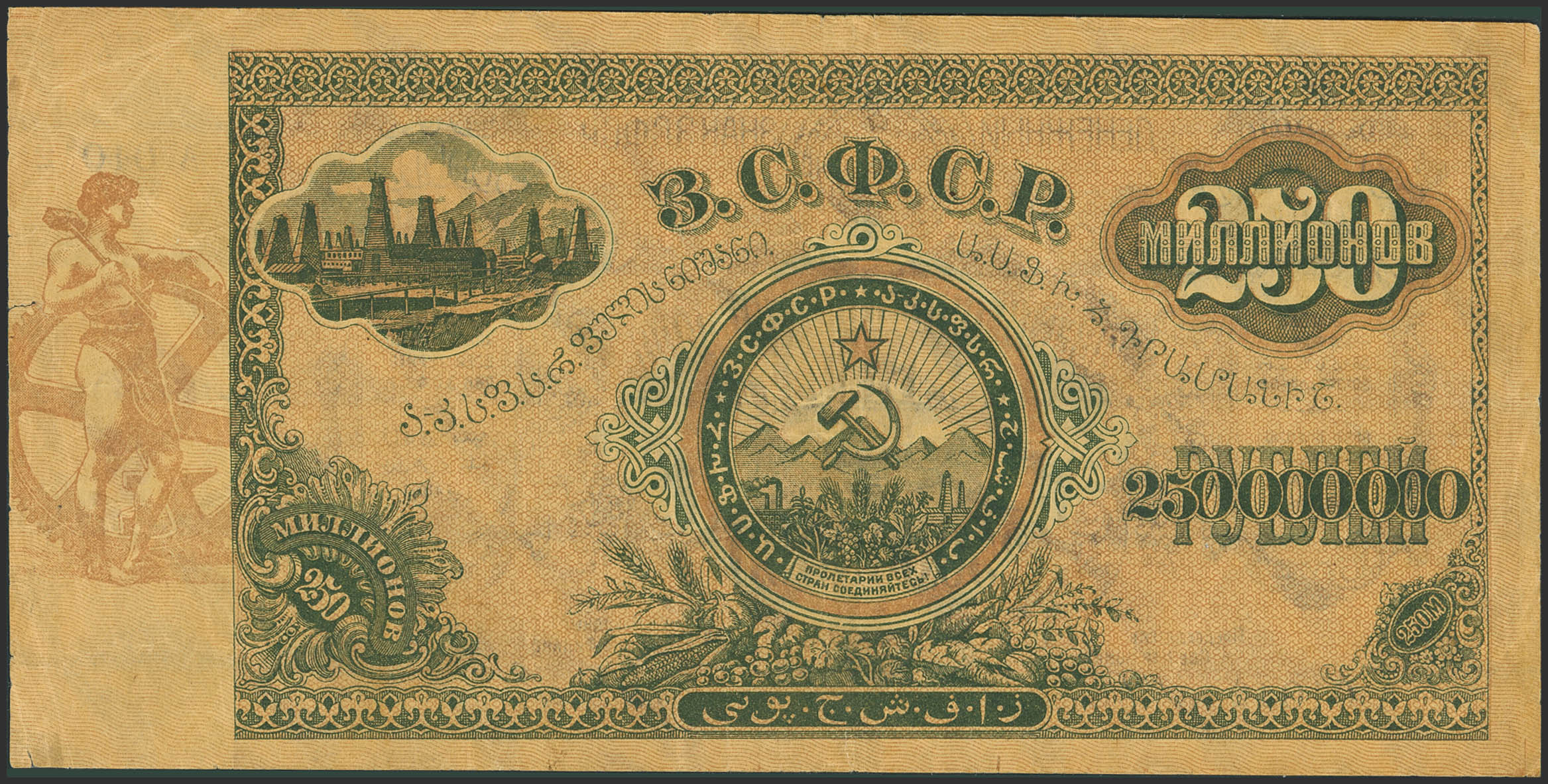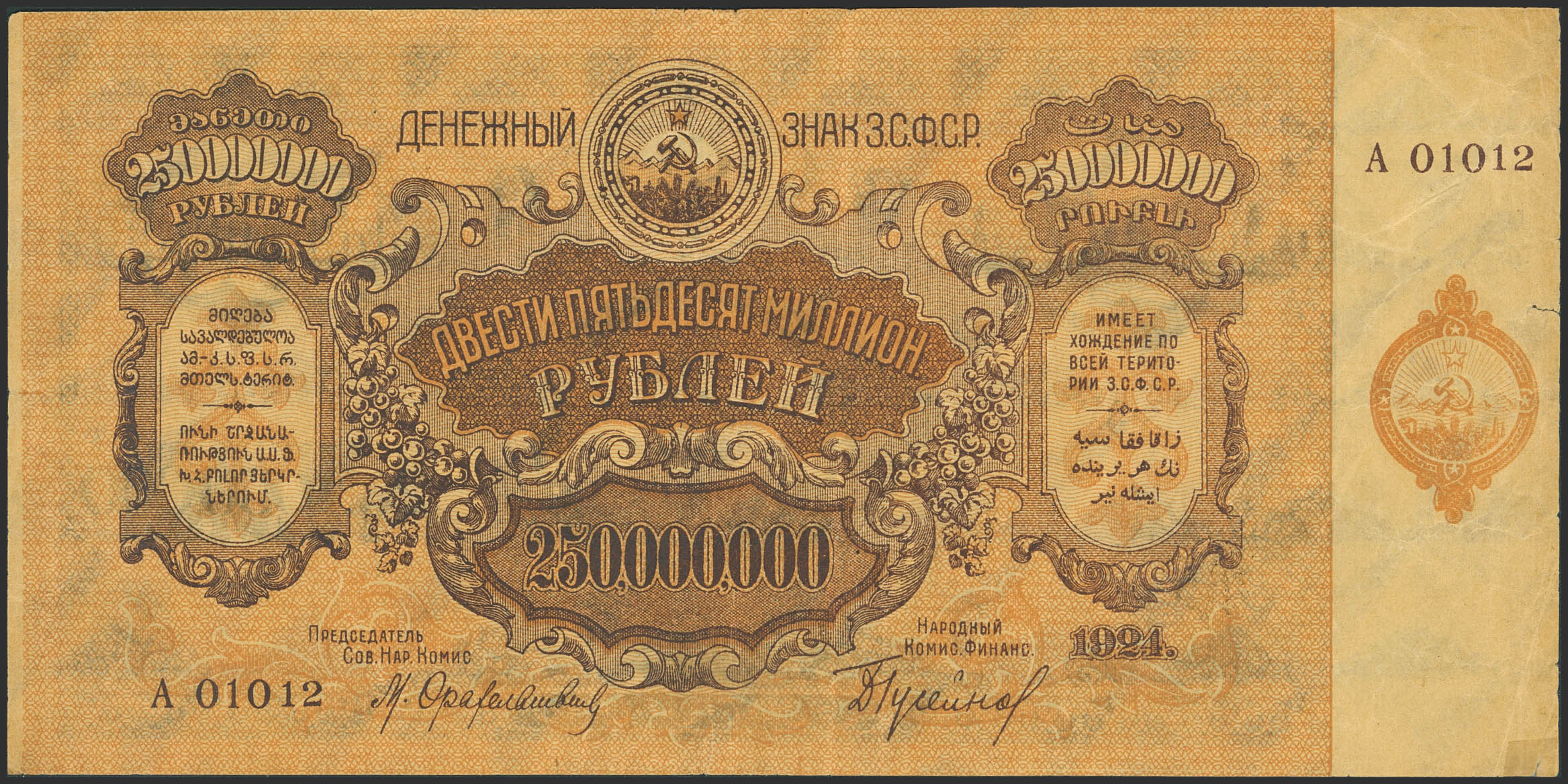 RUSSIA-TRANSCAUCASIA. 250000000 Rubley. 1924. Transcaucasian Socialist Federal Soviet Republic. (Pick: S637). Very Fine, pinhole, tears.