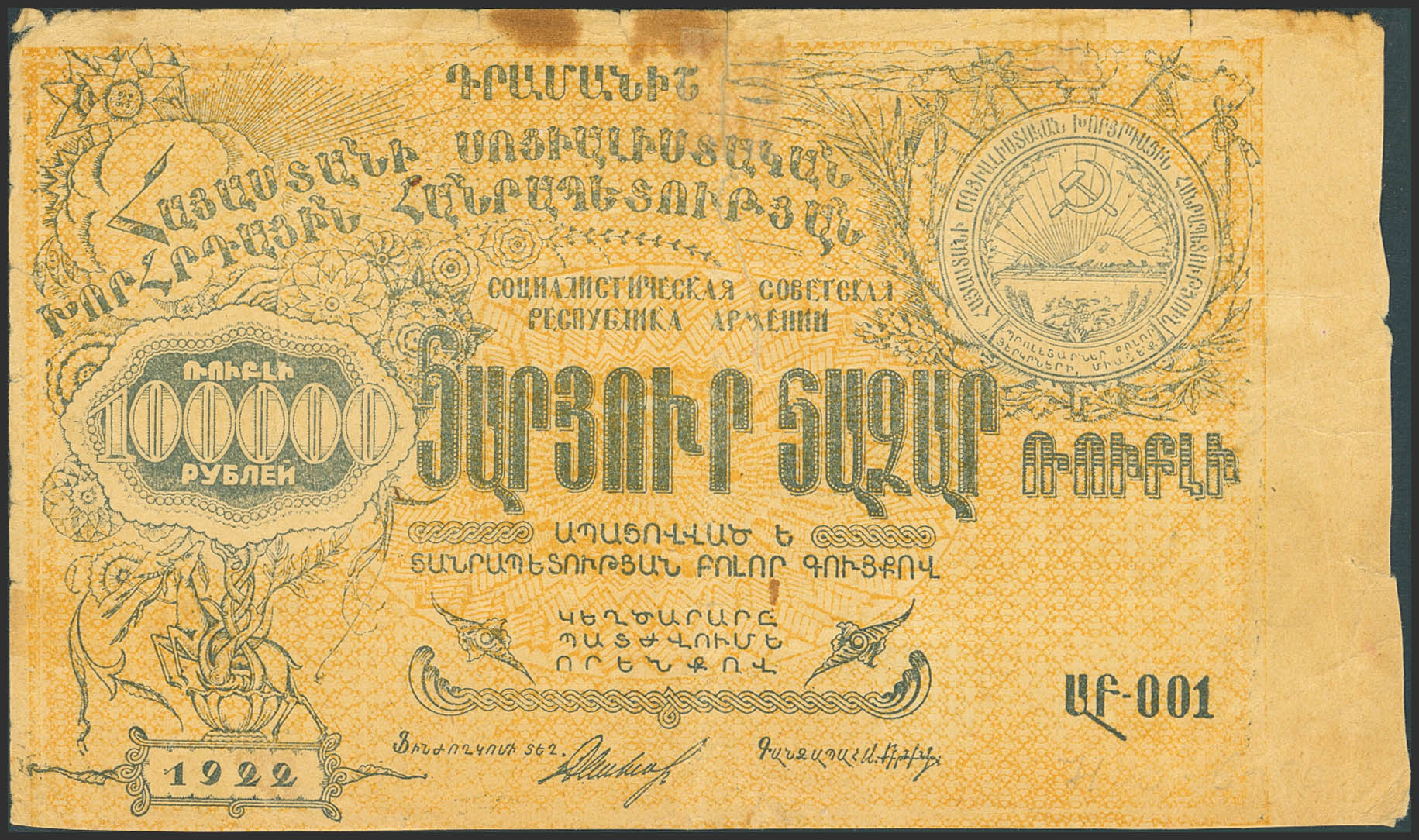 RUSSIA-TRANSCAUCASIA. 100000 Rubley. 1922. Socialist Soviet Republic of Armenia. (Pick: S682). Tears. Very Fine.