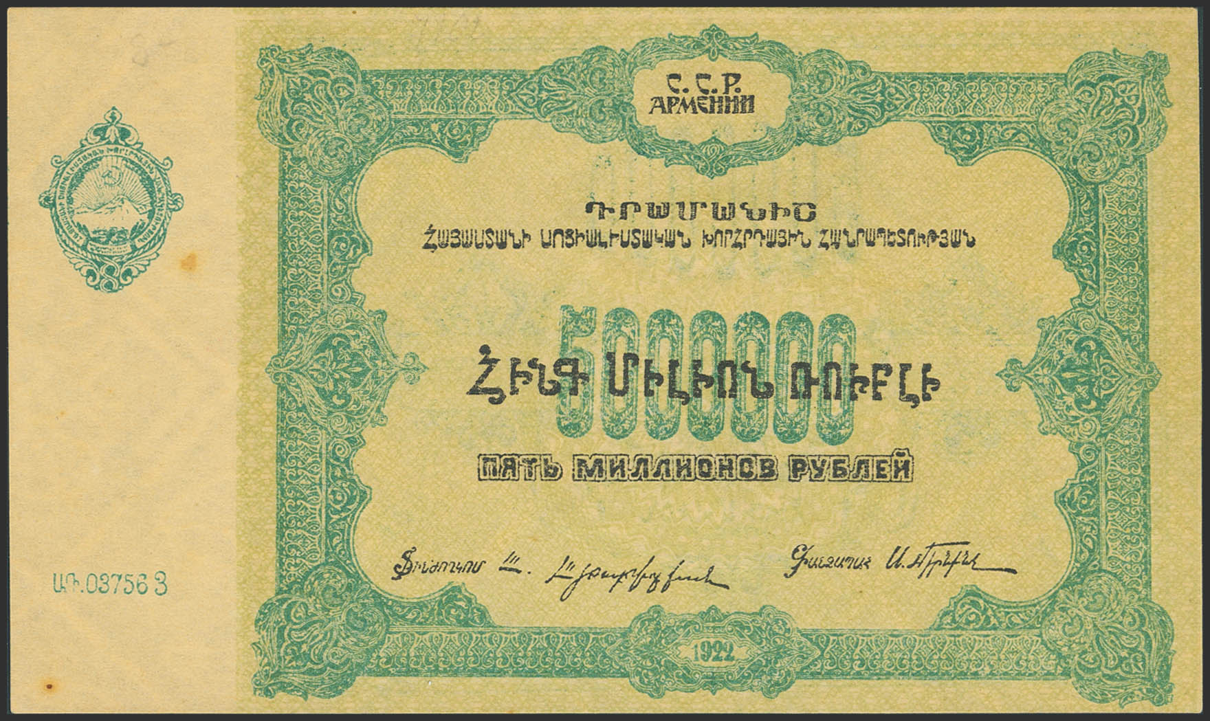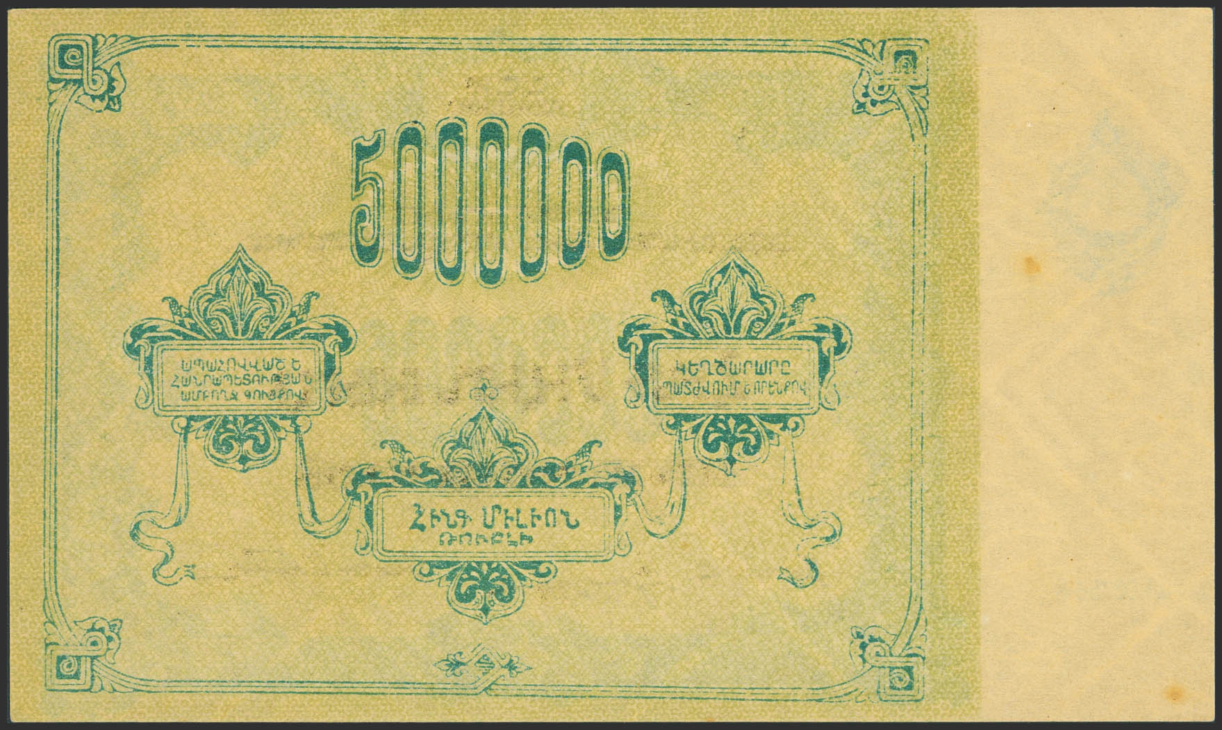 RUSSIA-TRANSCAUCASIA. 5000000 Rubley. 1922. Socialist Soviet Republic of Armenia. (Pick: S686). Light Stain, rust. Less than Uncirculated.