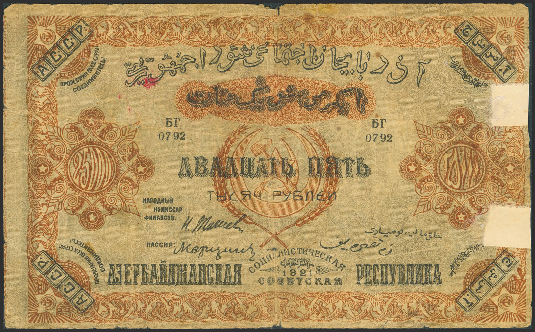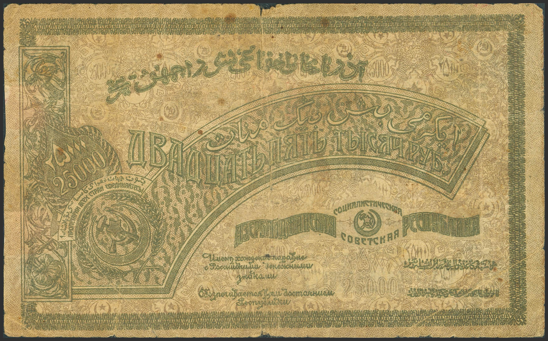 RUSSIA-TRANSCAUCASIA. 10000 Rubley. 1921. Socialist Soviet Republic of Azerbaijan. (Pick: S715). Tears, adhesive paper over tears and pinholes. Fine.