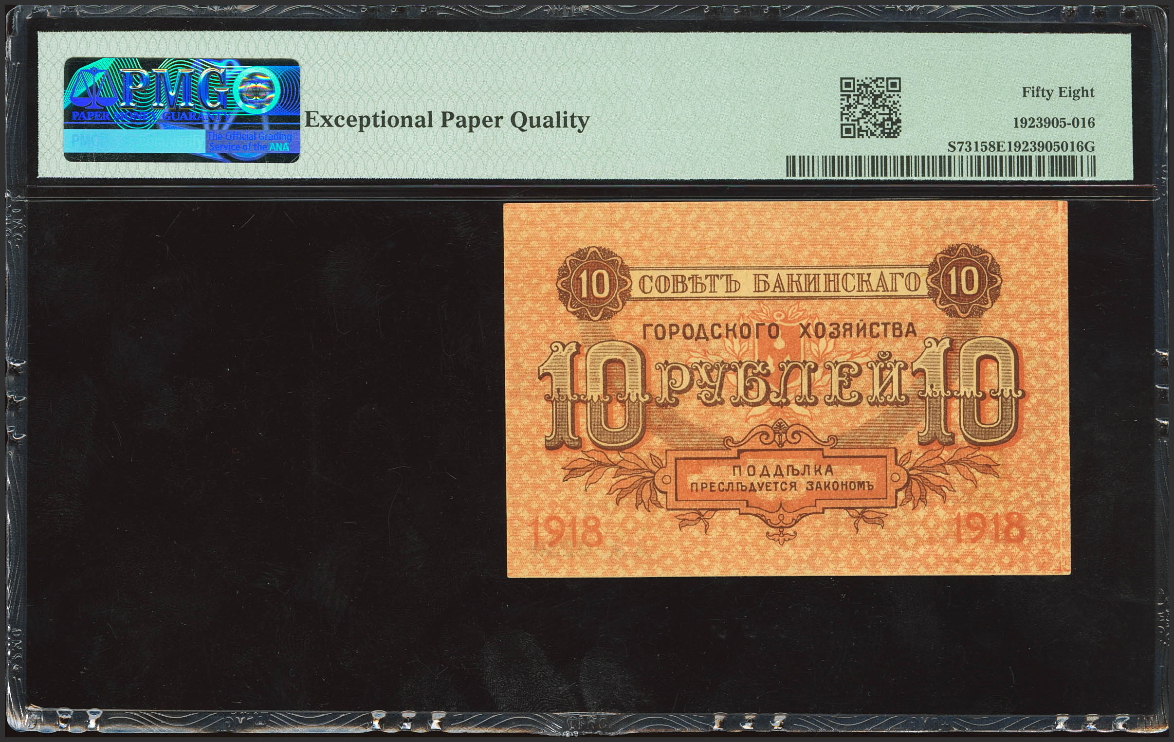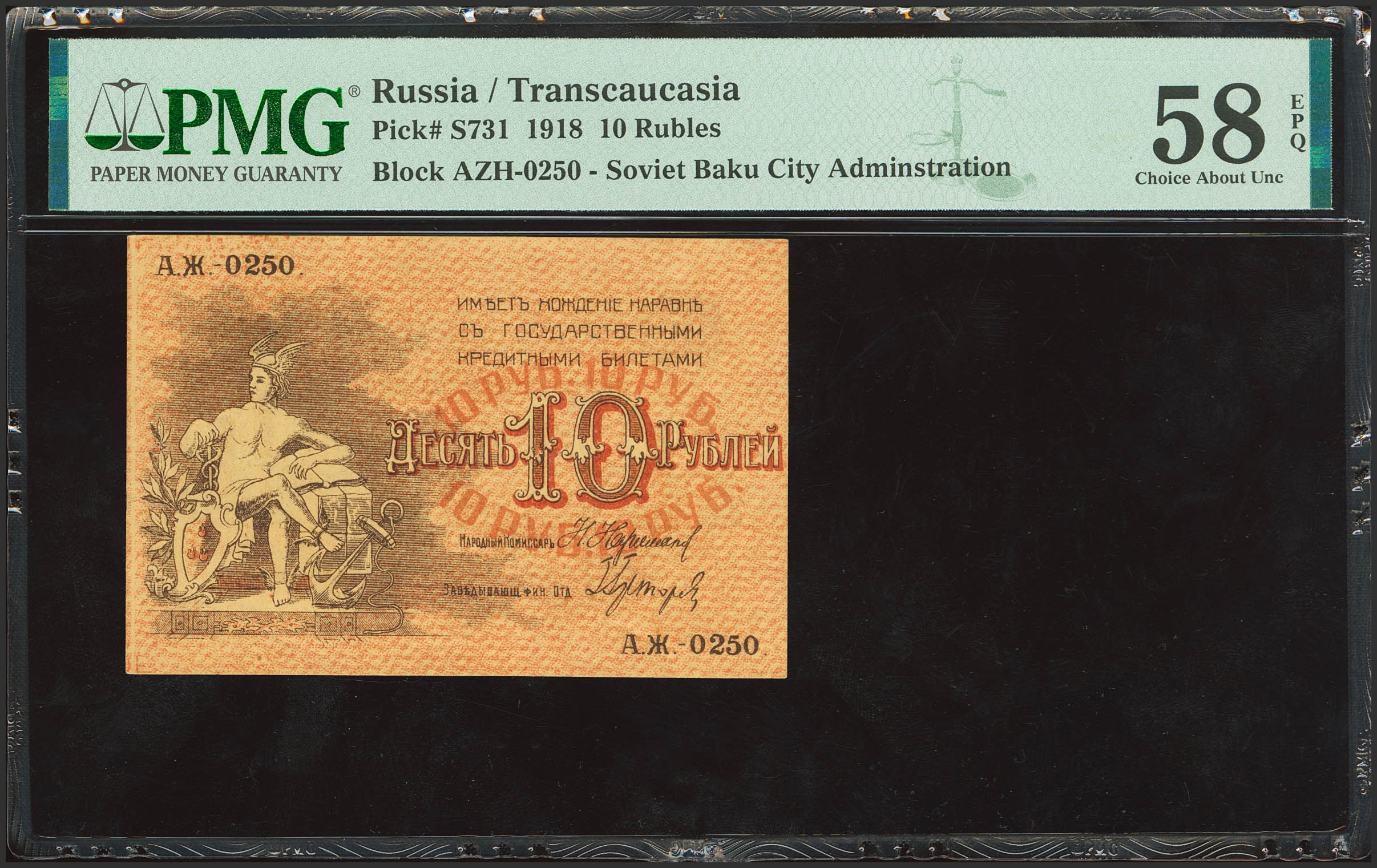 RUSSIA-TRANSCAUCASIA. 10 Rubley. 1918. Soviet Baku City Administration. (Pick: S731). PMG58EPQ.