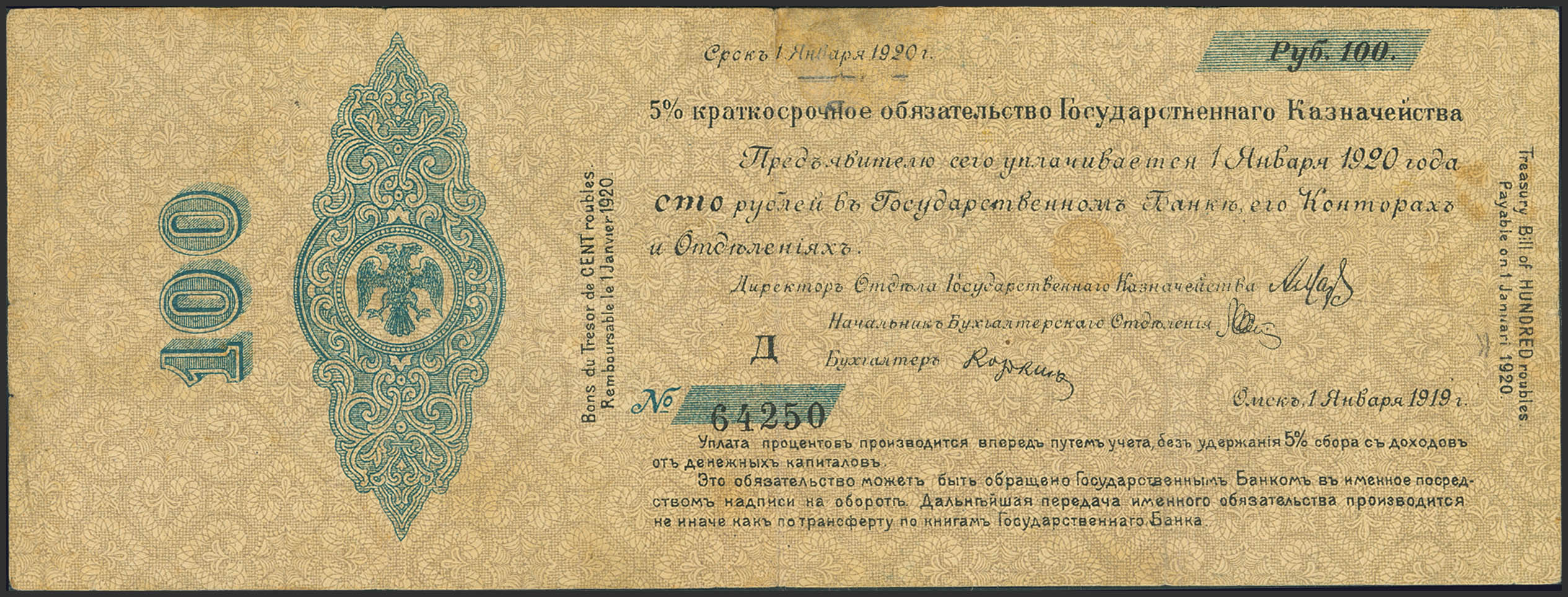 RUSSIA-SIBERIA AND URALS. 100 Rubley. 1 January 1919. Treasury. Omsk. (Pick: S836b). Very Fine, tear.