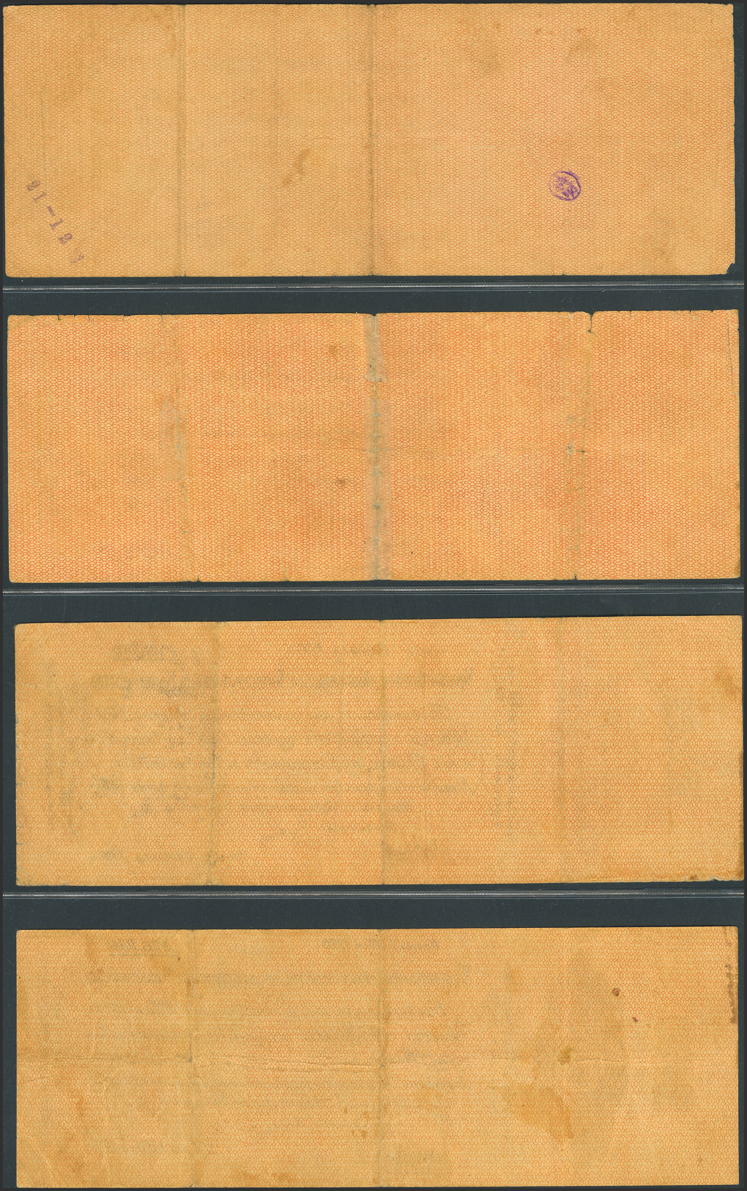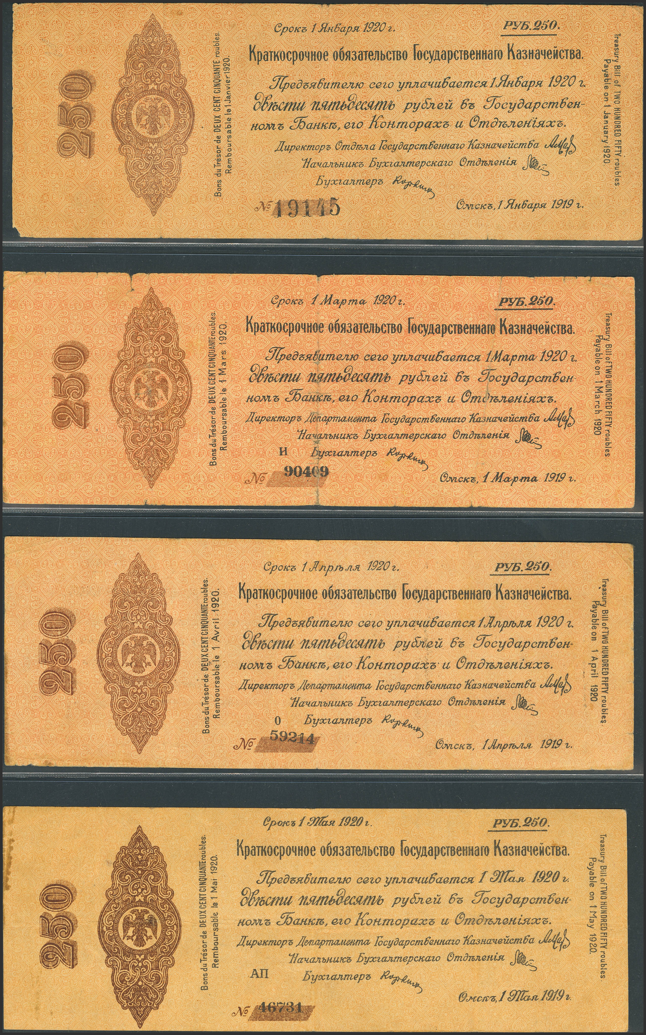 RUSSIA-SIBERIA AND URALS. Lot of 4 notes of 250 Rubles. January, March, April, May 1919. Treasury. Omsk. (Pick: S837, S848, S853, S857). Very Fine, corner missing.