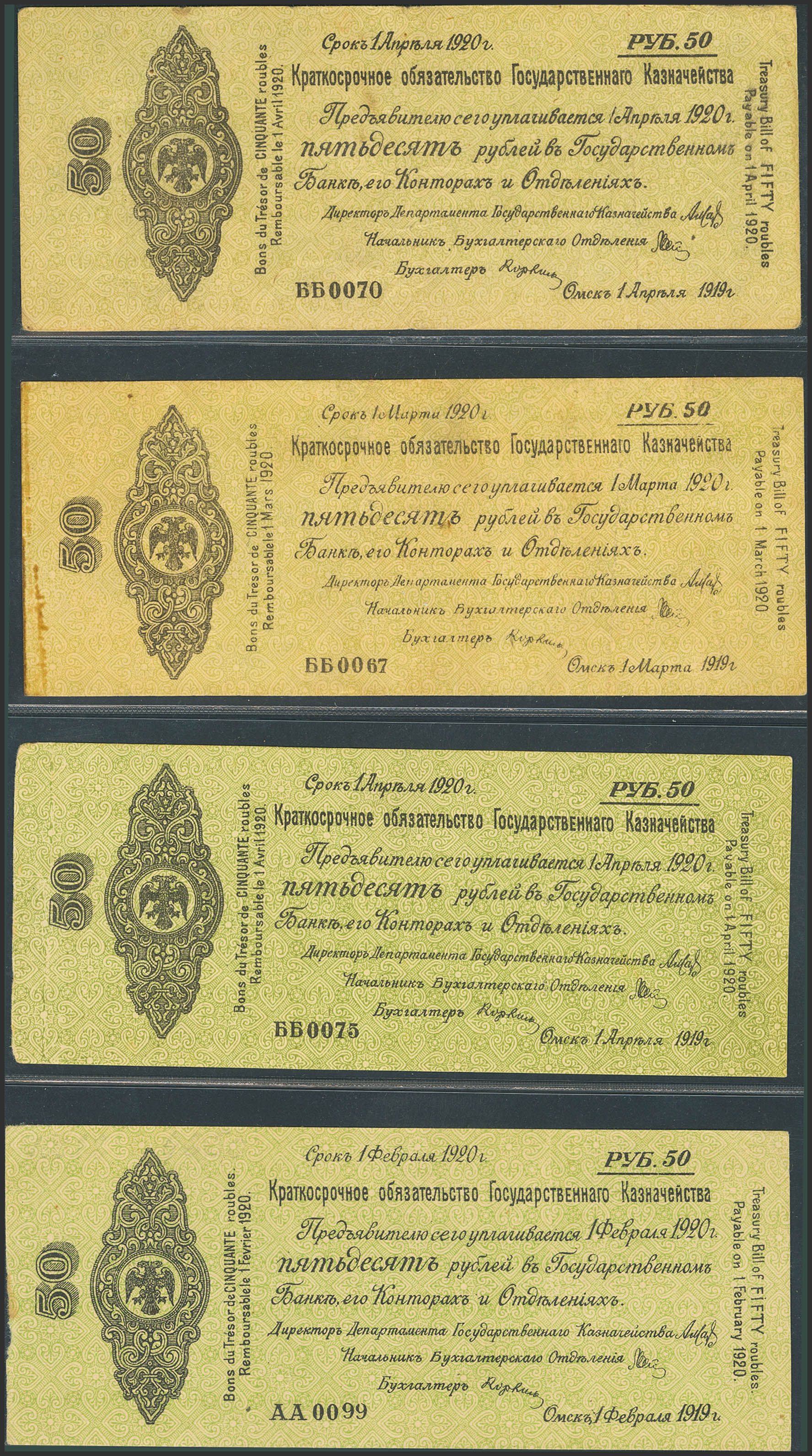RUSSIA-SIBERIA AND URALS. Lot of 4 notes of 50 Rubles. 1919. Treasury. Omsk. (Pick: S841b, 847, S852(2)). Almost Uncirculated (2) and Extremely Fine (2).