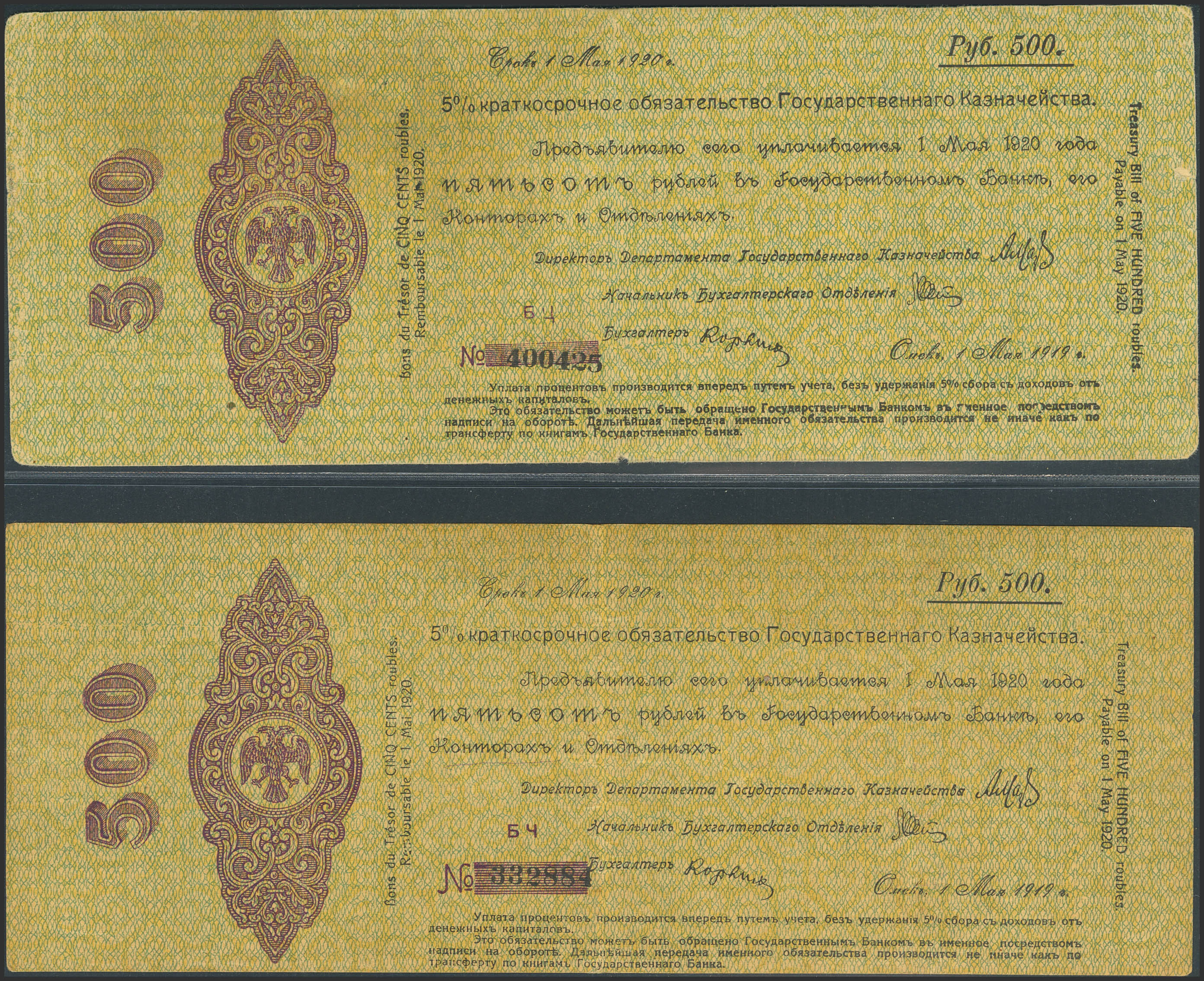 RUSSIA-SIBERIA AND URALS. Lot of 2 notes of 500 Rubley. 1 May 1919. Treasury. Omsk. (Pick: S858). More than Very Fine and Extremely Fine, tear in one of them.
