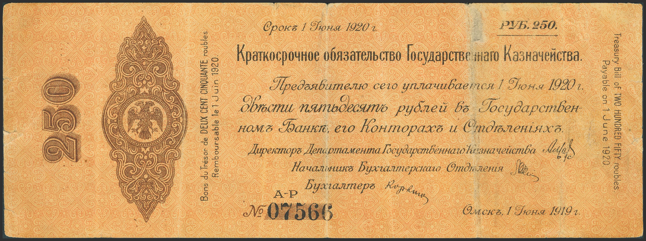 RUSSIA-SIBERIA AND URALS. 250 Rubley. 1 June 1919. Treasury. Omsk. (Pick: S861). Very Fine, tape added on the folds on the back.