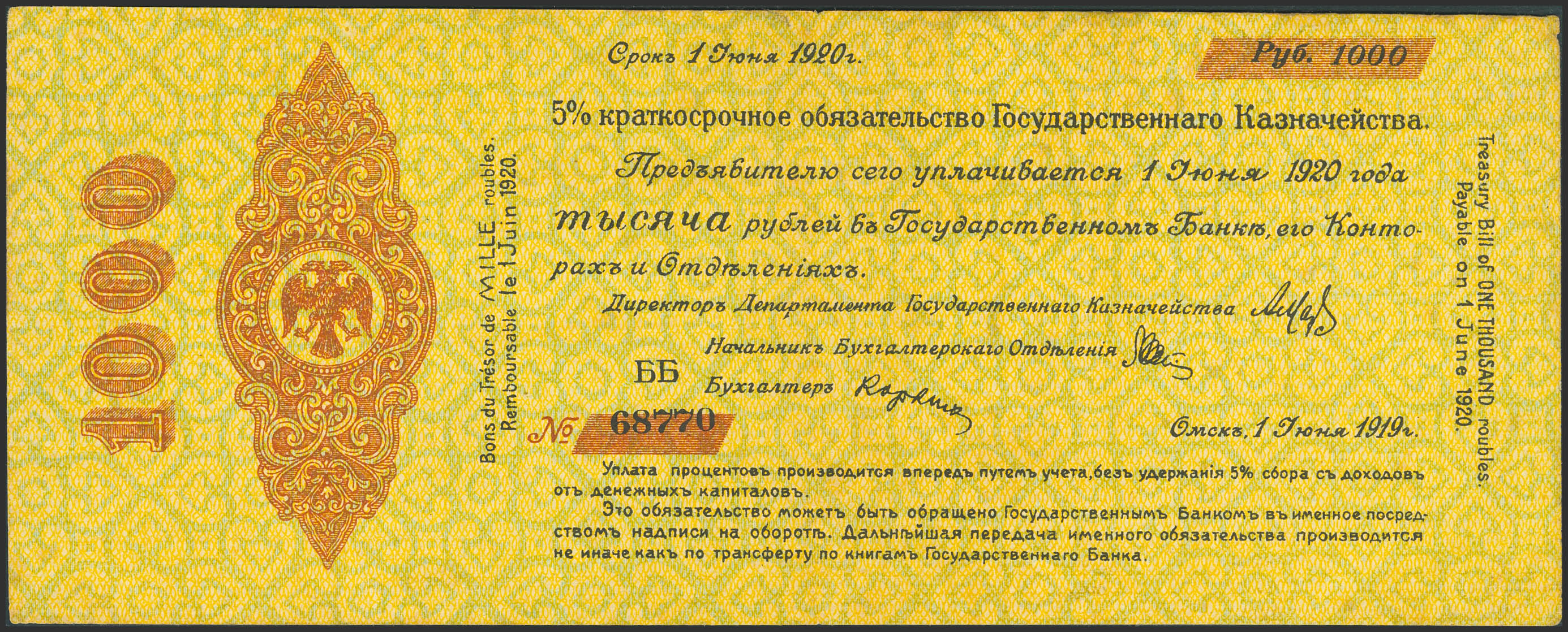 RUSSIA-SIBERIA AND URALS. 1000 Rubley. 1 June 1919. Treasury. Omsk. (Pick: S863). More than Extremely Fine.