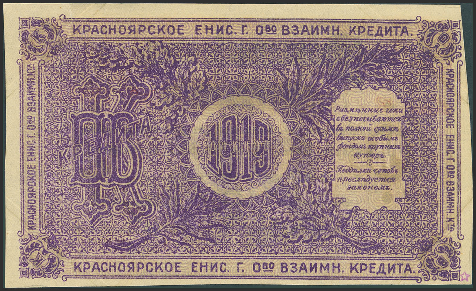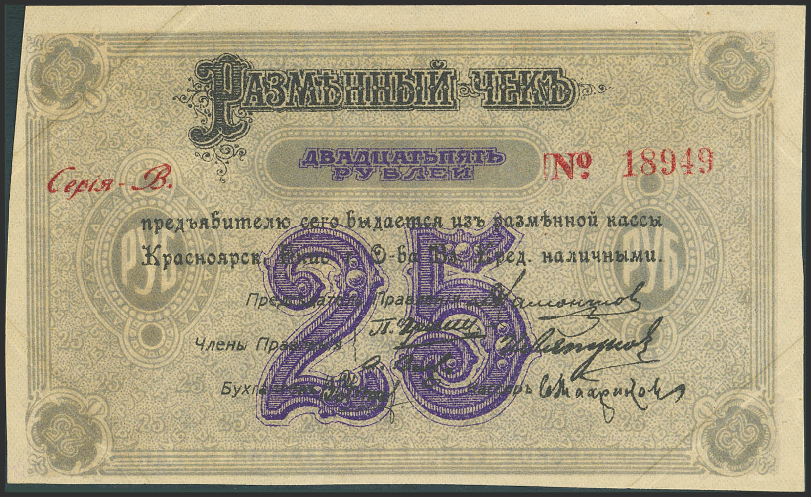 RUSSIA-SIBERIA AND URALS. 25 Rubles. 1919. Krasnoyarsk Territory. Treasury. Exchange Check. (Pick: S970c). Tear on top. Less than Uncirculated.