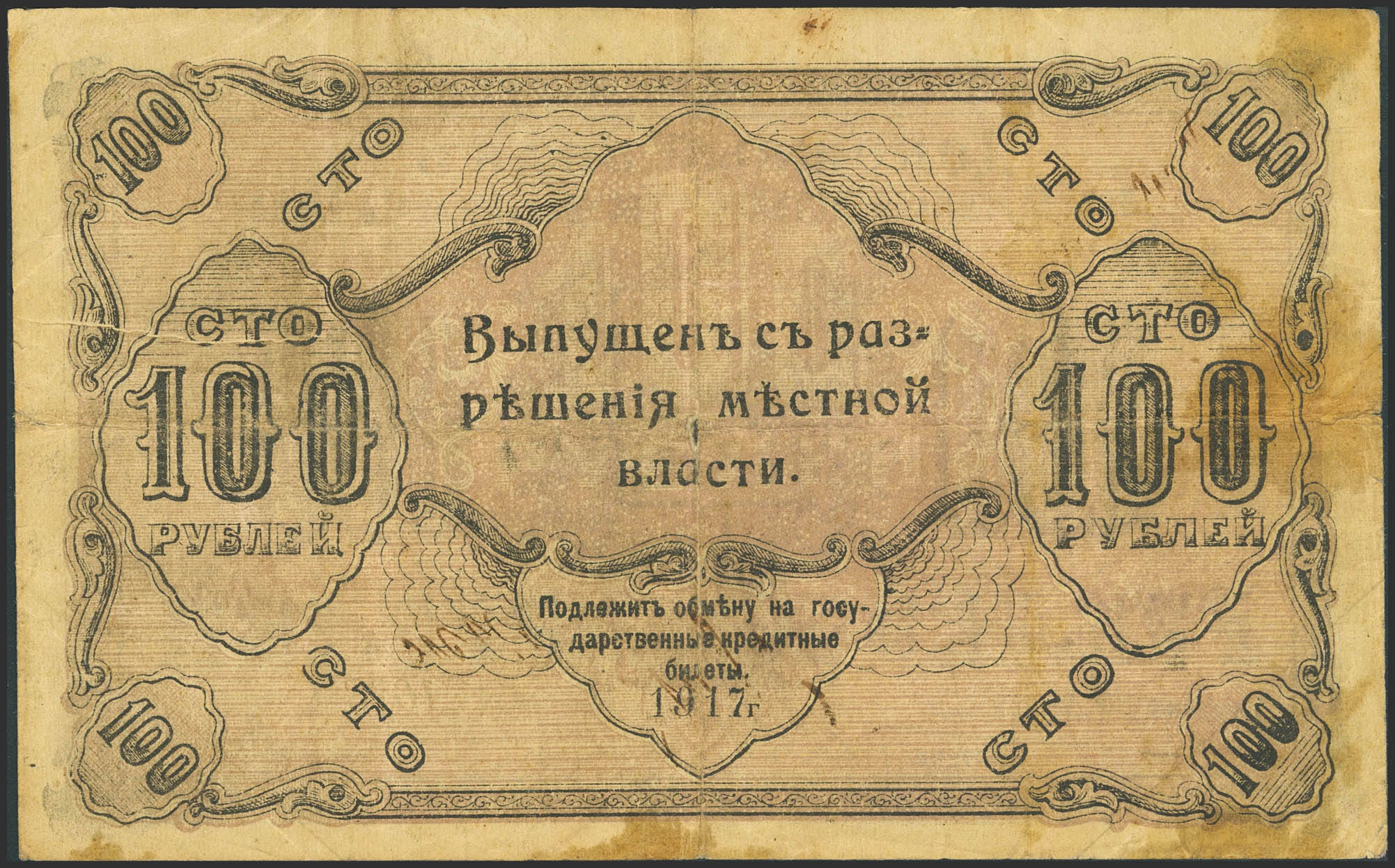 RUSSIA-SIBERIA AND URALS. 100 Rubley. 1917. State Bank. Orenburg Branch. (Pick: S978). Very Fine, tears, stains.