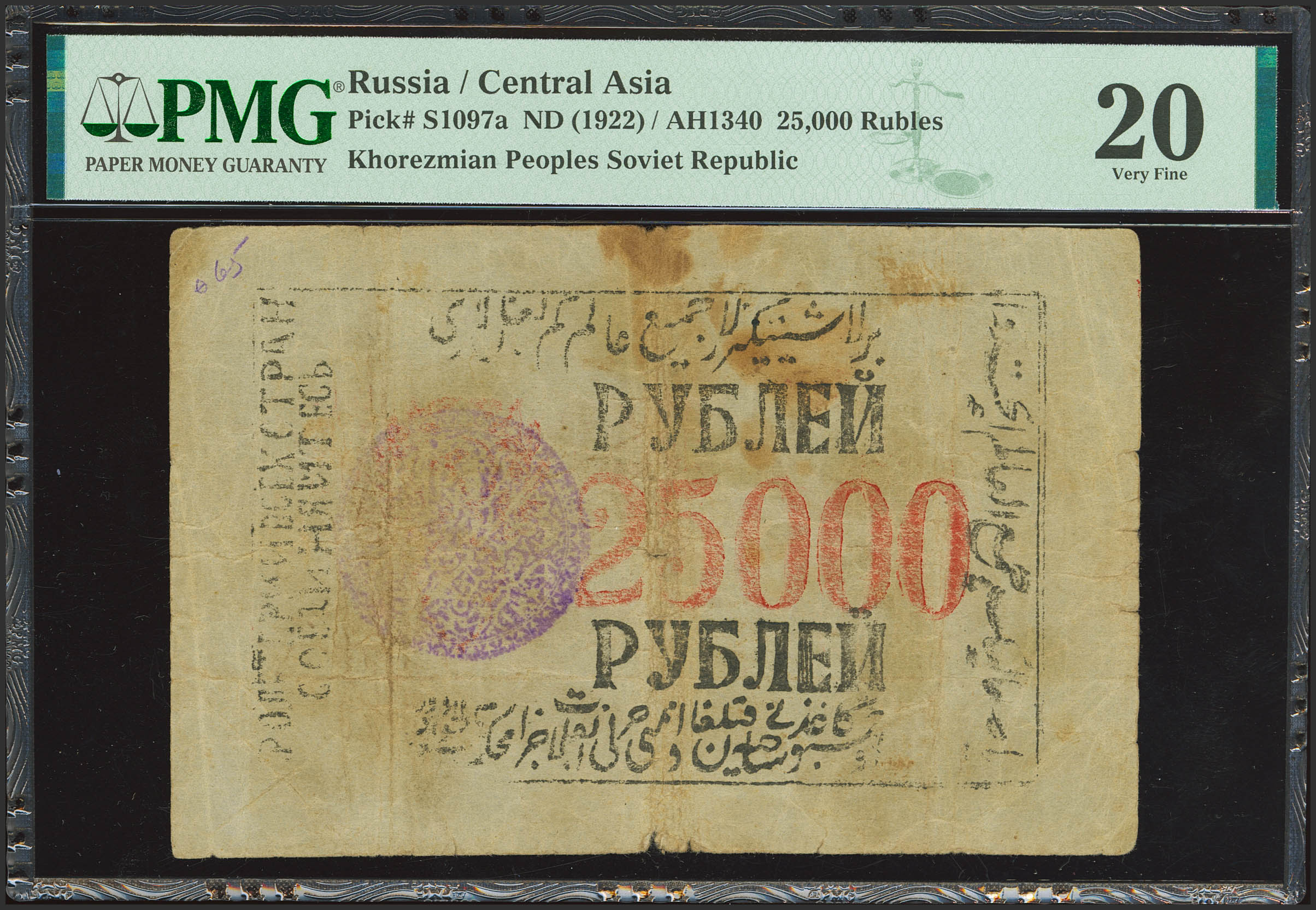 RUSSIA-CENTRAL ASIA. 25000 Rubles. 1921. Treasury. With blue seal. (Pick: S1097a). PMG20 (stains, annotation, ink stamp).