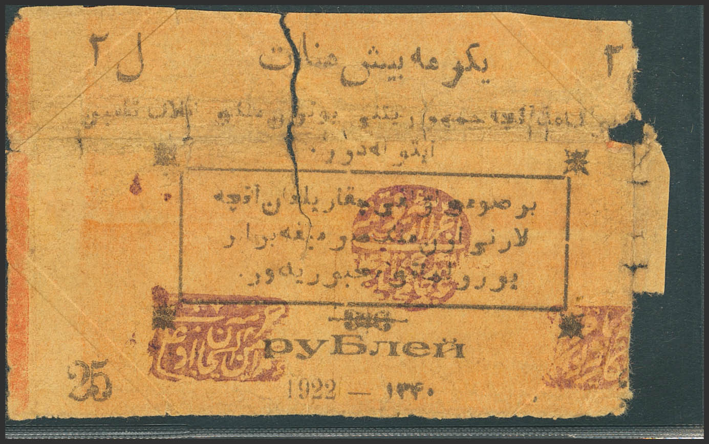 RUSSIA-CENTRAL ASIA. 25 Rubles. 1922. Treasury. Khorezm Soviet Peoples Republic. (Pick: S1107). Tear, pieces missing. Good.