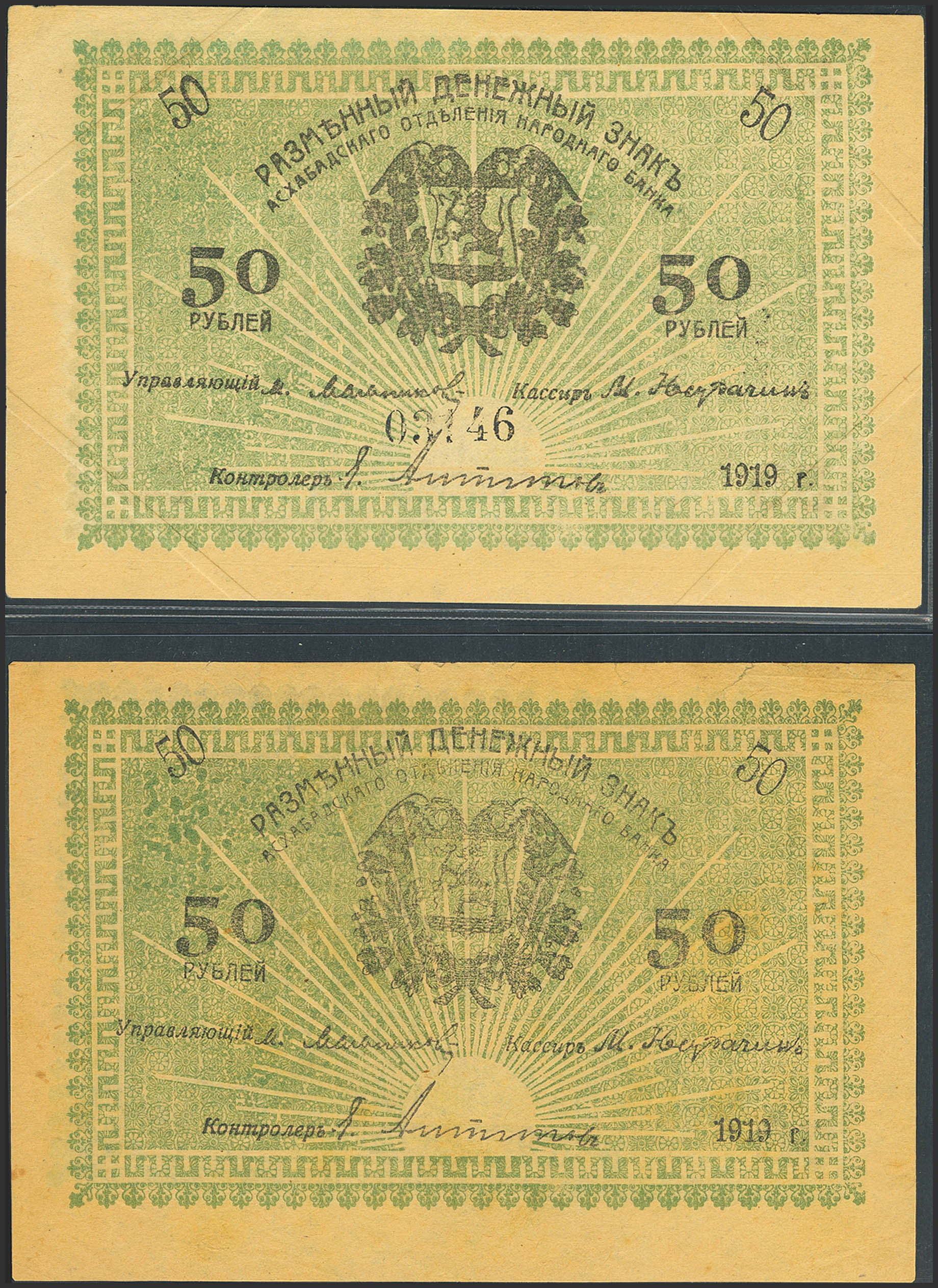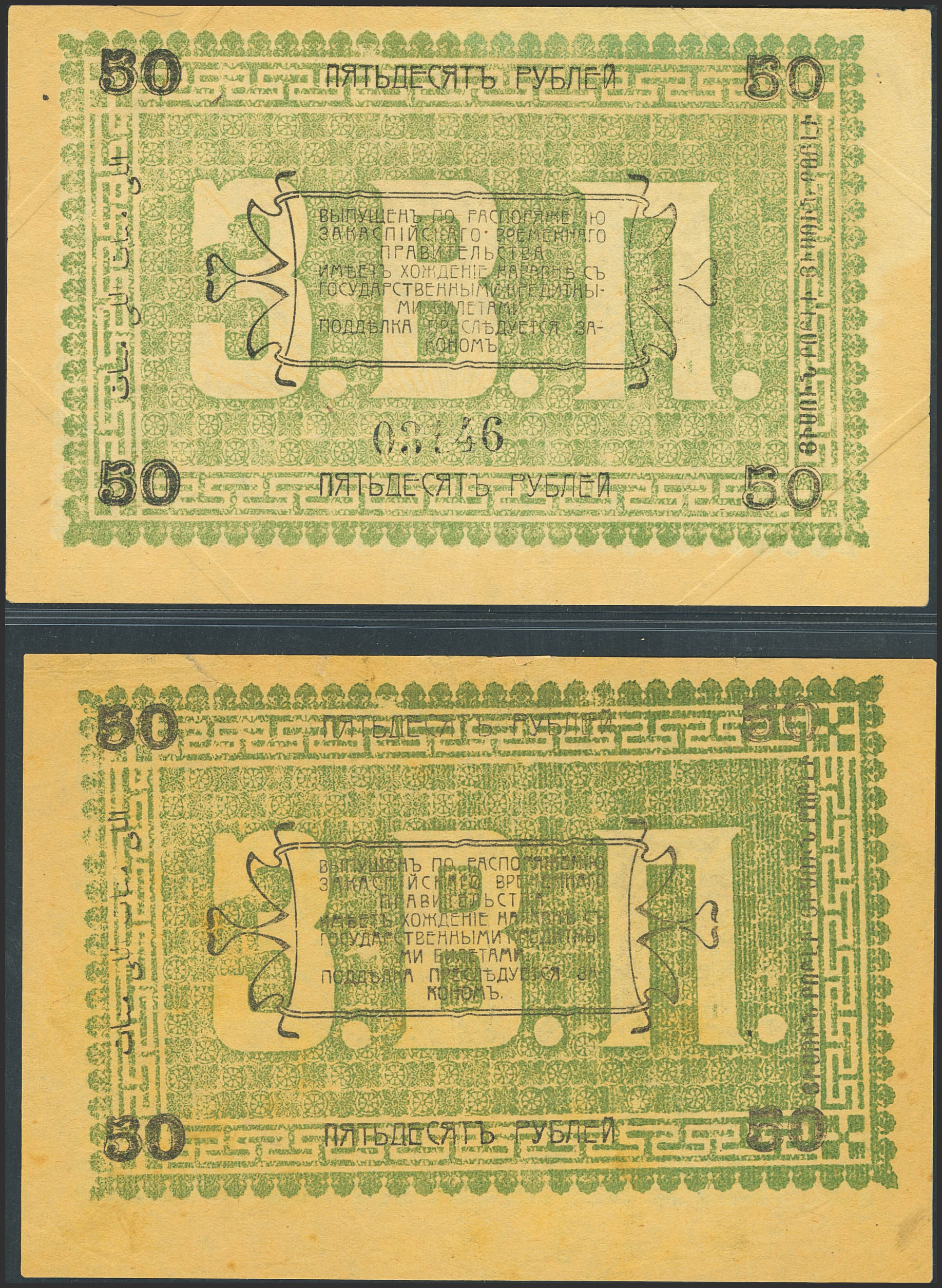 RUSSIA-CENTRAL ASIA. Lot of 2 notes of 50 Rubley. 1919. National Bank. Ashkhabad. One of them with serial number. (Pick: S1144a). Less than Uncirculated.
