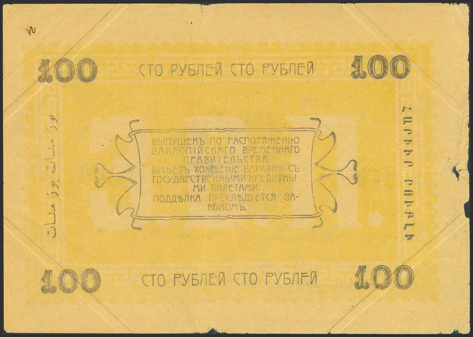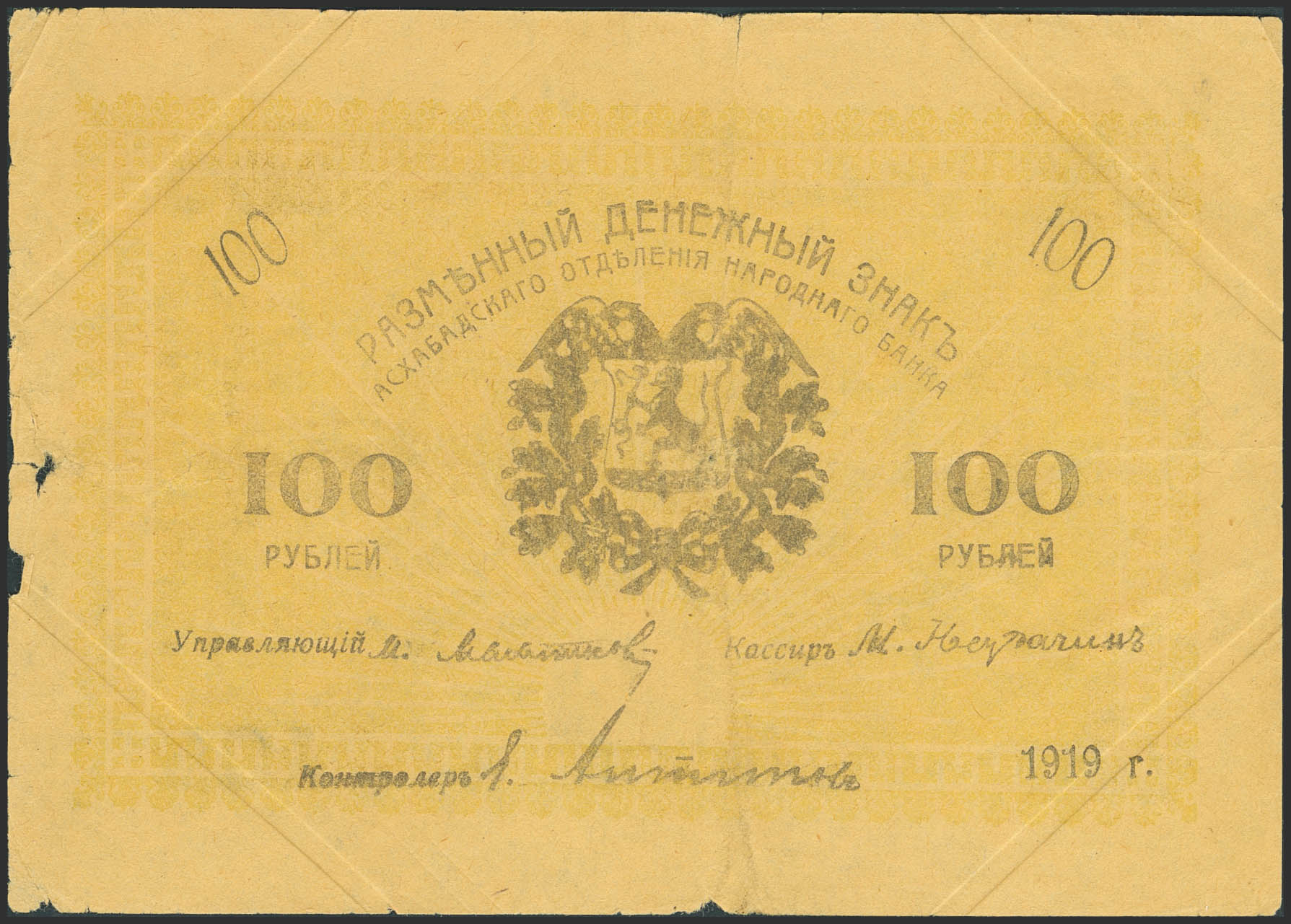 RUSSIA-CENTRAL ASIA. 100 Rubley. 1919. National Bank. Ashkhabad. (Pick: S1145). Extremely Fine, tear, hole.