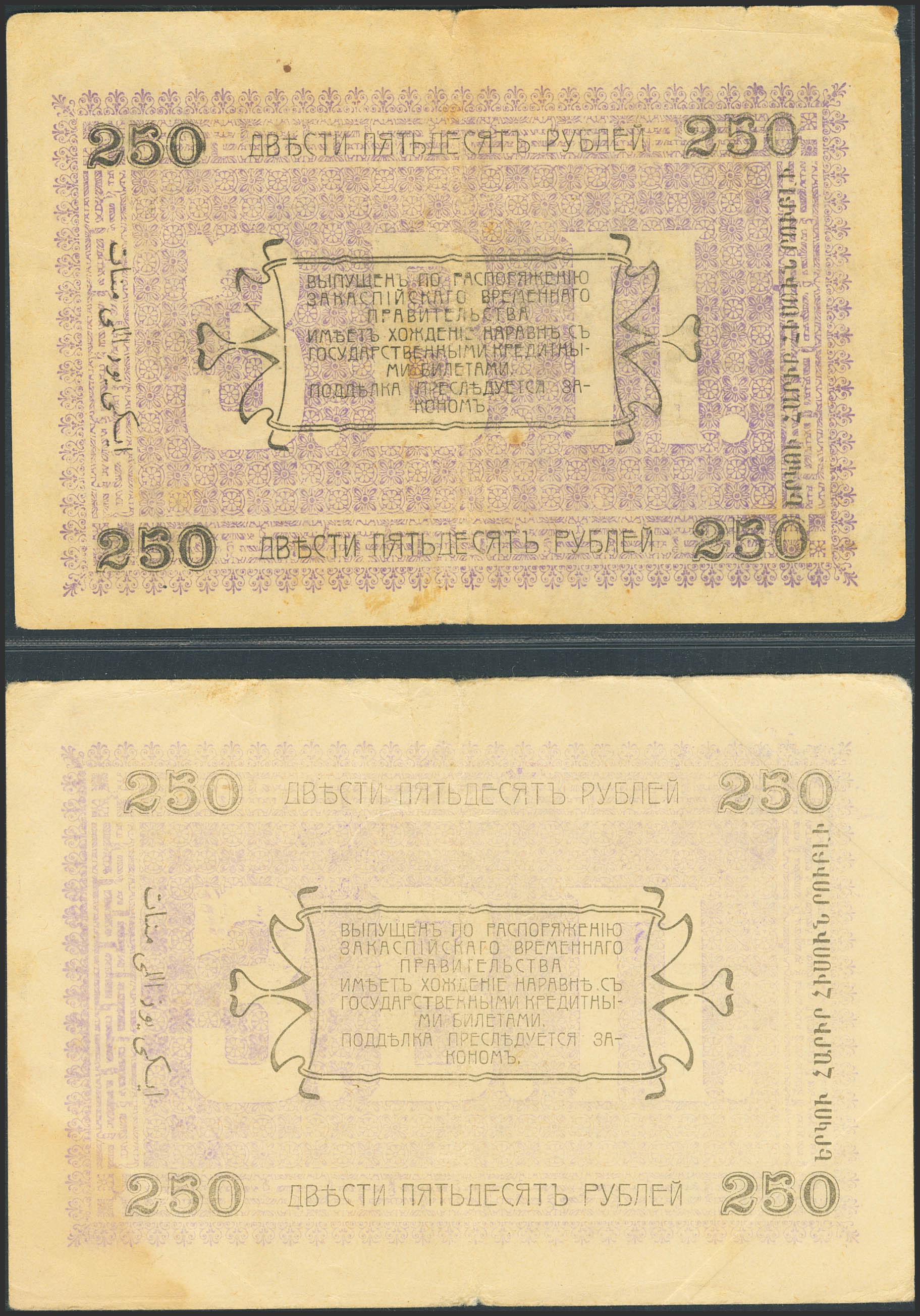 RUSSIA-CENTRAL ASIA. Lot of 2 notes of 250 Rubley. 1919. National Bank. Ashkhabad. With and without handstamp. (Pick: S1146). More than Very Fine.