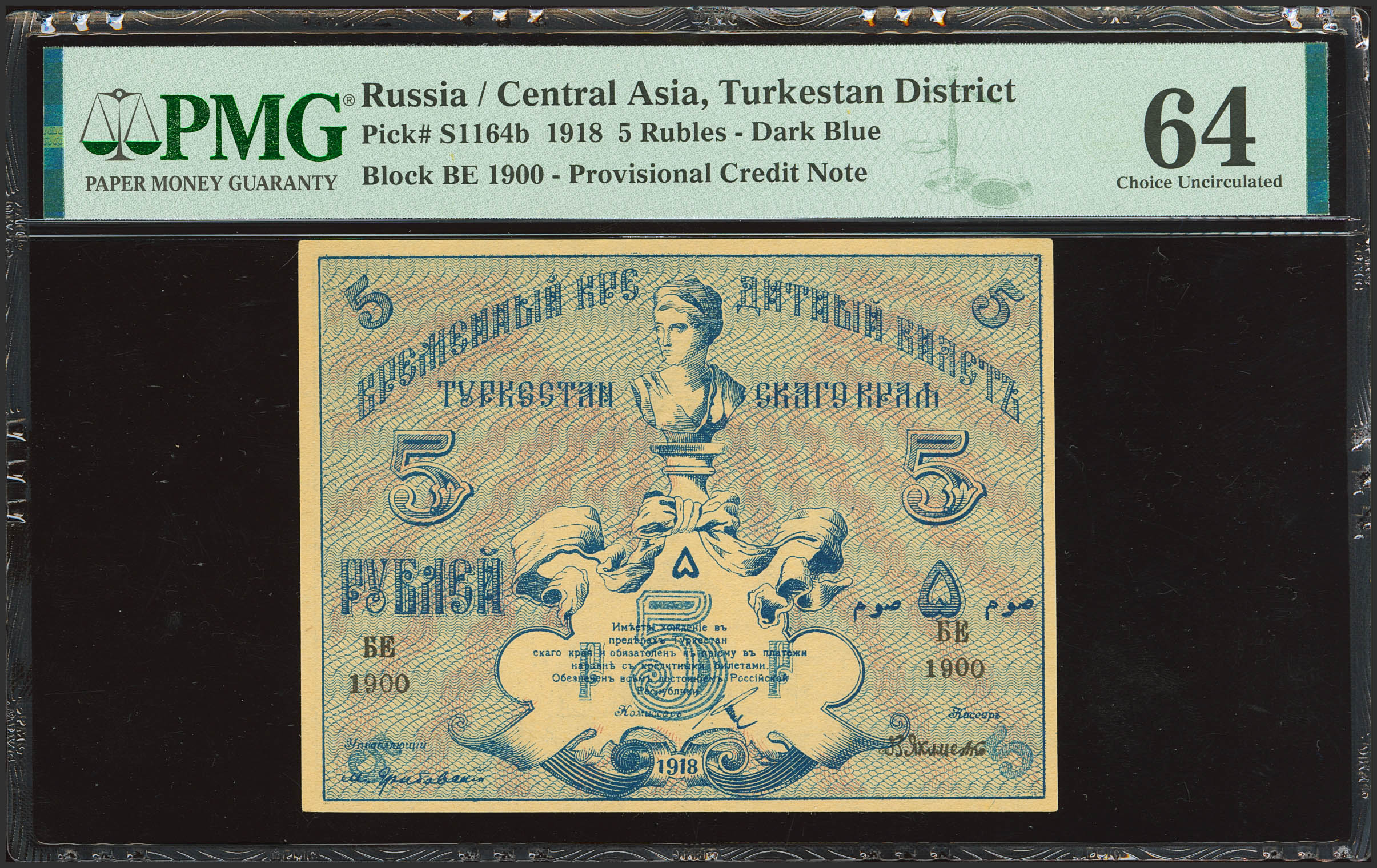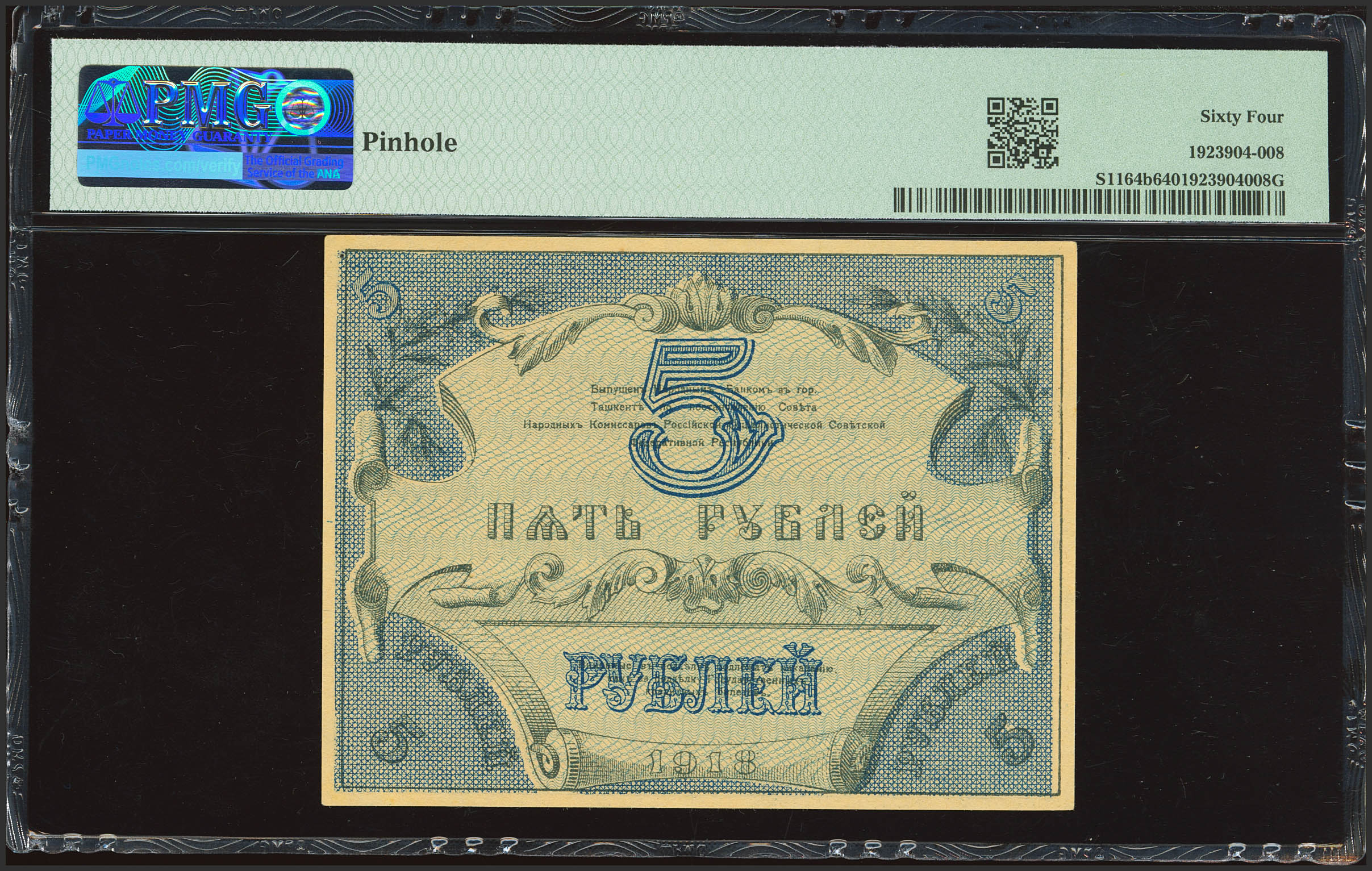 RUSSIA-CENTRAL ASIA. 5 Rubles. 1918. National Bank. Turkestan District. Temporary Credit Note. (Pick: S1164b). PMG64 (pinhole).
