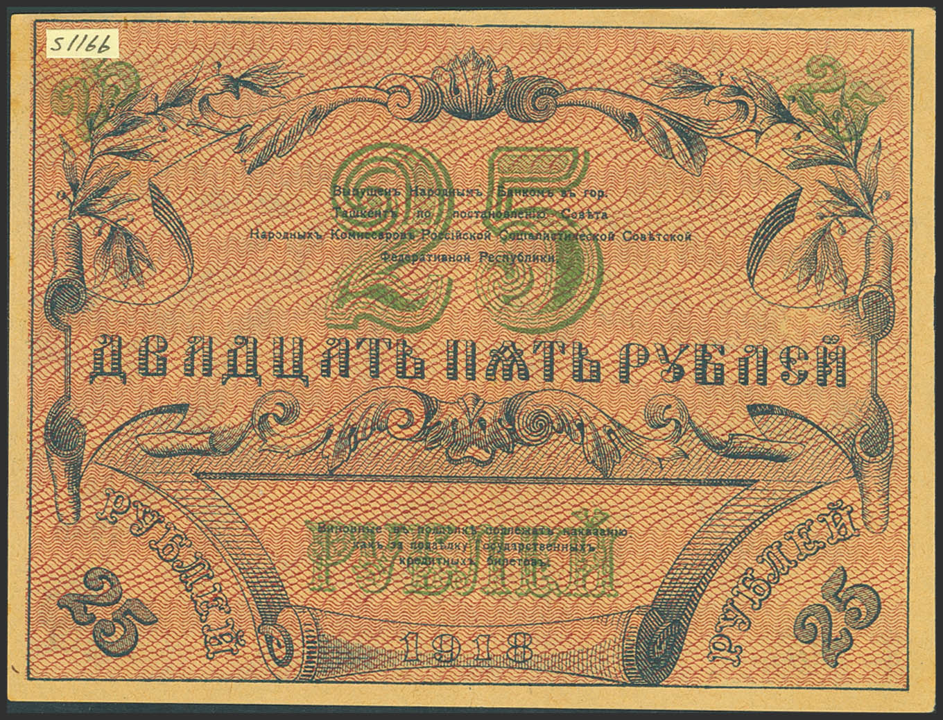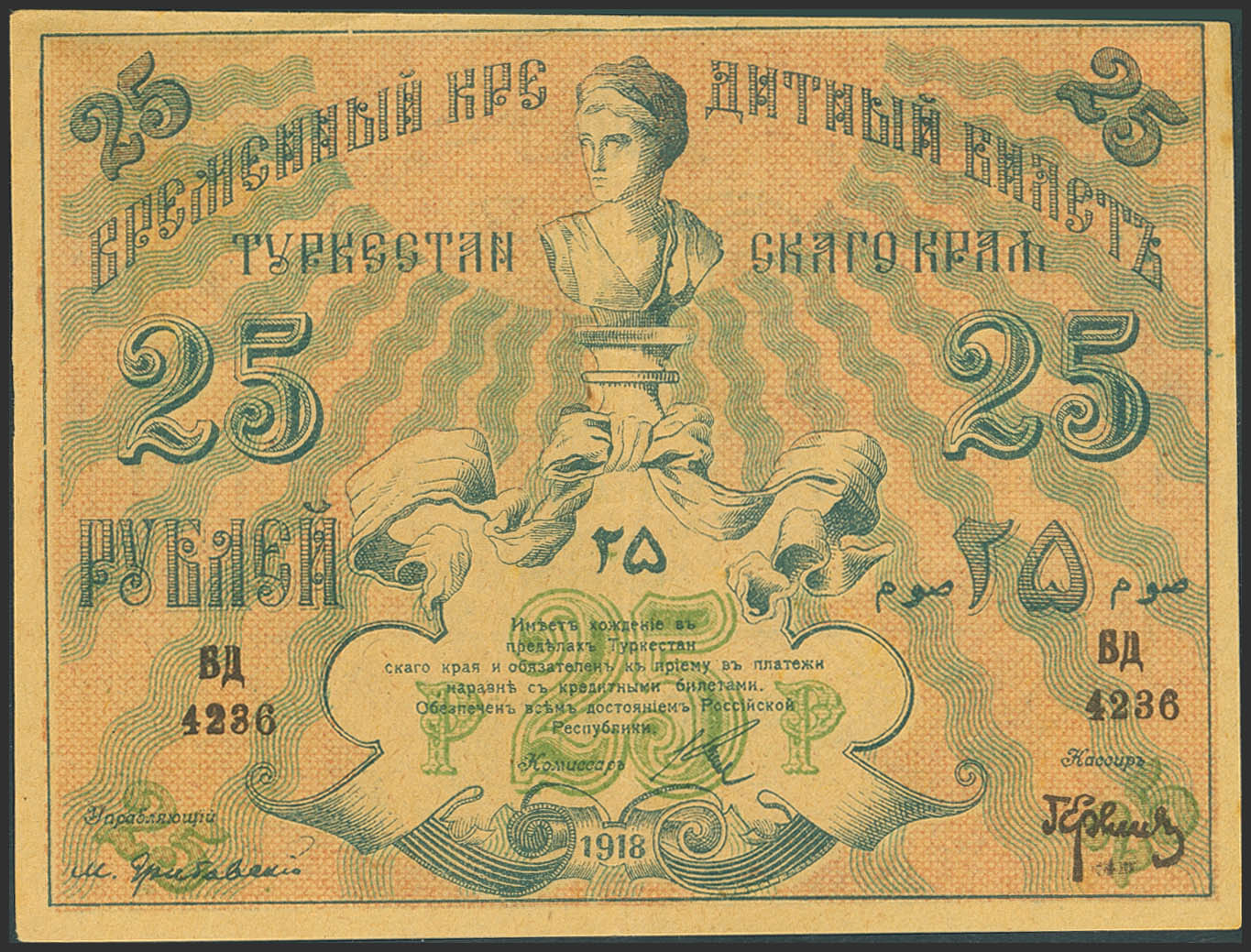 RUSSIA-CENTRAL ASIA. 25 Rubles. 1918. National Bank. Turkestan District. Temporary Credit Note. (Pick: S1166). More than Extremely Fine.
