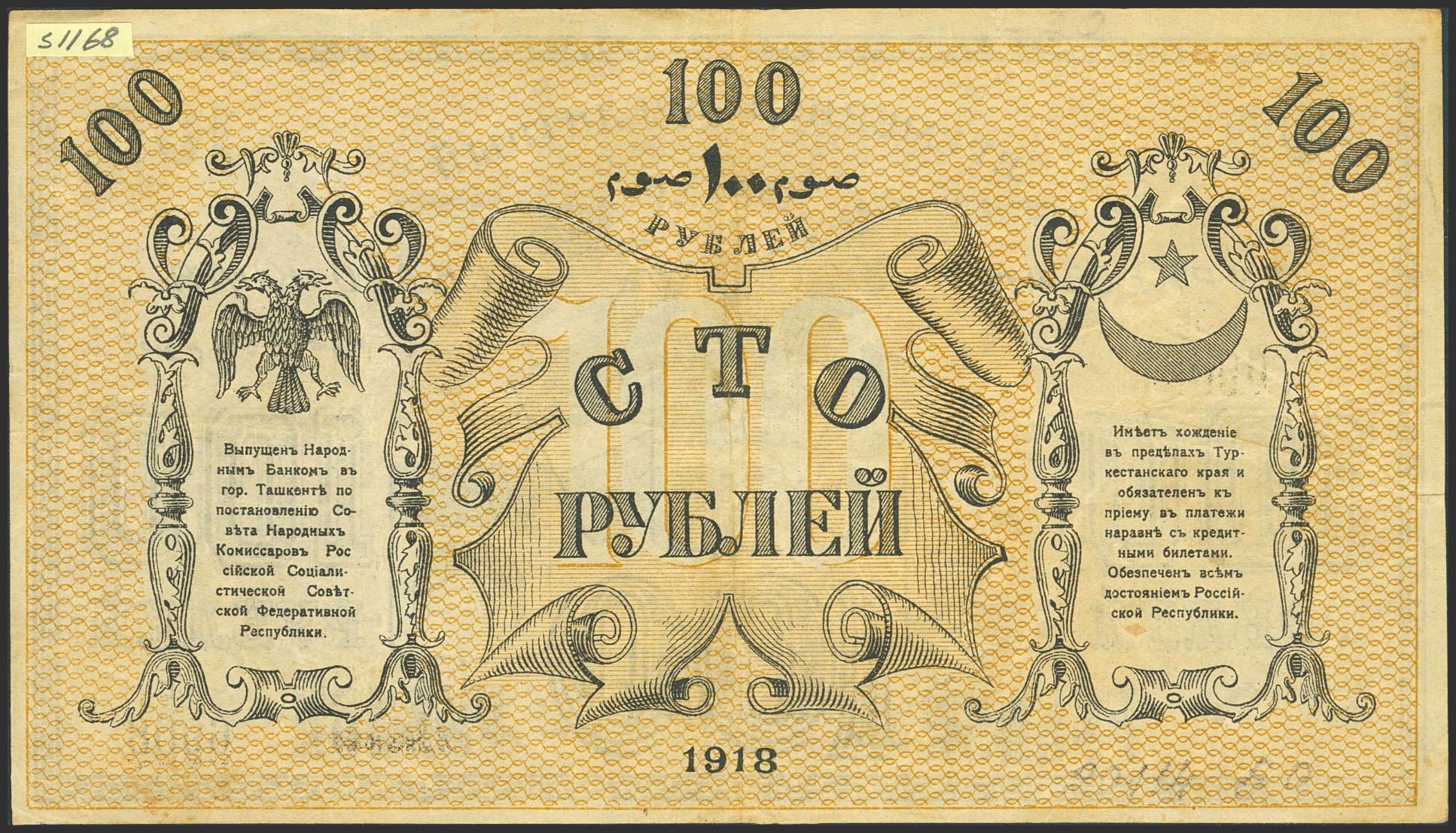 RUSSIA-CENTRAL ASIA. 100 Rubles. 1918. National Bank. Turkestan District. Temporary Credit Note. (Pick: S1168). More than Very Fine.