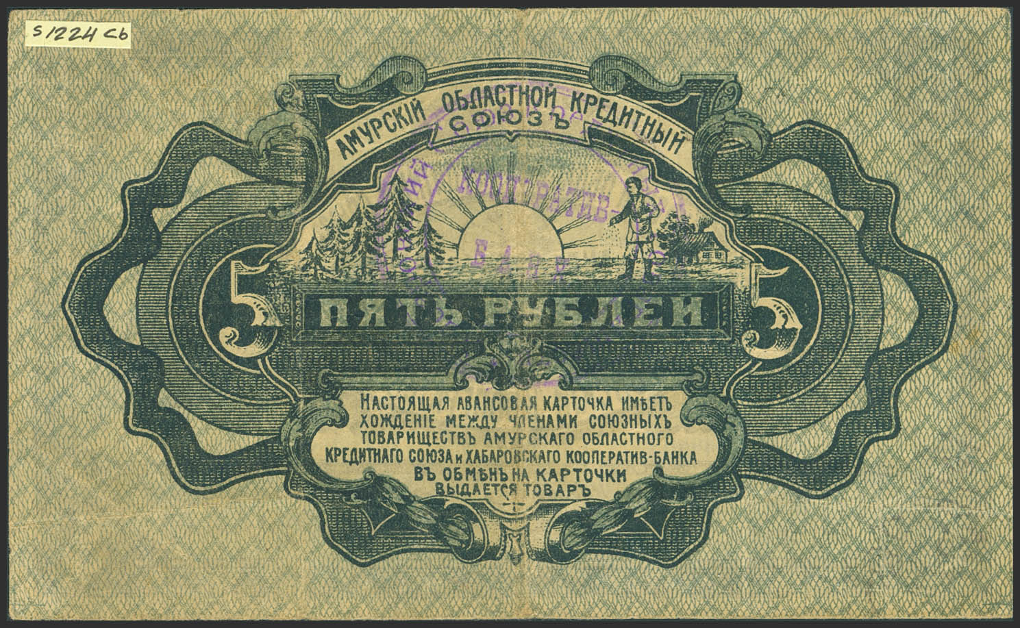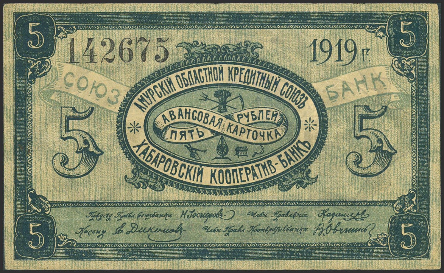 RUSSIA-EAST SIBERIA. 5 Rubles. 1919. Amur Regional Credit Union. Khabarovsk Cooperative Bank. (Pick: S1224Cb). More than Very Fine.
