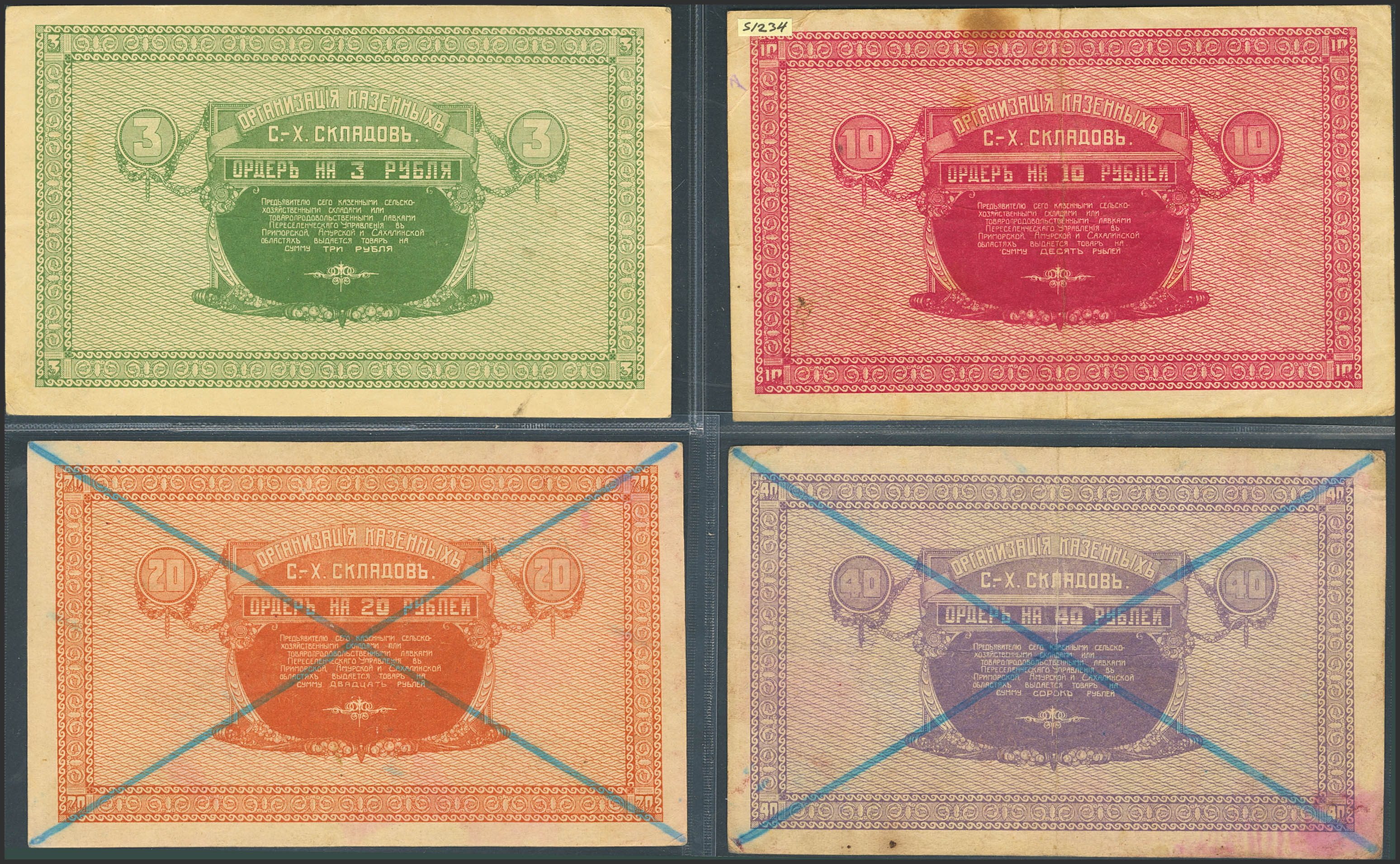 RUSSIA-EAST SIBERIA. Lot of 4 notes of 3, 10, 20 and 40 Rubles. (1919ca). Organization of Farmers Depots. Nikolsk. Ussurijsk. (Pick: S1232, S1234, S1235, S1236). Two of them have a cross on the reverse and damage from being previously mounted, probably cancelled. More than Very Fine.