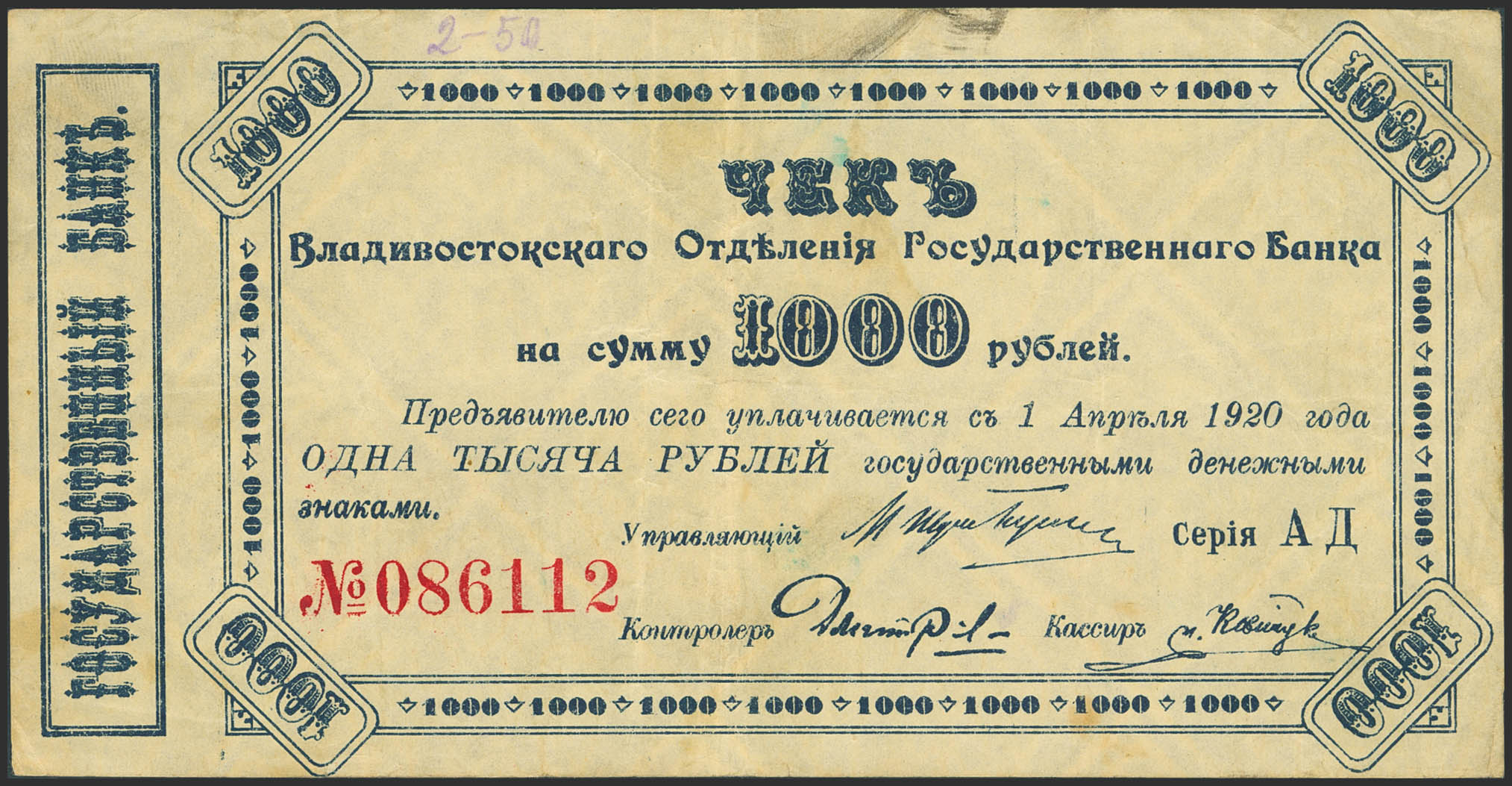 RUSSIA-EAST SIBERIA. 1000 Rubley. 1 April 1920. State Bank. Vladivostok Branch. (Pick: S1254). More than Very Fine.