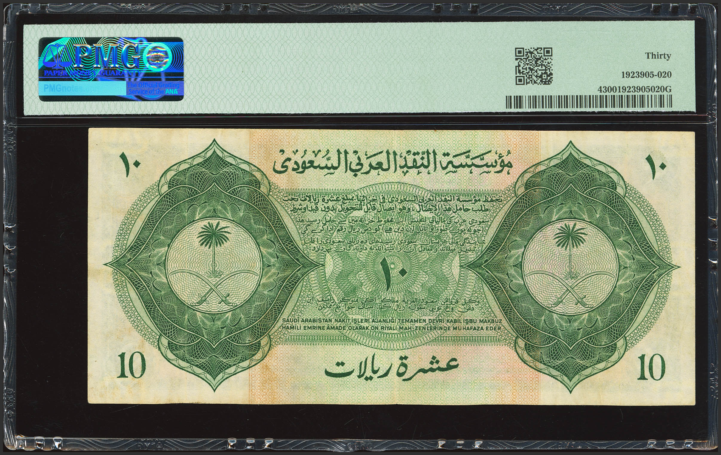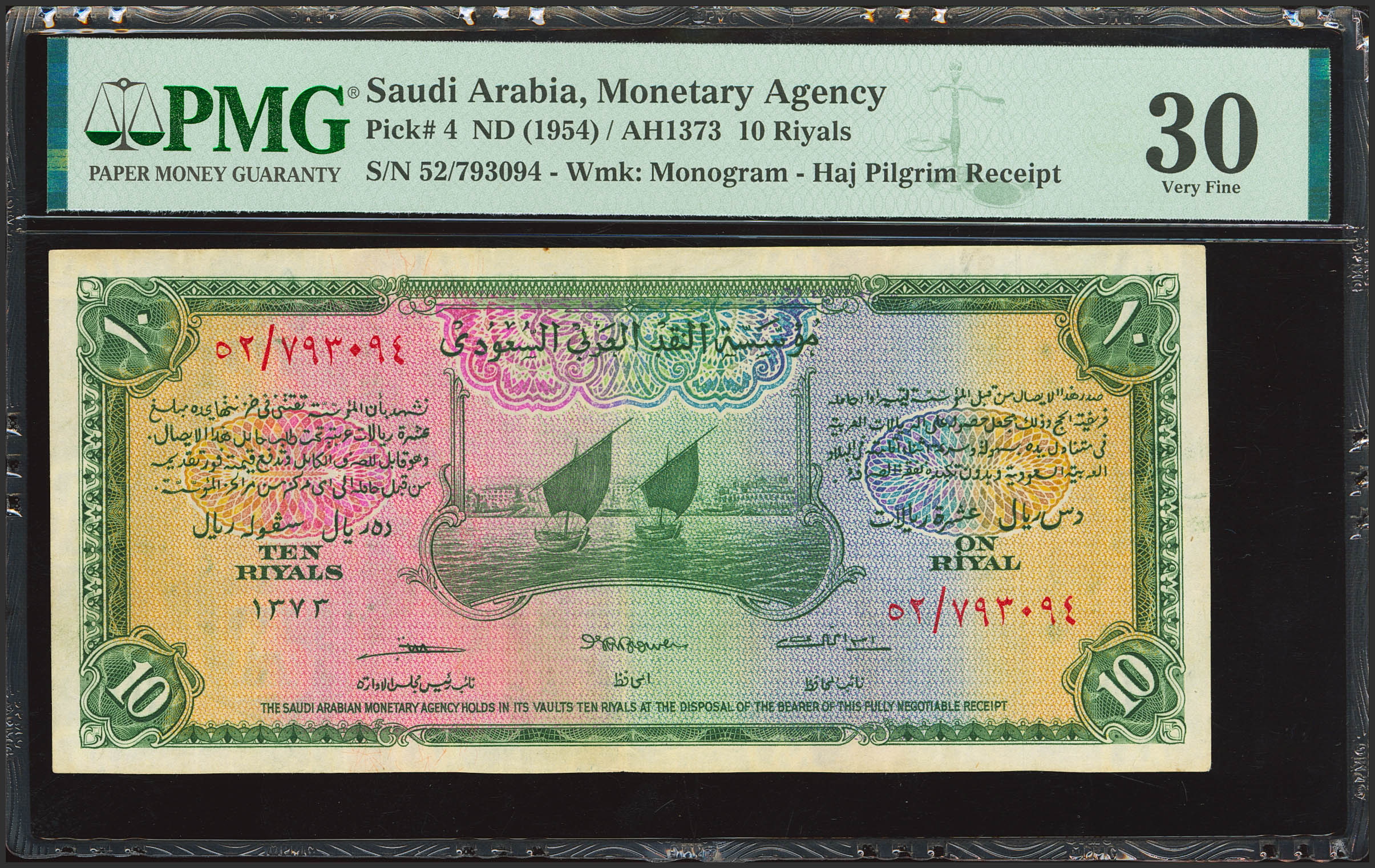 SAUDI ARABIA. 10 Riyals. 1954. Saudi Arabian Monetary Agency. Haj Pilgrim Receipt. (Pick: 4). PMG30.