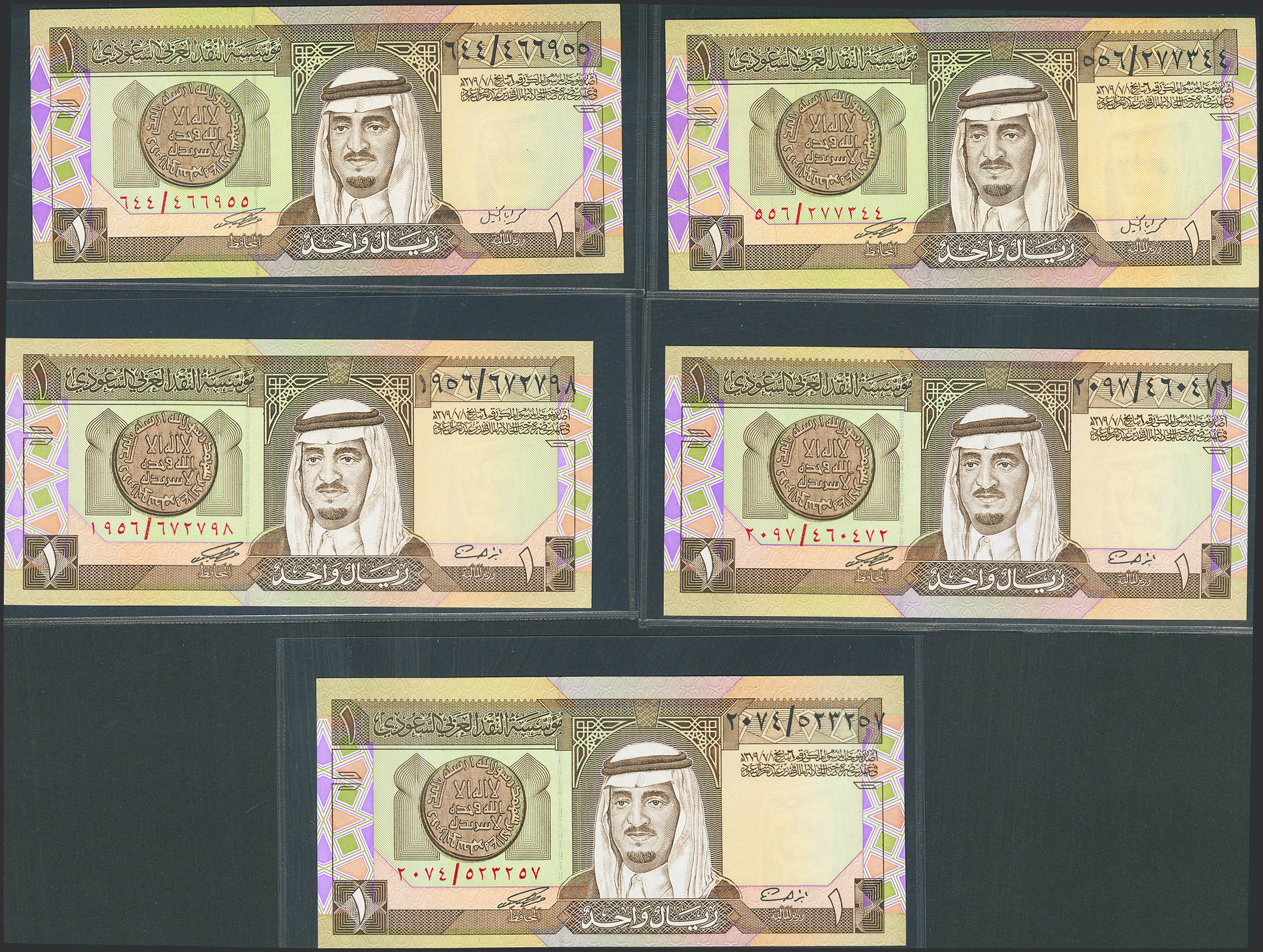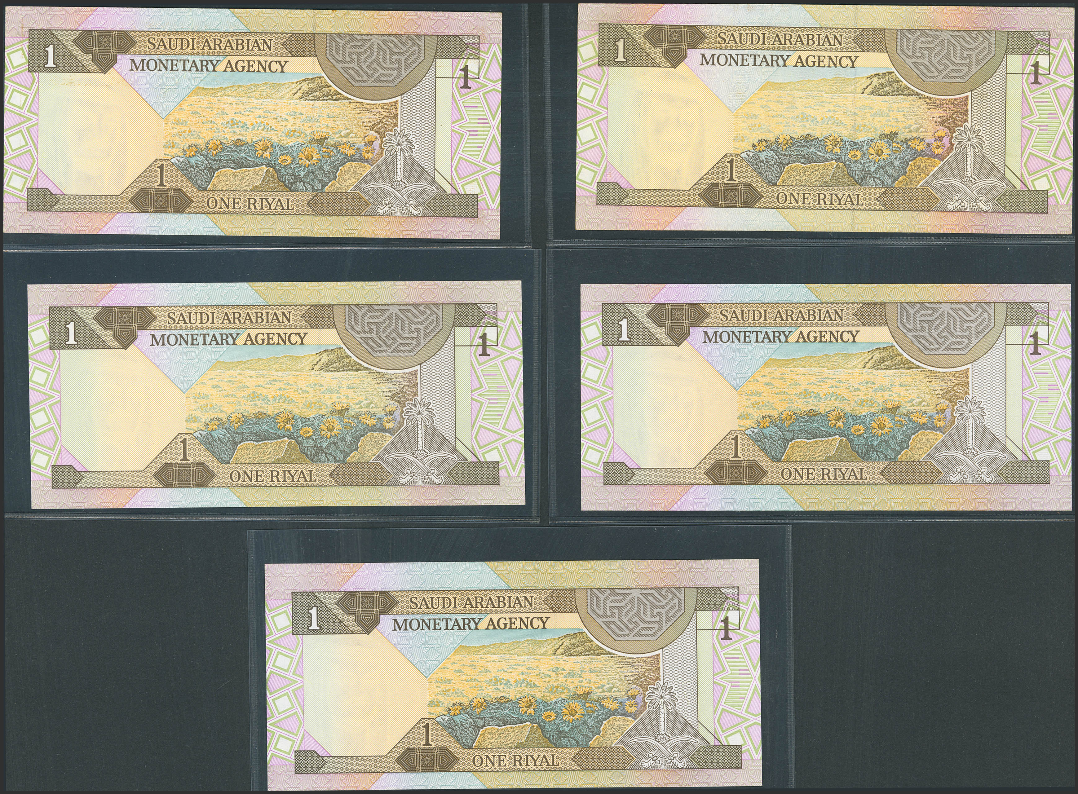 SAUDI ARABIA. Lot of 5 notes of 1 Riyal. 1961. Saudi Arabian Monetary Agency. Corrected text. (Pick: 21c(2), 21d(3)). Less than Uncirculated (1) / Uncirculated (4).
