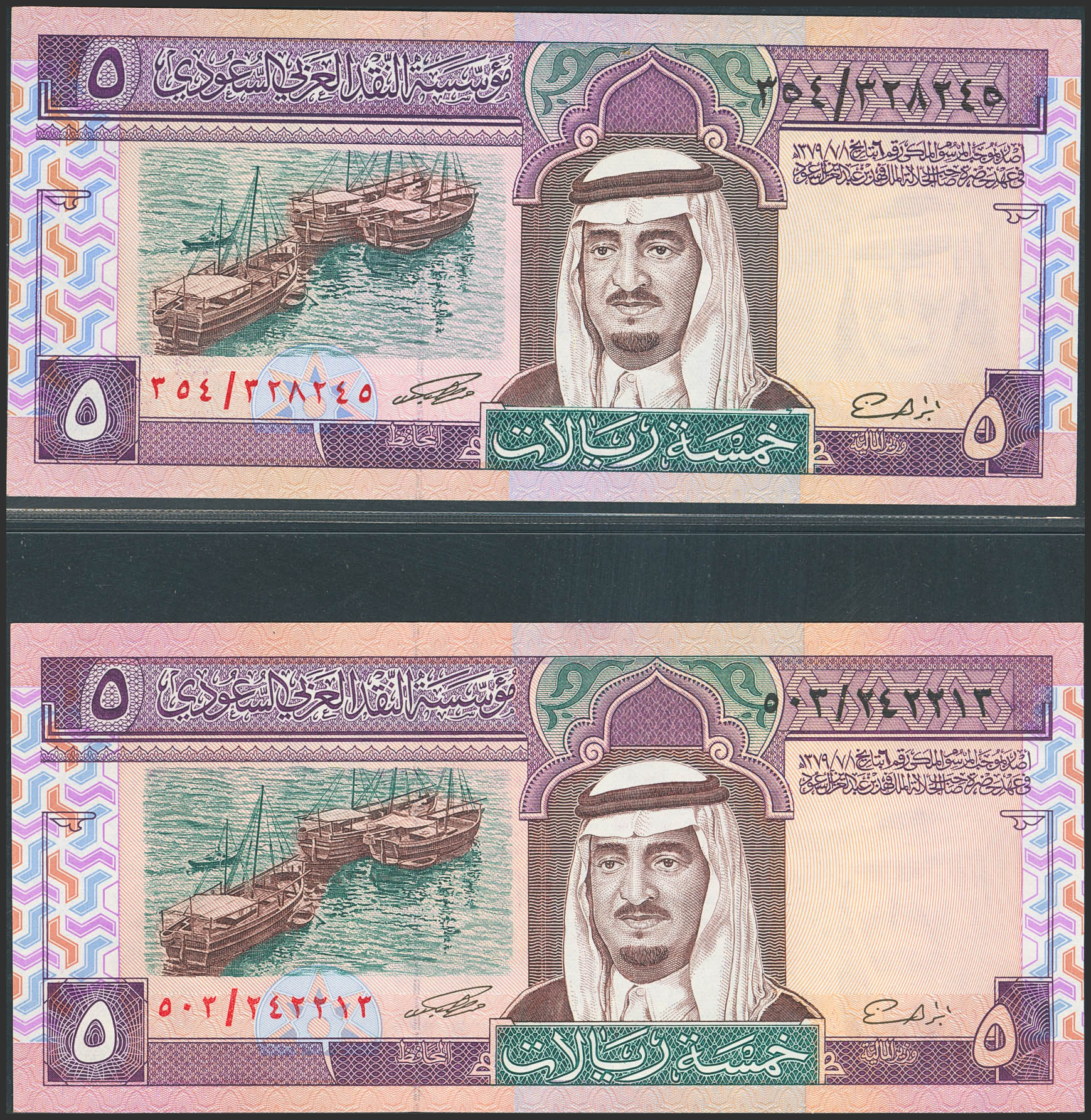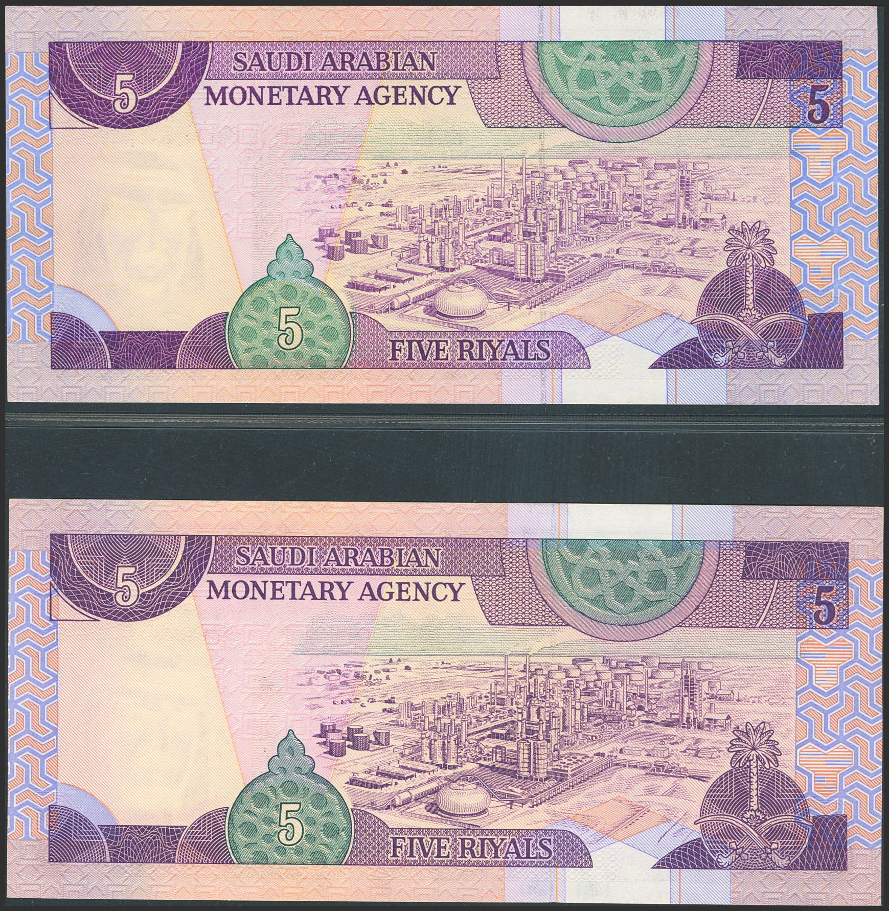 SAUDI ARABIA. Lot of 2 notes of 5 Riyals. 1961. Saudi Arabian Monetary Agency. Corrected text. (Pick: 22d). Less than Uncirculated and Almost Uncirculated.