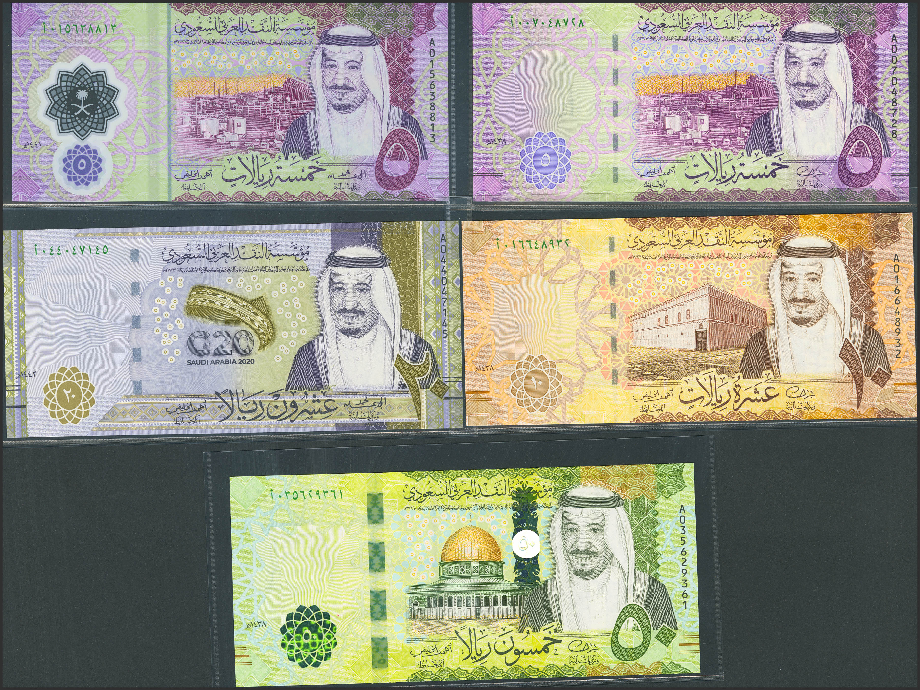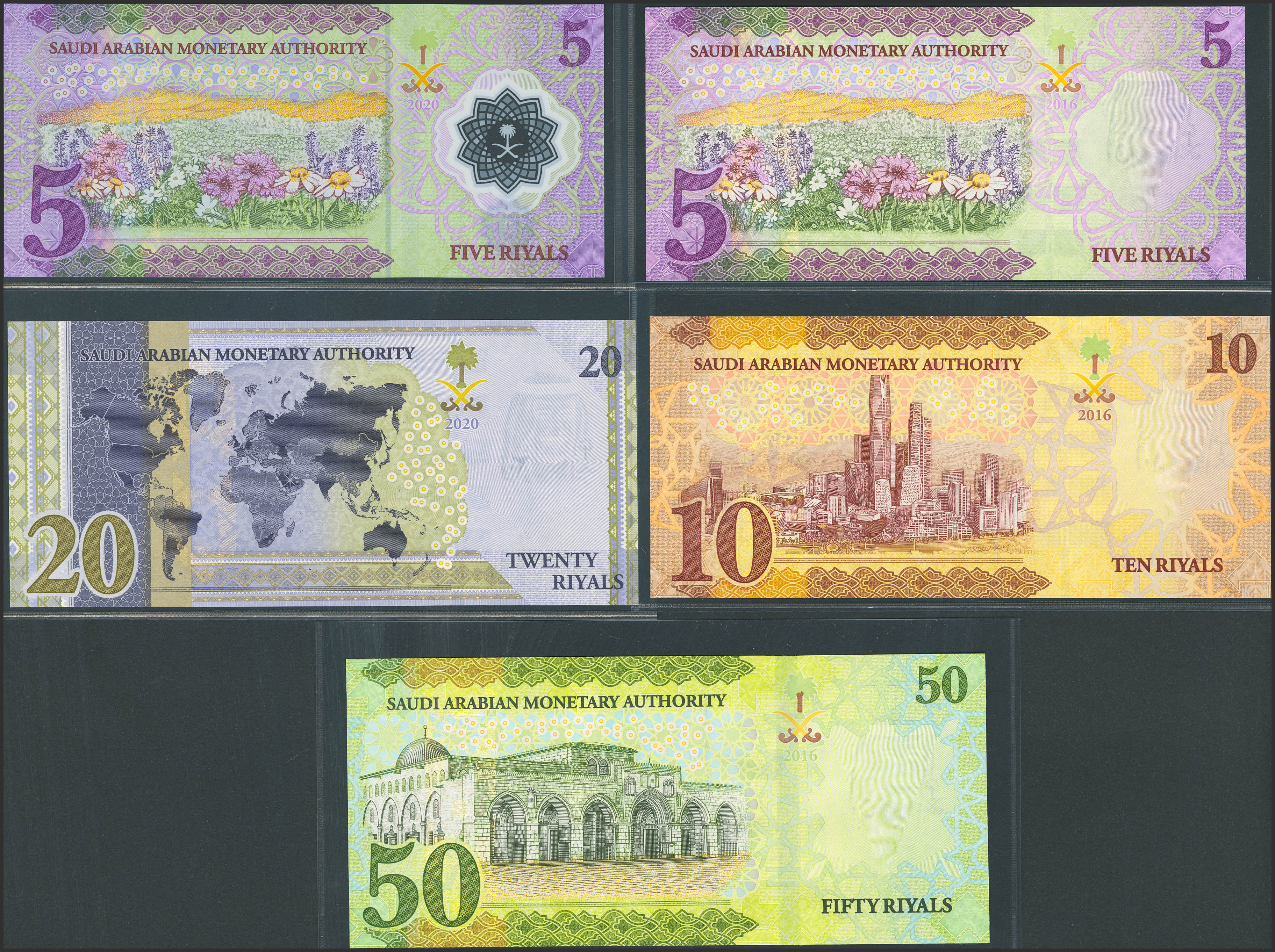 SAUDI ARABIA. Lot of 5 notes from 5-50 Riyals. 2016-2020. Saudi Arabian Monetary Agency. (Pick: 38a, 39a, 40a, 43, 44). Uncirculated.