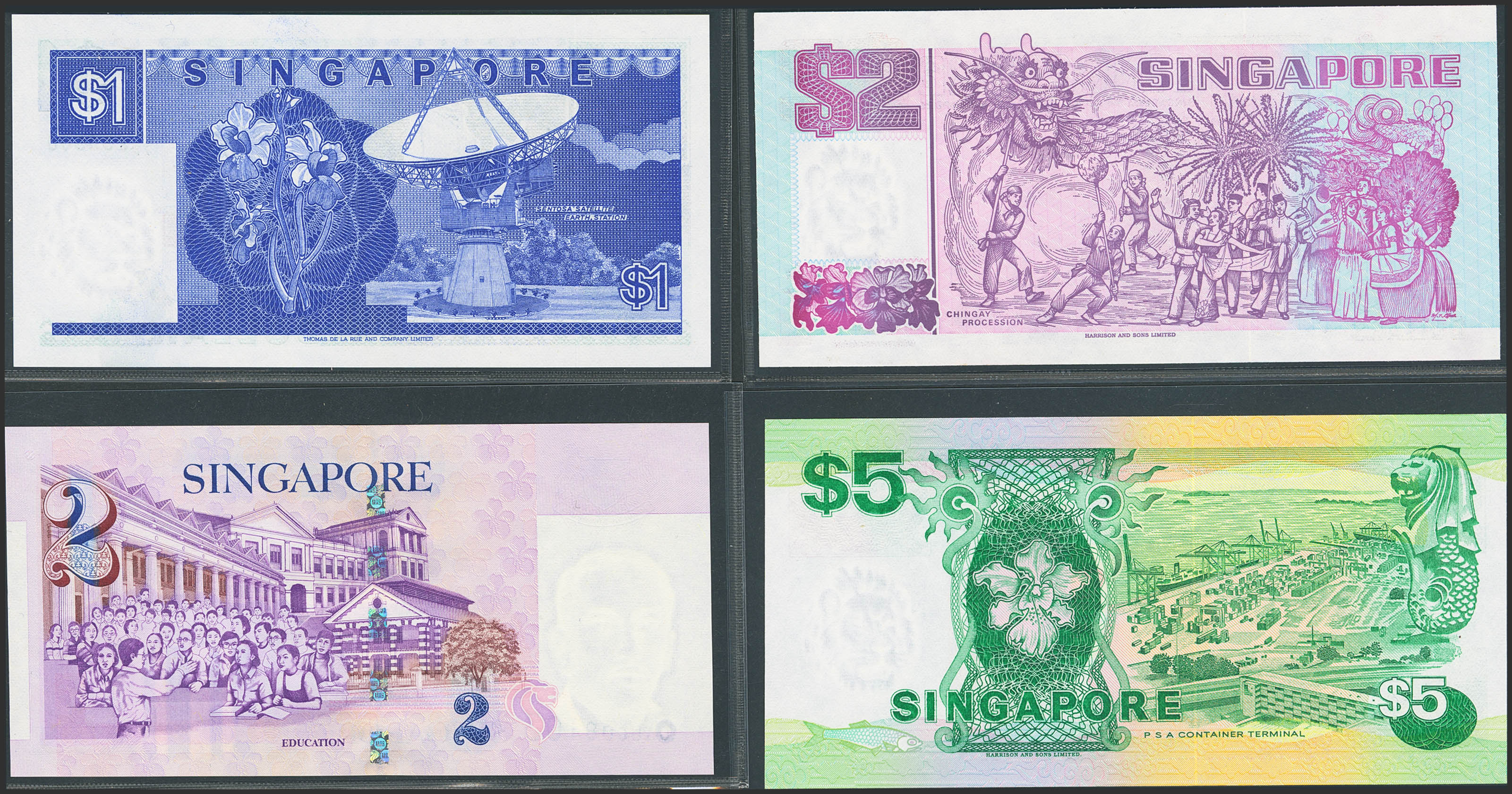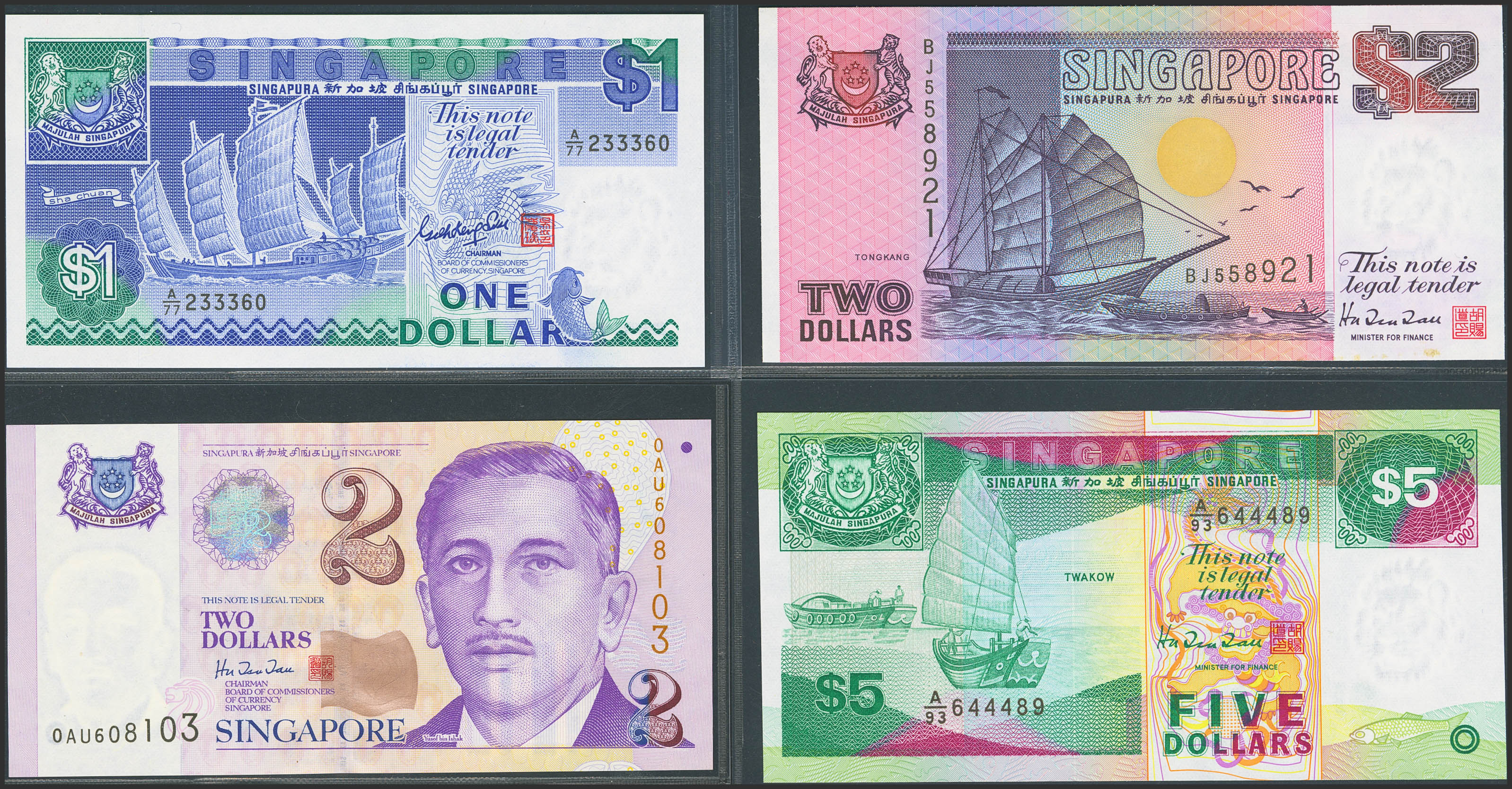 SINGAPORE. Lot of 4 notes of 1, 2 and 5 Dollars. 1987 to 1999. Board of Commissioners of Currency. (Pick: 18a, 34, 35, 38). Uncirculated.