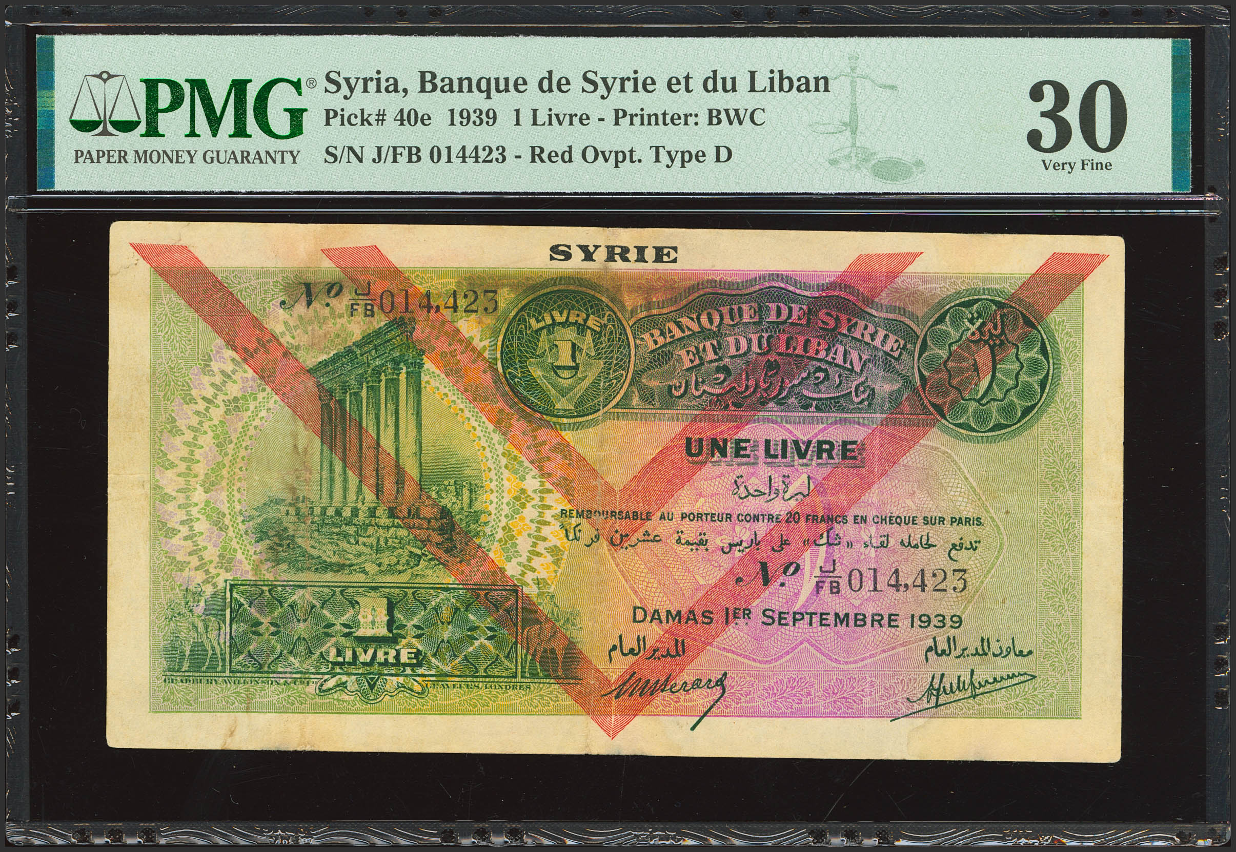 SYRIA. 1 Livre. 1 September 1939. Banque de Syrie et du Liban. (Pick: 40e). PMG30.