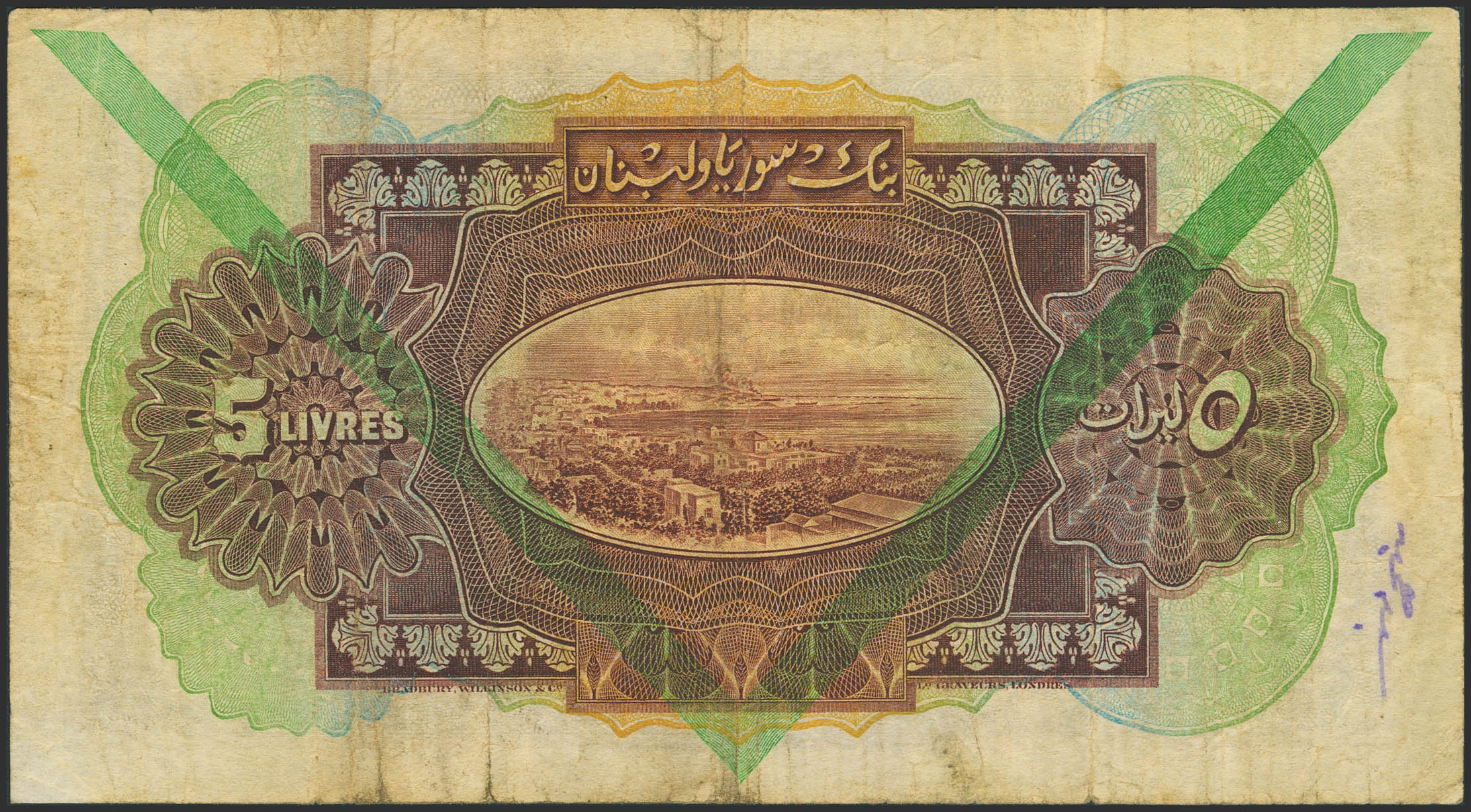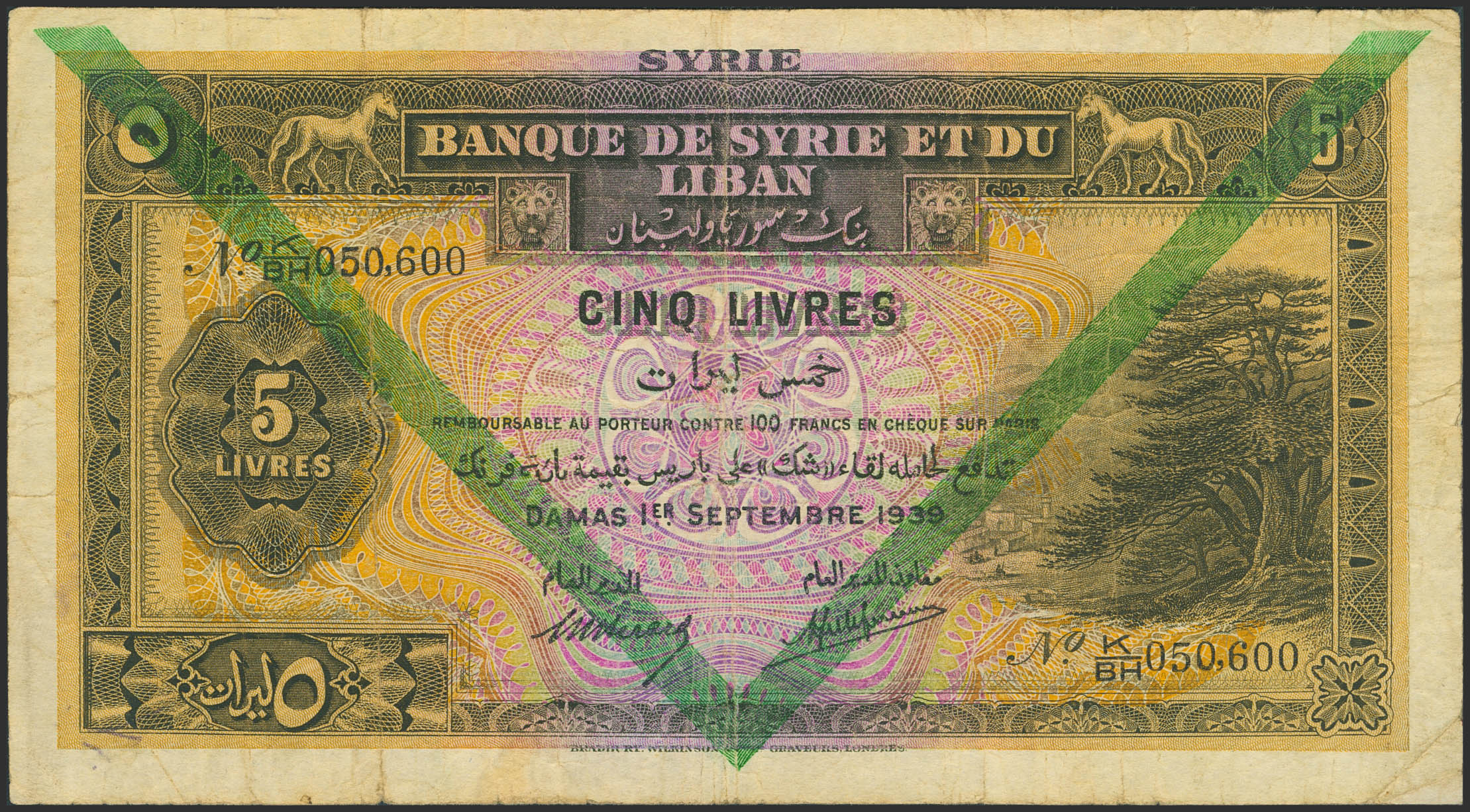 SYRIA. 5 Livres. 1 September 1939. Banque de Syrie et du Liban. (Pick: 41d). Fine / Very Fine.