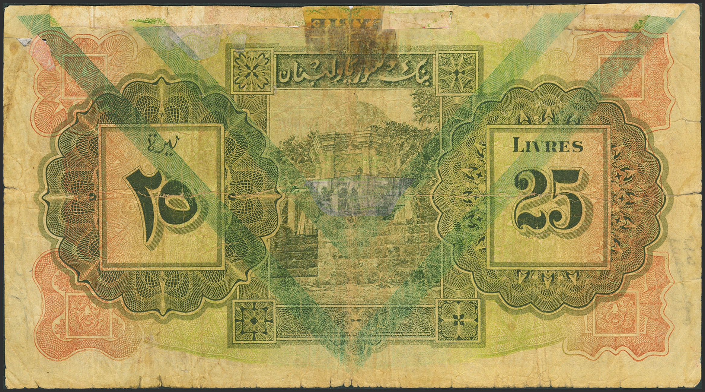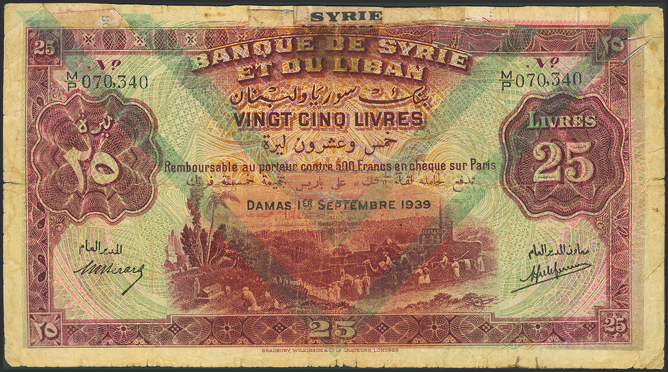 SYRIA. 25 Livres. 1 September 1939. Banque de Syrie et du Liban. (Pick: 43c). Very Good, reconstructed with added pieces from other banknotes.