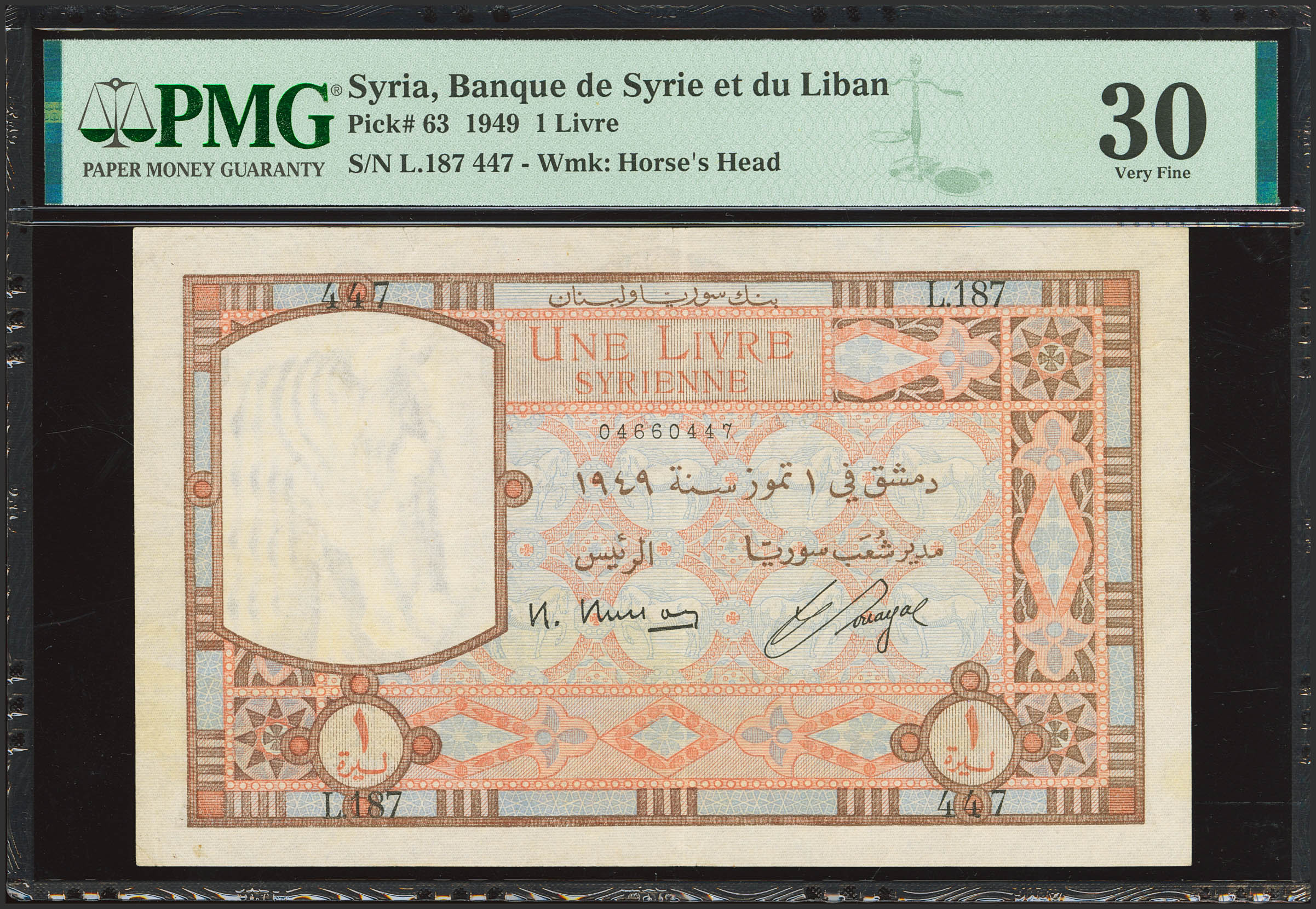 SYRIA. 1 Livre Syrienne. 1949. Banque de Syrie et du Liban. (Pick: 63). PMG30 (small tears).