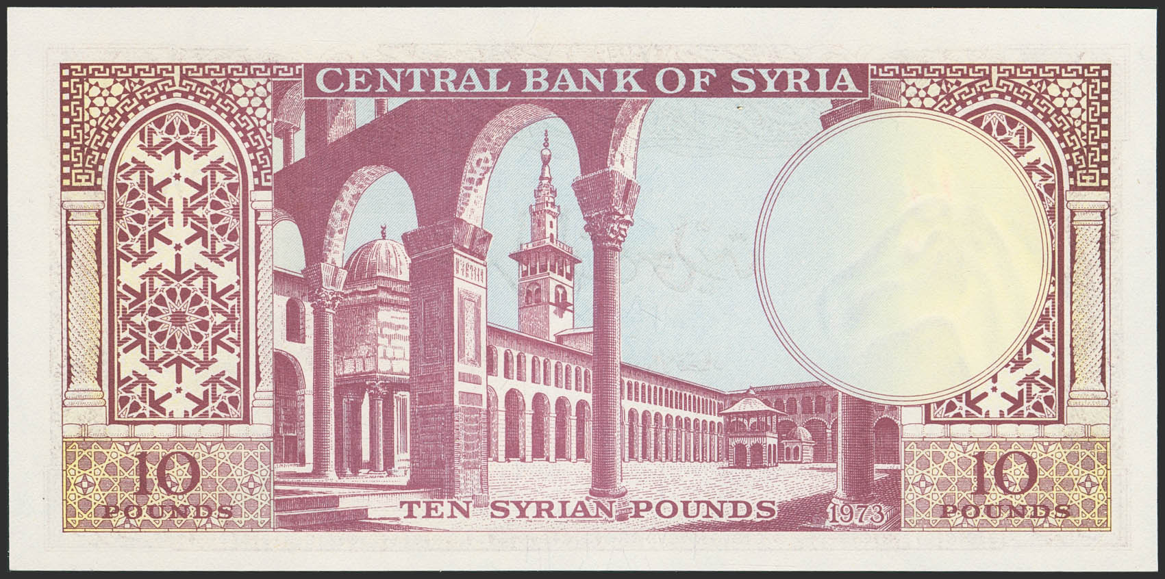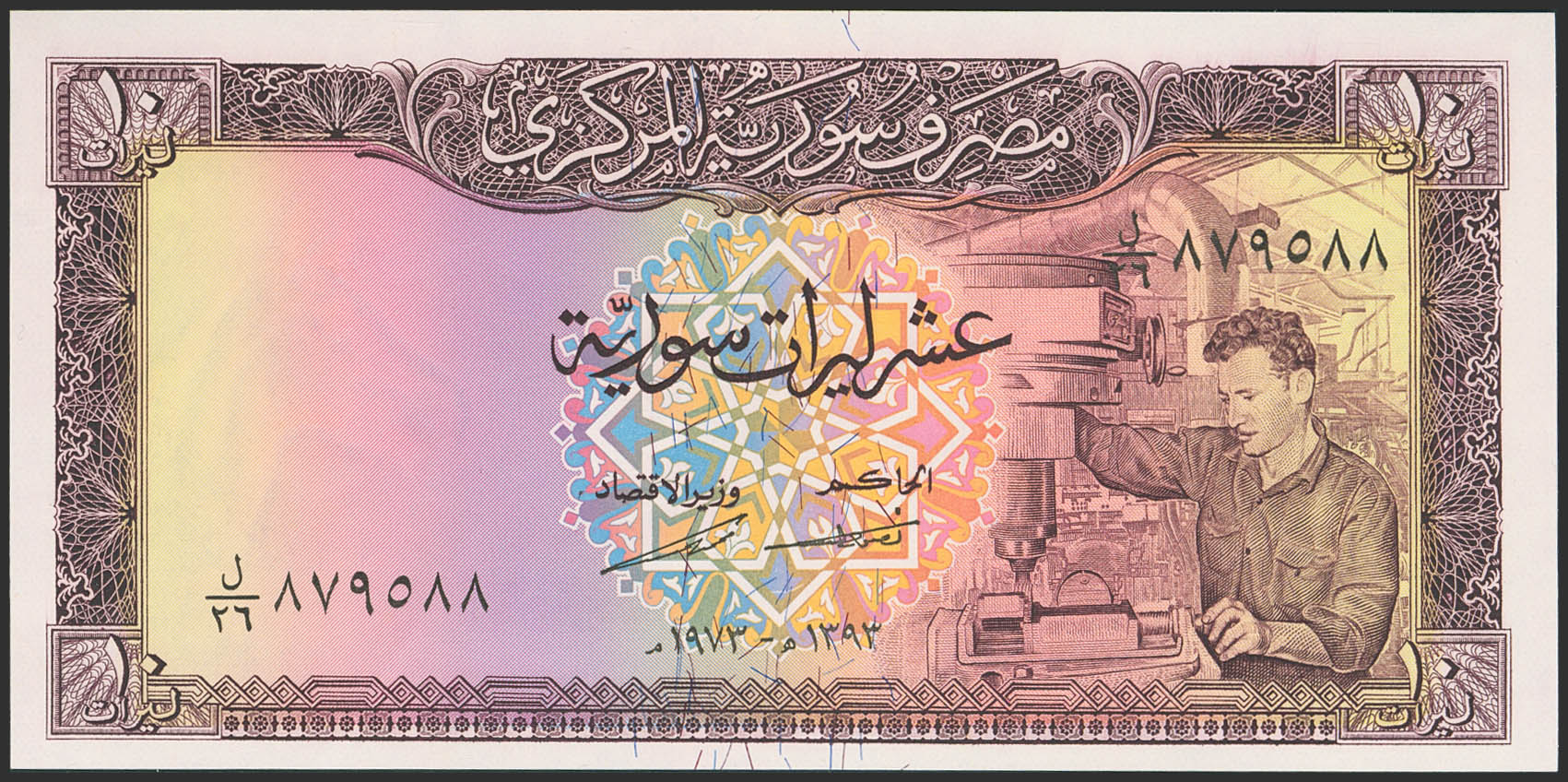 SYRIA. 10 Syrian Pounds. 1973. Central Bank. (Pick: 95c). 2 Count marks. Less than Uncirculated.