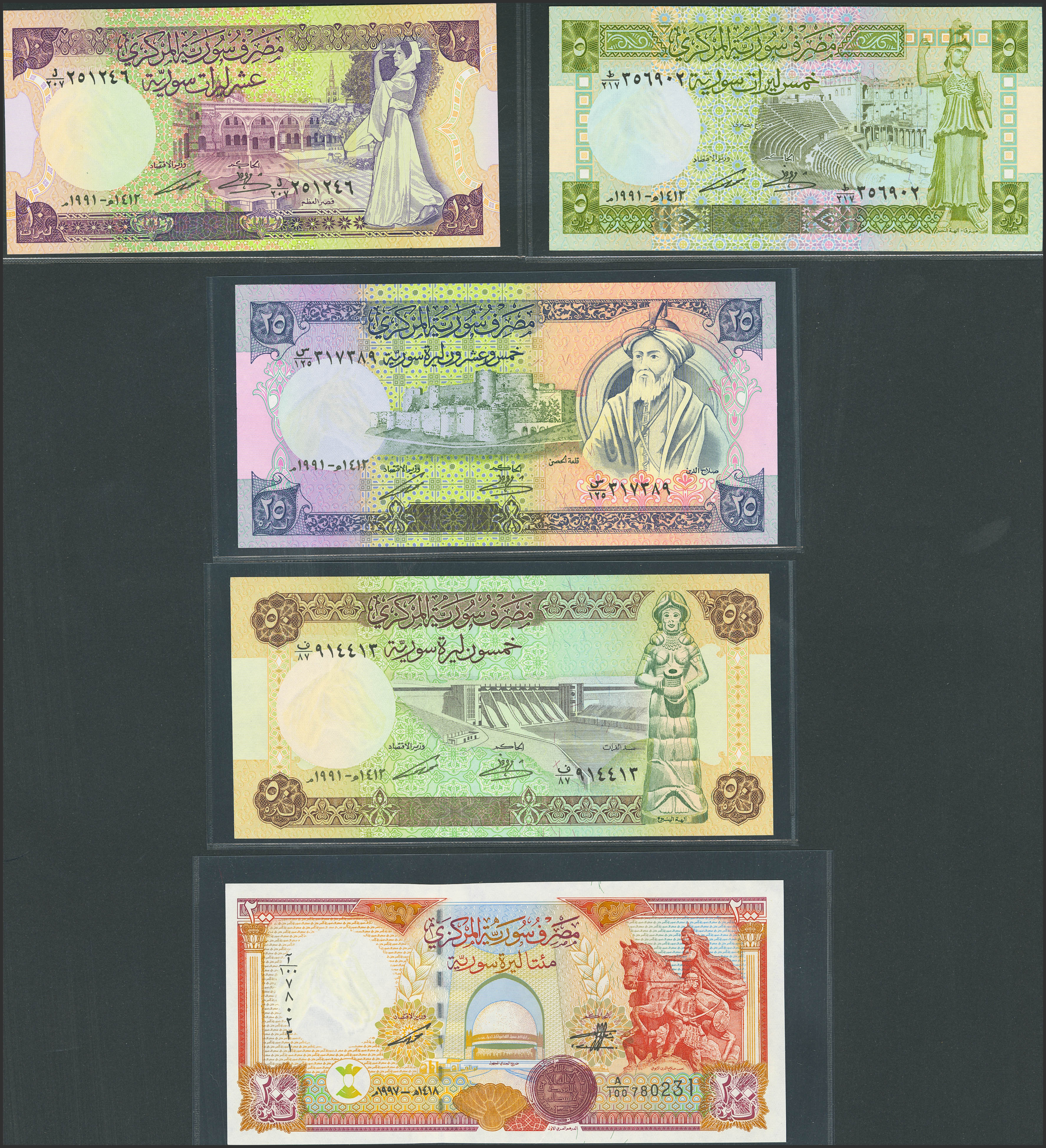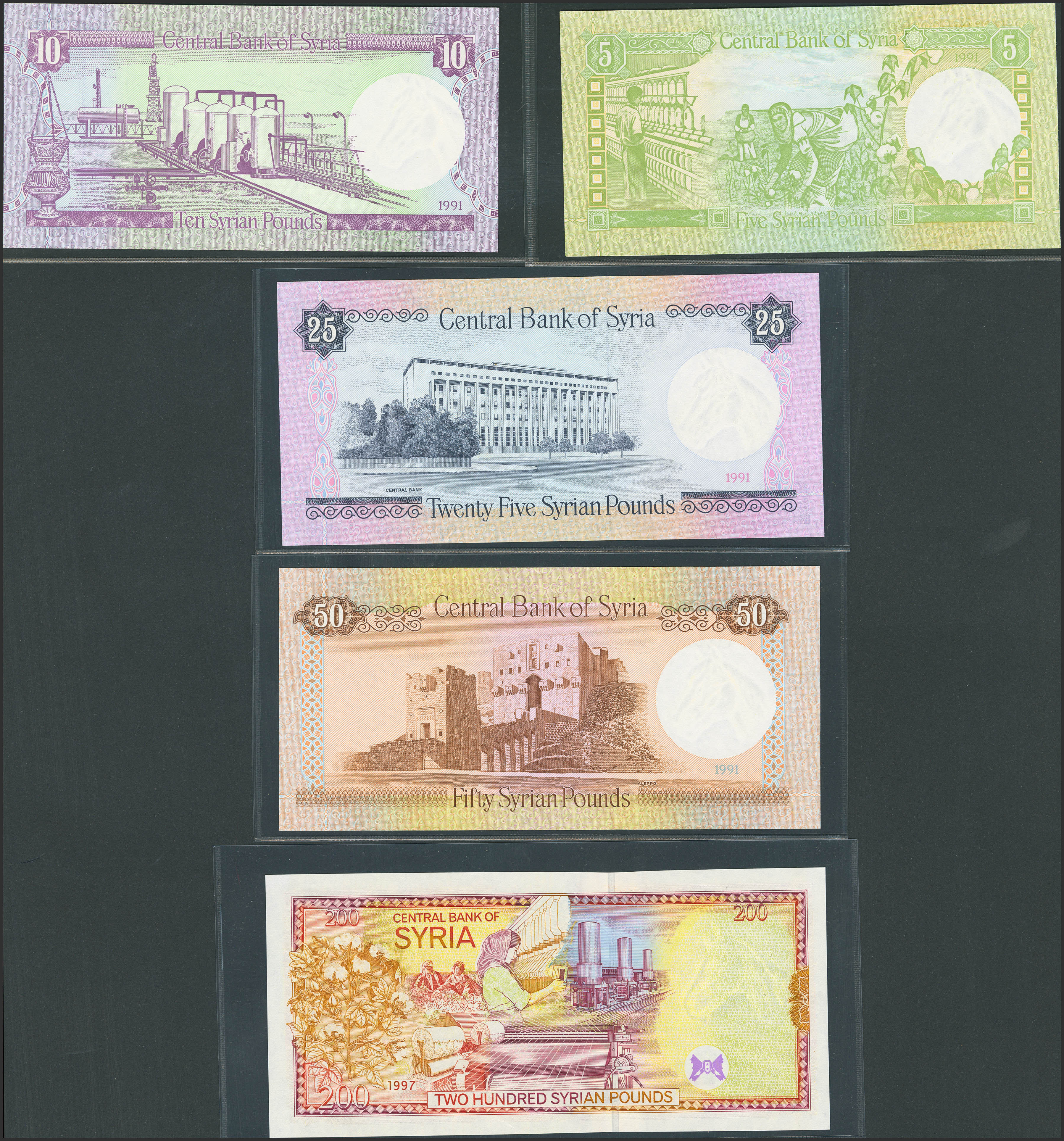 SYRIA. Lot of 5 notes from 5 at 200 Syrian Pounds. (1991ca). Central Bank. (Pick: 100e, 101e, 102e, 103e, 109). Uncirculated (4) and Less than Uncirculated (1).