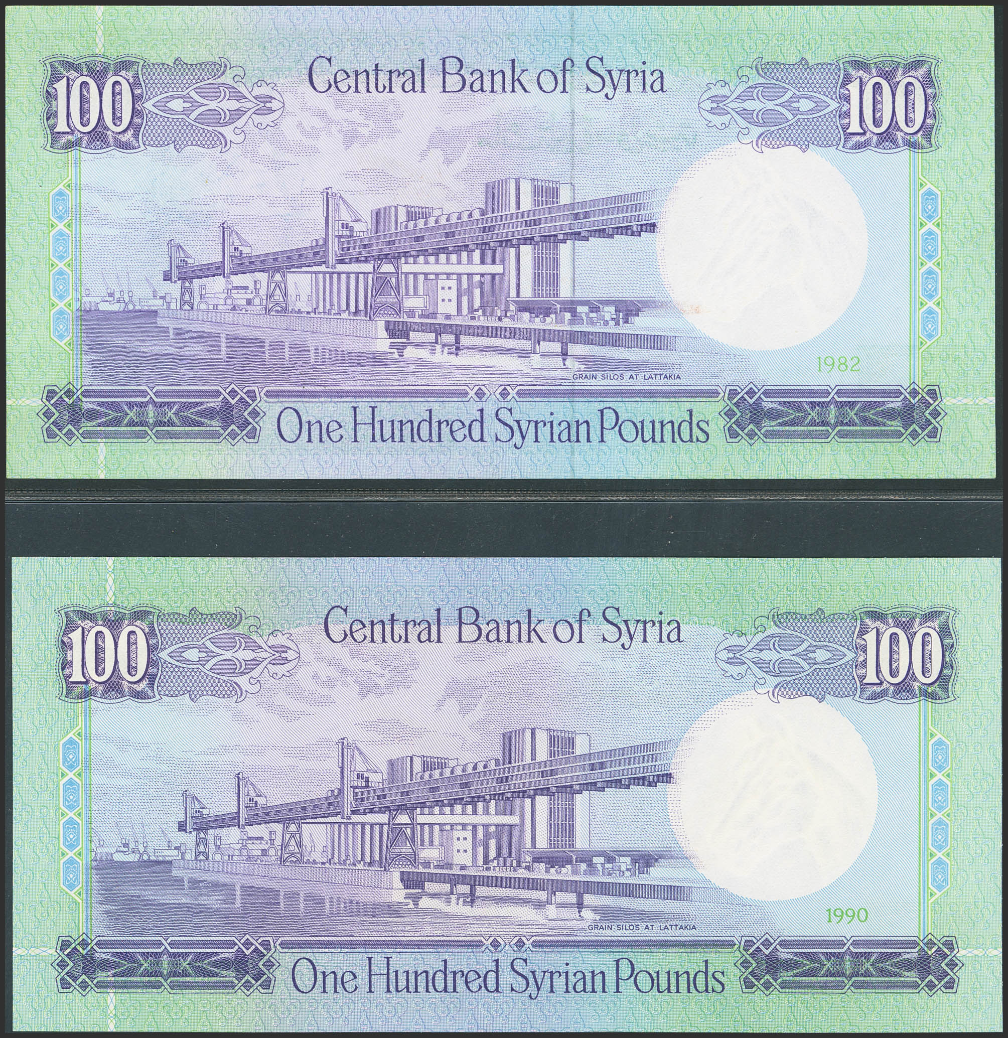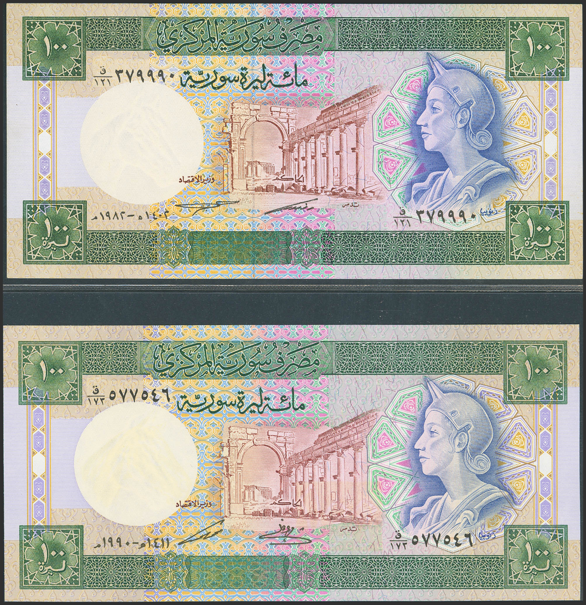 SYRIA. Lot of 2 notes of 100 Syrian Pounds. 1982 and 1990. Central Bank. (Pick: 104c, 104d). Uncirculated.