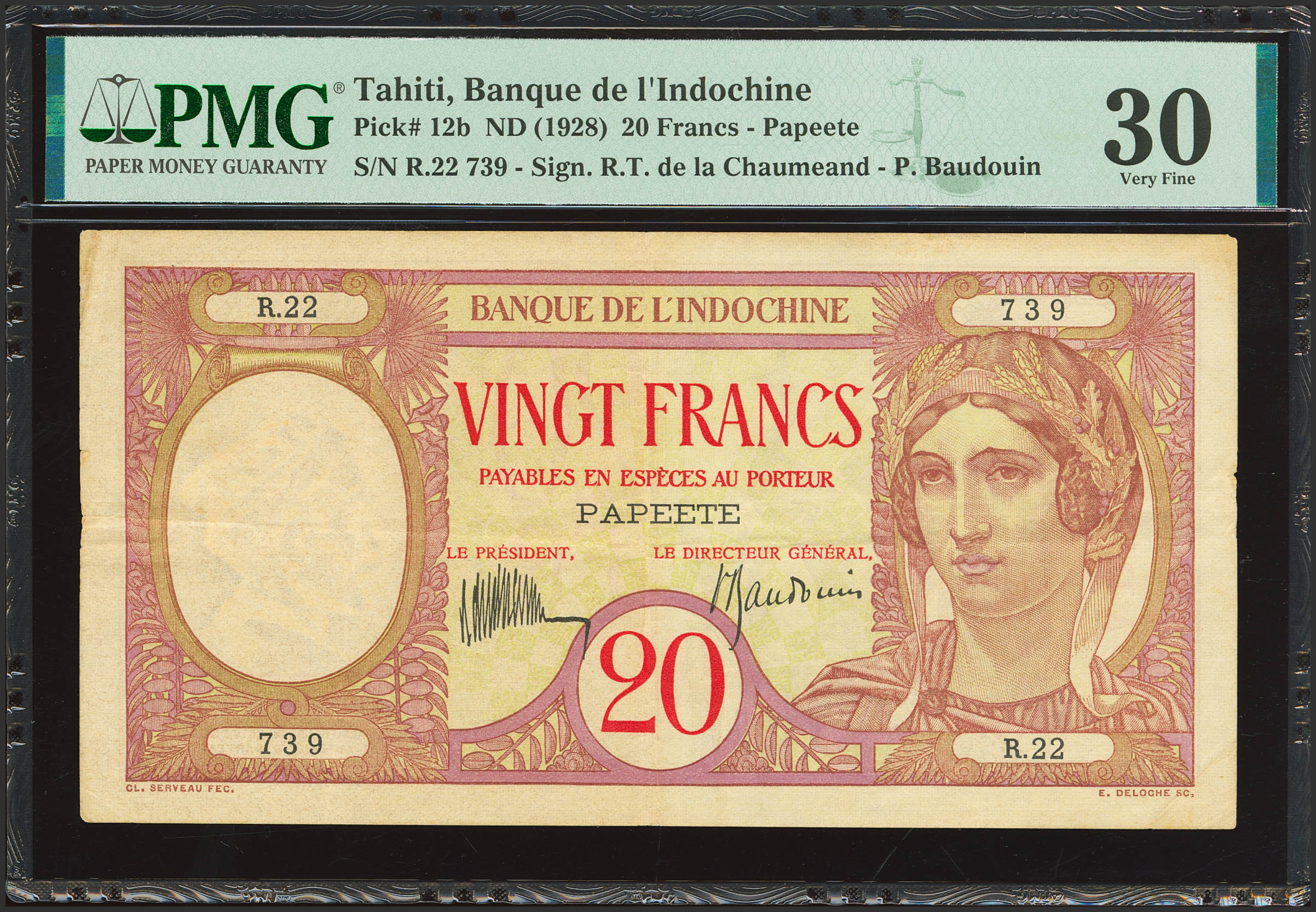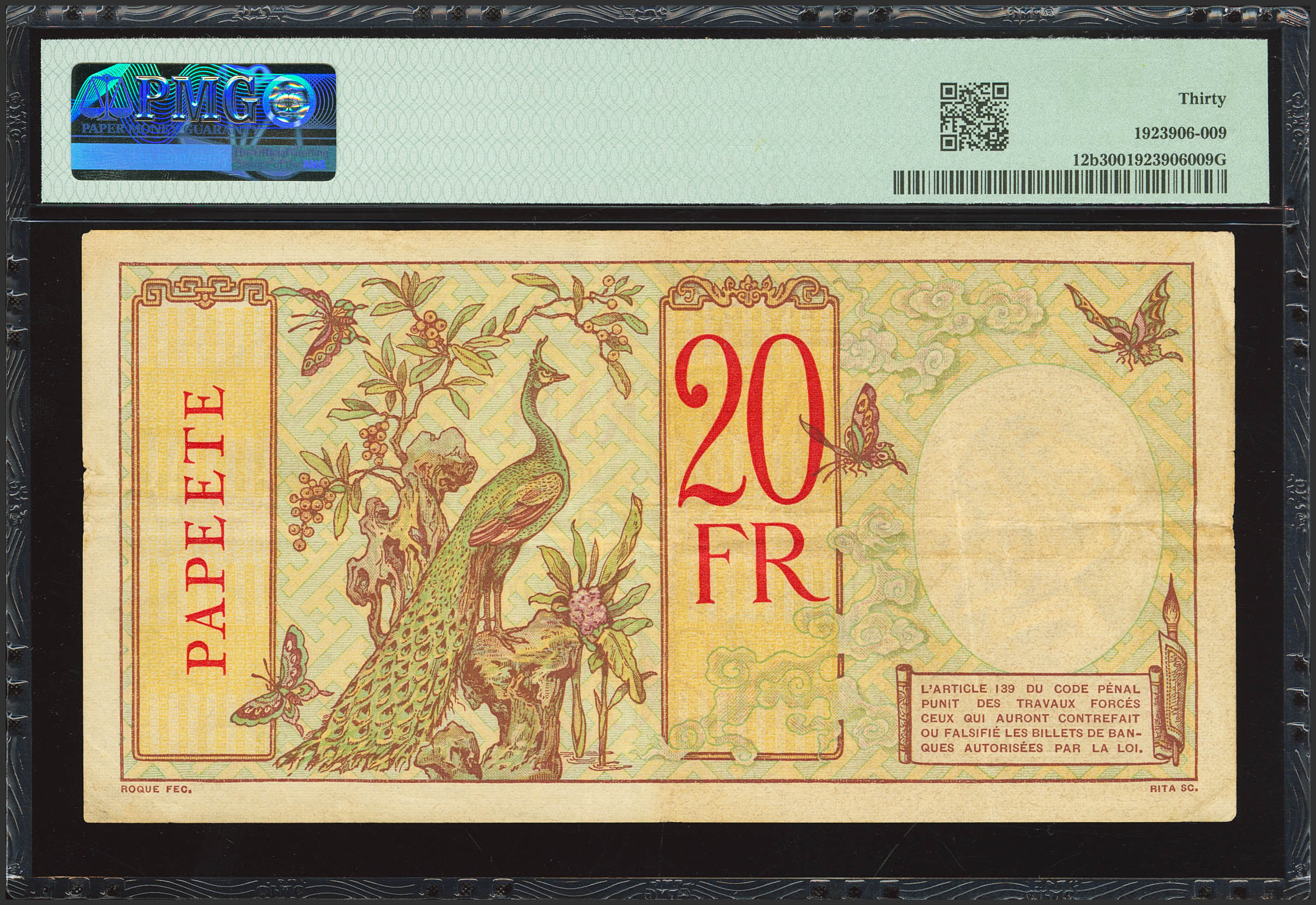 TAHITI. 20 Francs. (1928ca). Banque de L´Indochine, papeete. (Pick: 12b). PMG30.