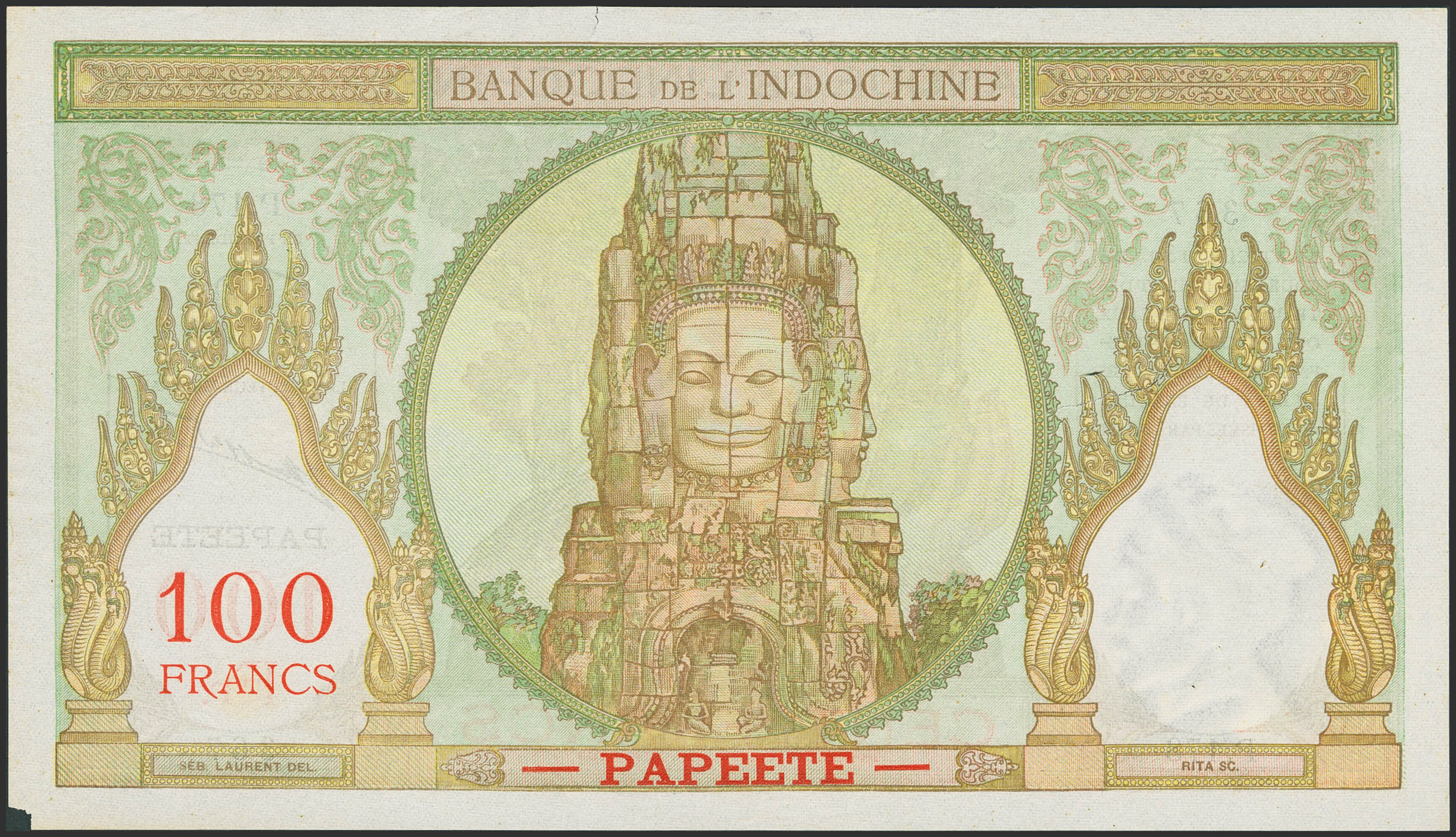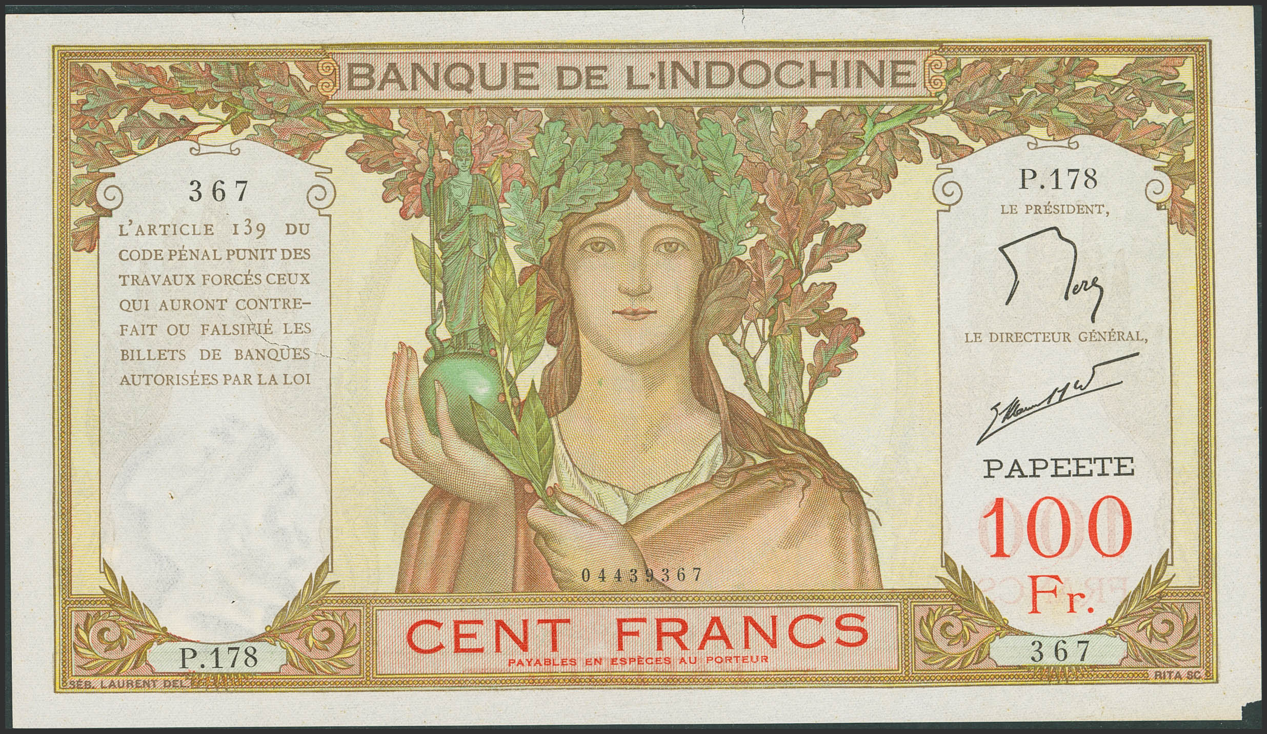 TAHITI. 100 Francs. (1939ca). Banque de L´Indochine, papeete. (Pick: 14d). About Uncirculated, 1.5 cm tear in the center of the banknote, pinholes, missing corner.